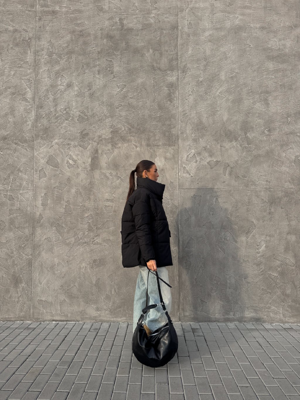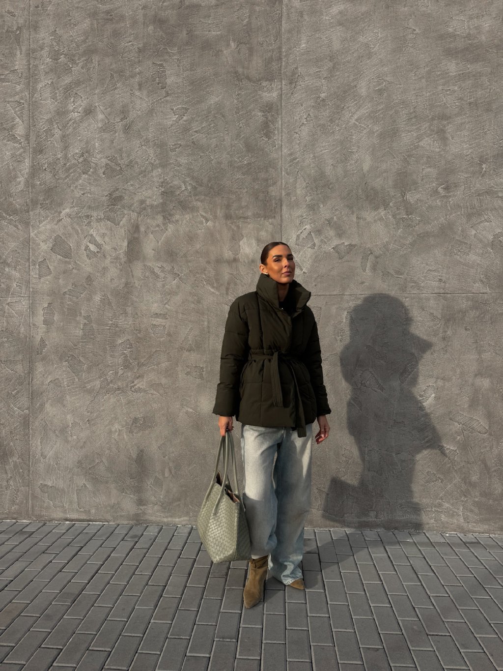 Teplá PUFF bunda s vysokým límcem, rovný užší střih, zapínání na cvoky, boční kapsy, podšívka, rukávy ukončené pružným patentem, pásek ze stejného materiálu.