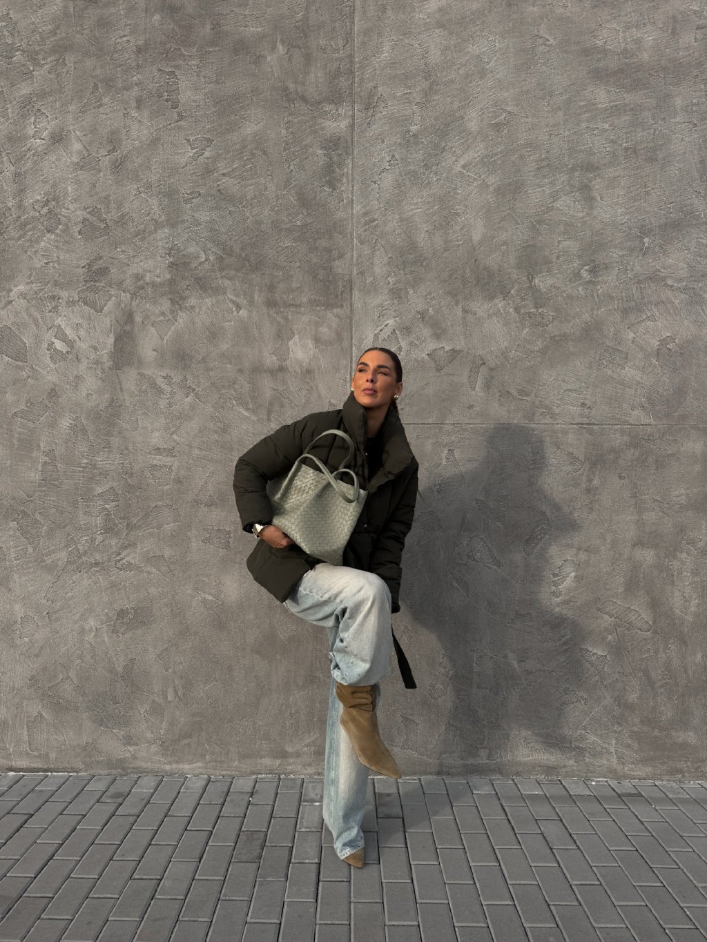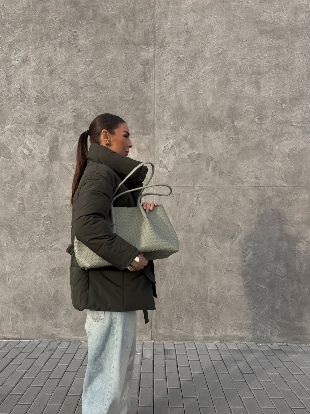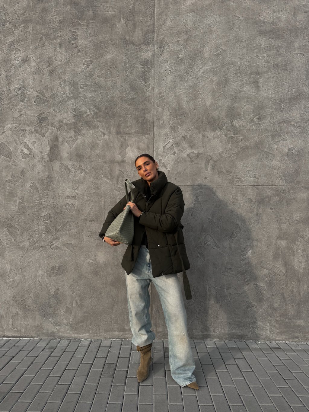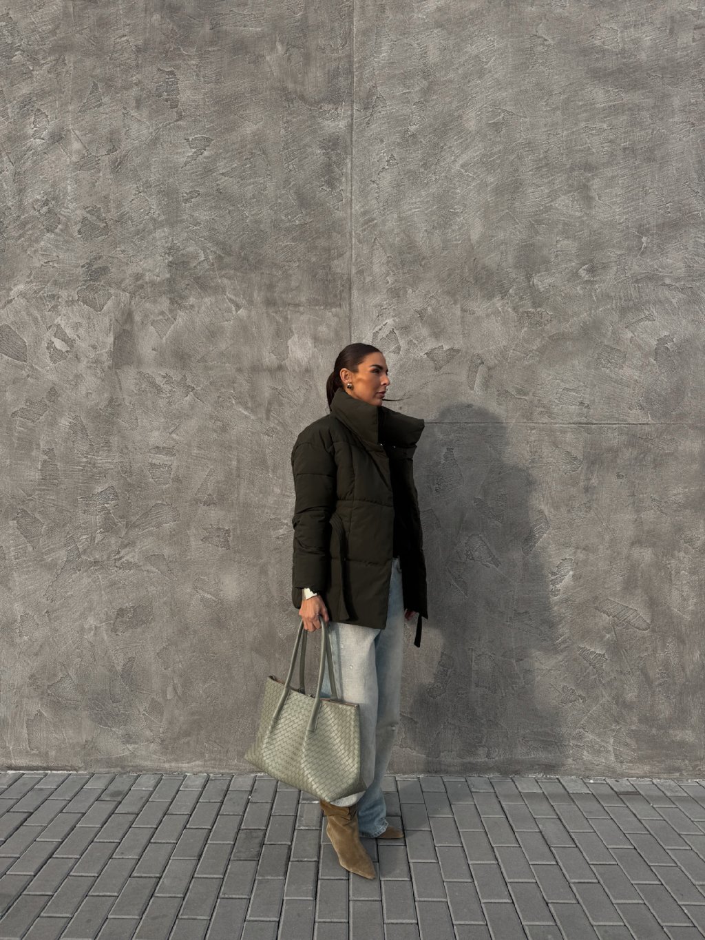 Teplá PUFF bunda s vysokým límcem, rovný užší střih, zapínání na cvoky, boční kapsy, podšívka, rukávy ukončené pružným patentem, pásek ze stejného materiálu.