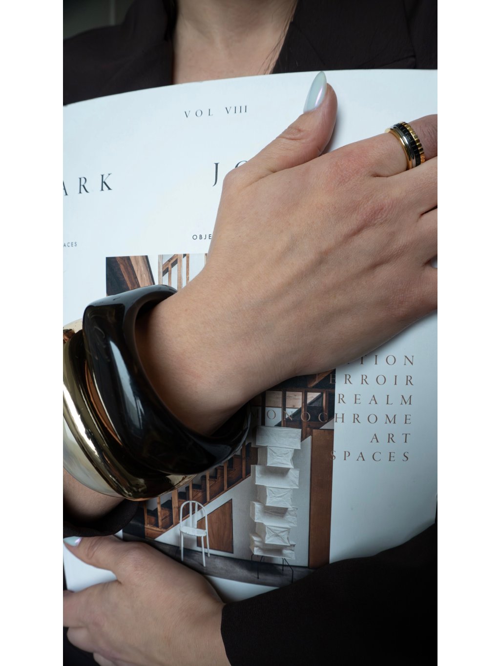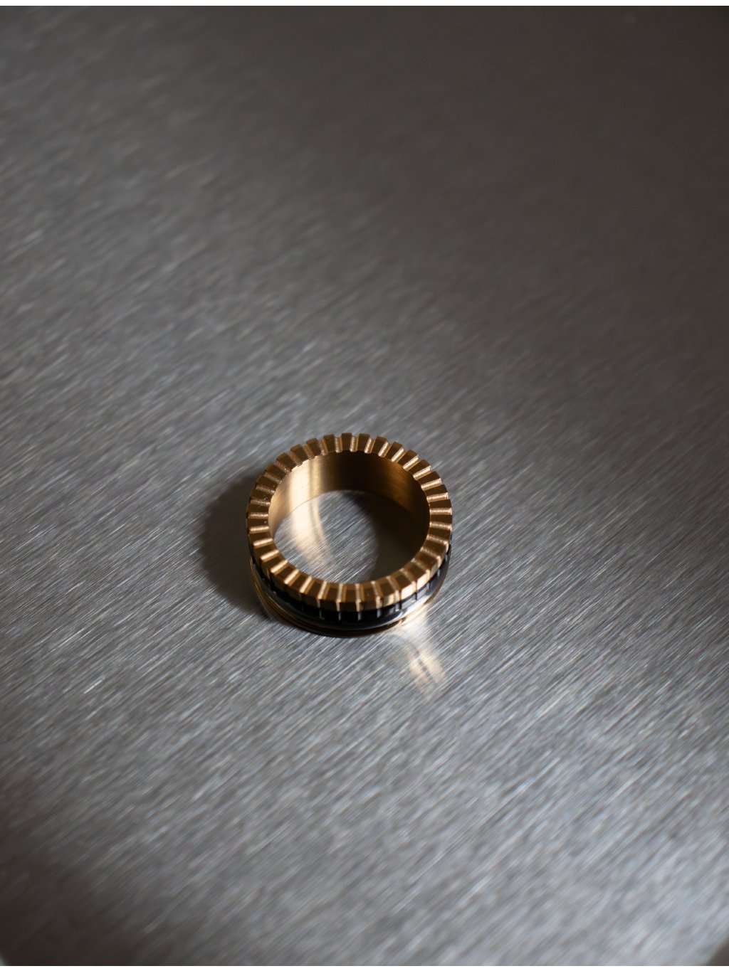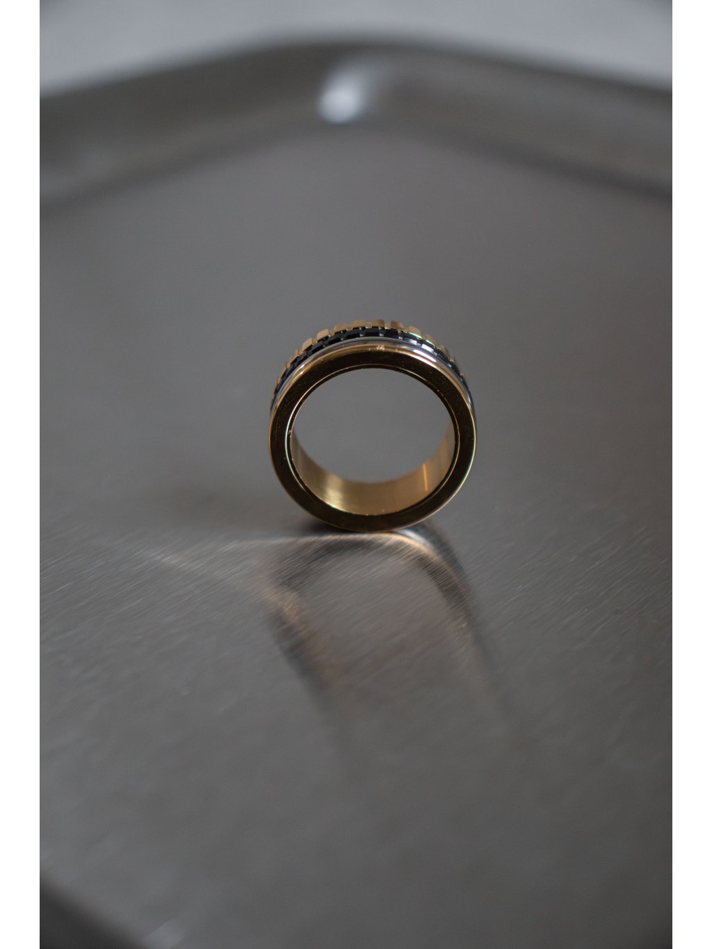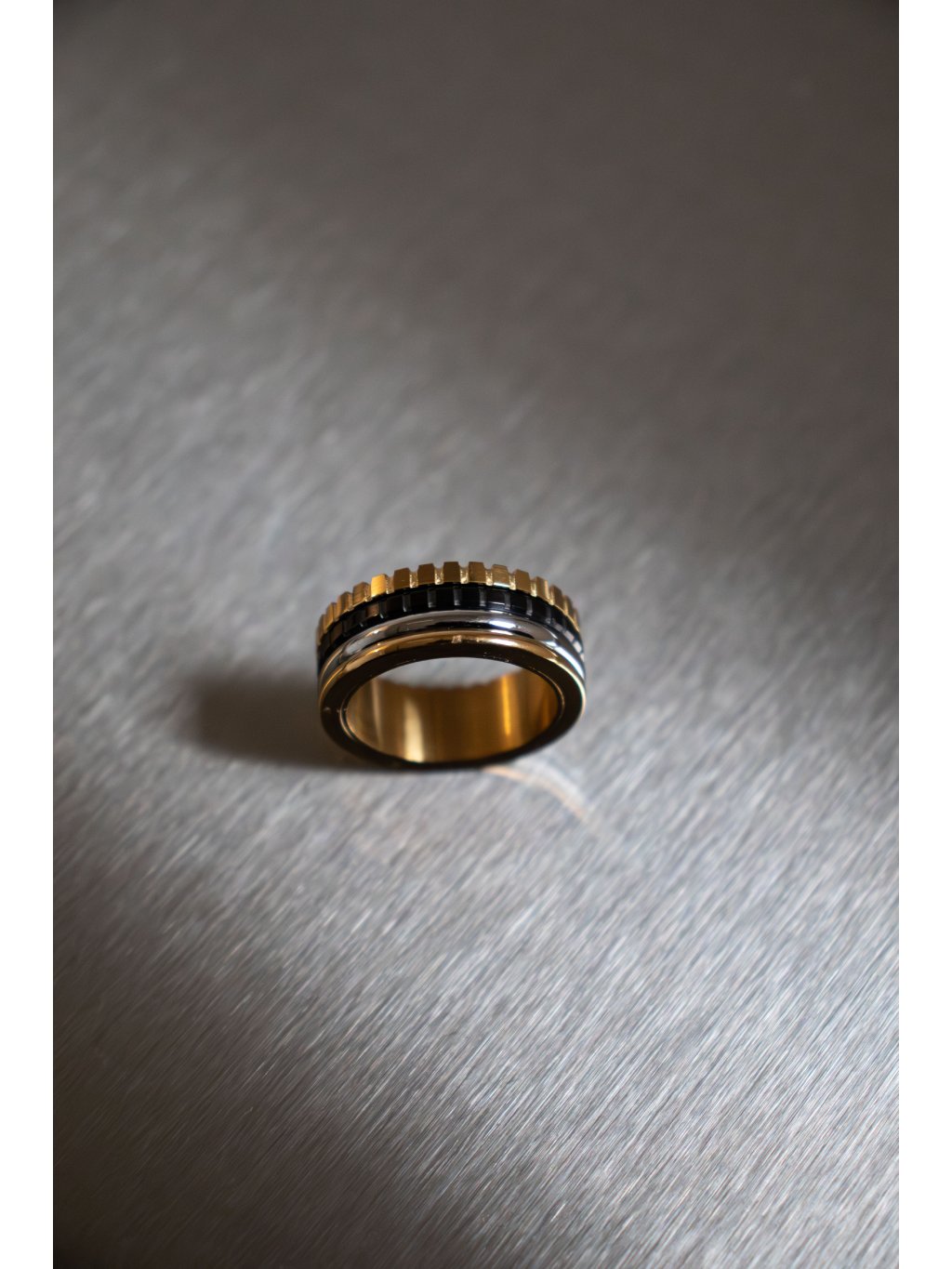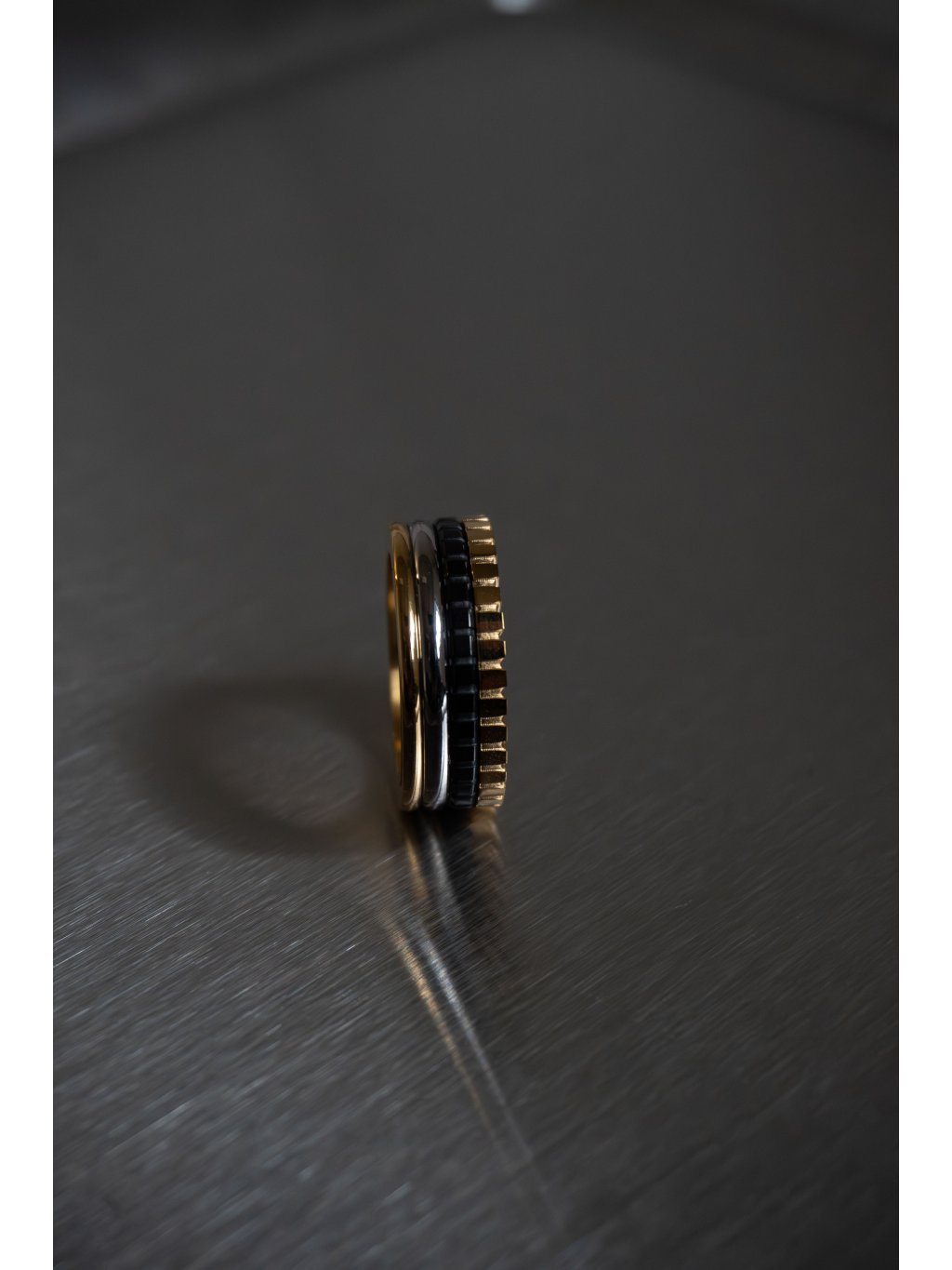 Vrstvený kovový prsten s hrubou i hladkou strukturou, kombinace barev - zlatá, stříbrná, černá.