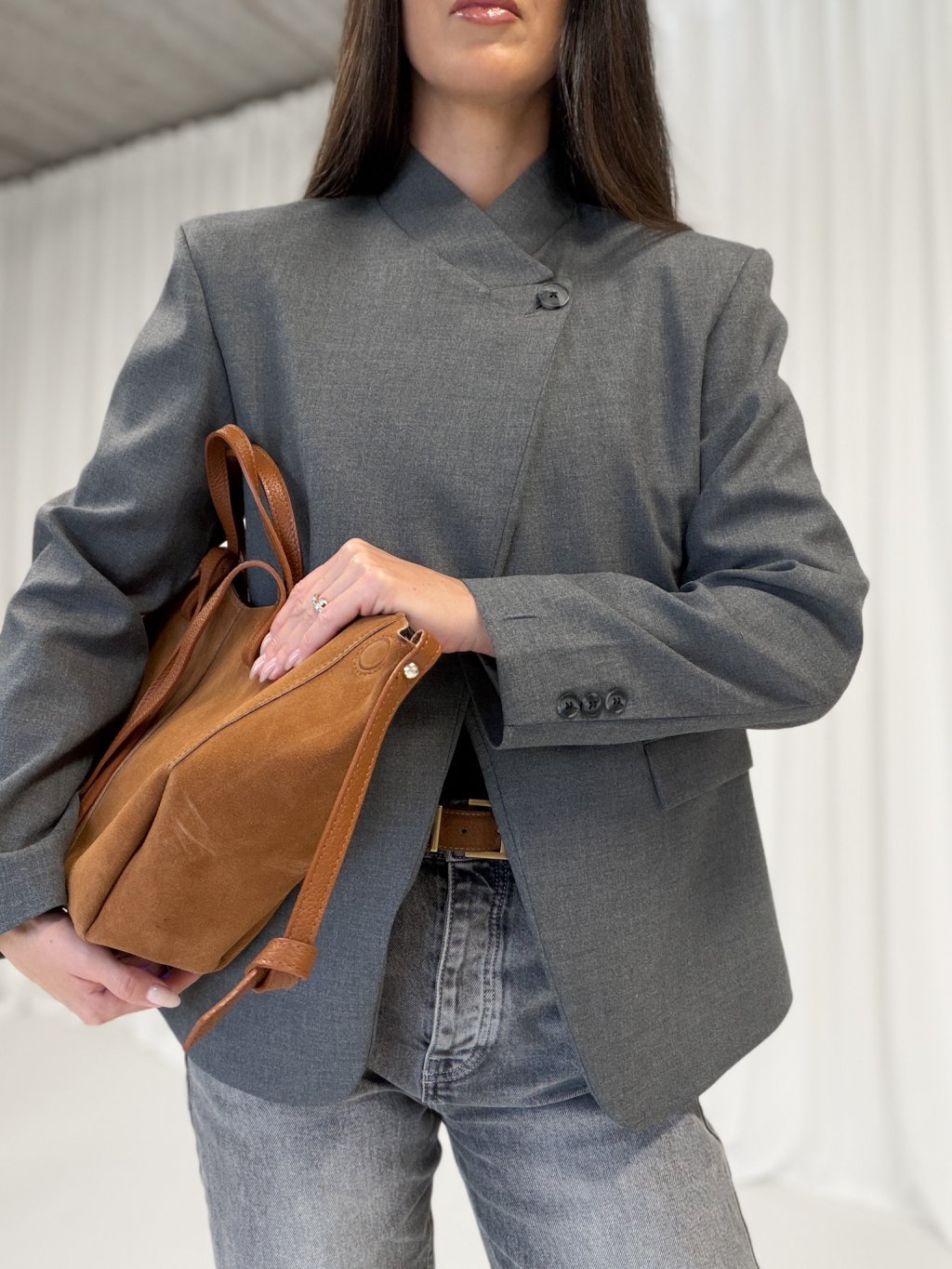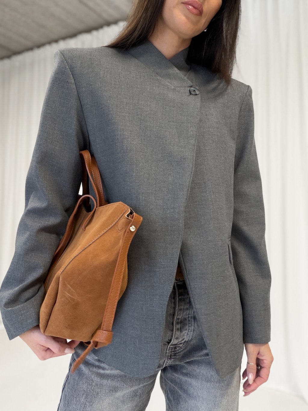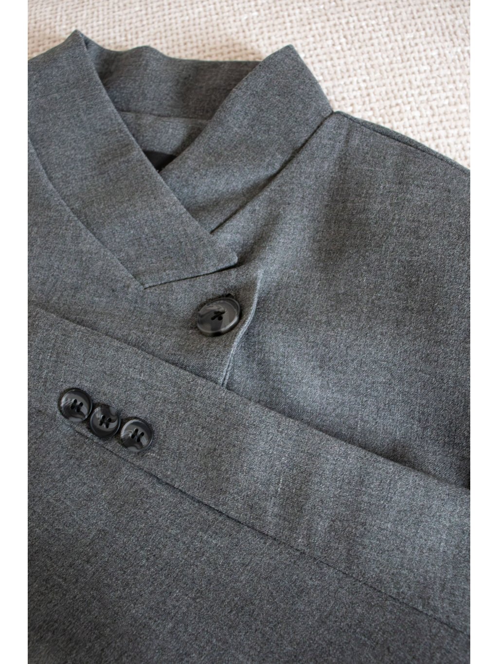 Sako volnějšího střihu se stojáčkem, přední kapsy s klopami, šikmo střižená přední část saka se zapínáním na jeden knoflík u krku. Ramenní vycpávky, podšívka, vzadu rozparek.