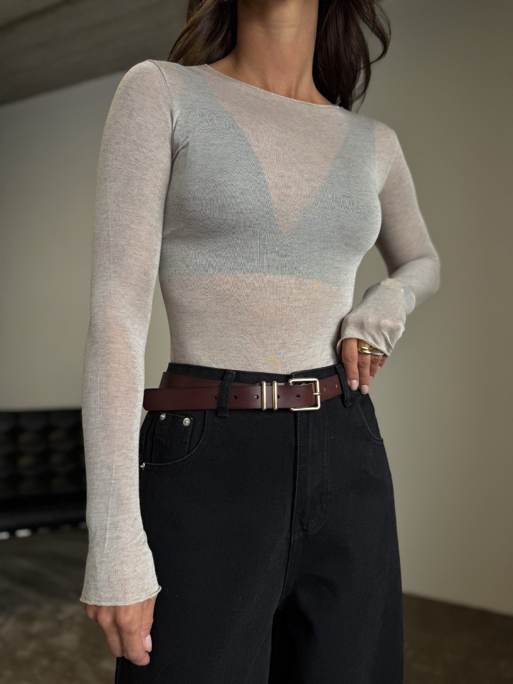Lehké triko s dlouhým rukávem, pružný, příjemný, měkký, lehce prosvítá. Přírodní materiál s elastanem a podílem kašmíru.