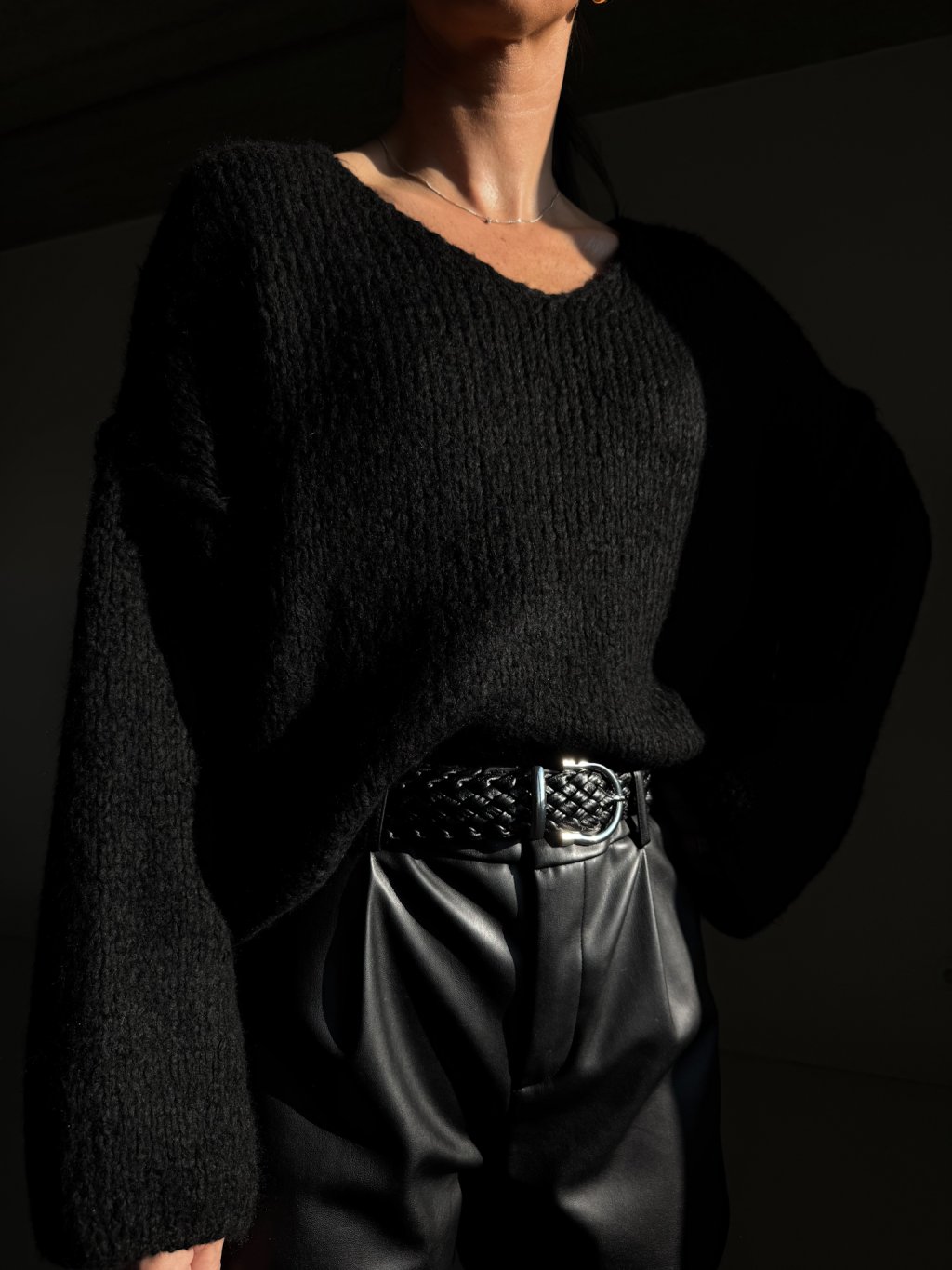 Měkký svetr oversized střihu, délka do pasu, výrazný šev u ramen, široké spadené rukávy, výstřih do "V". Svetr je hutný, zahřeje.
