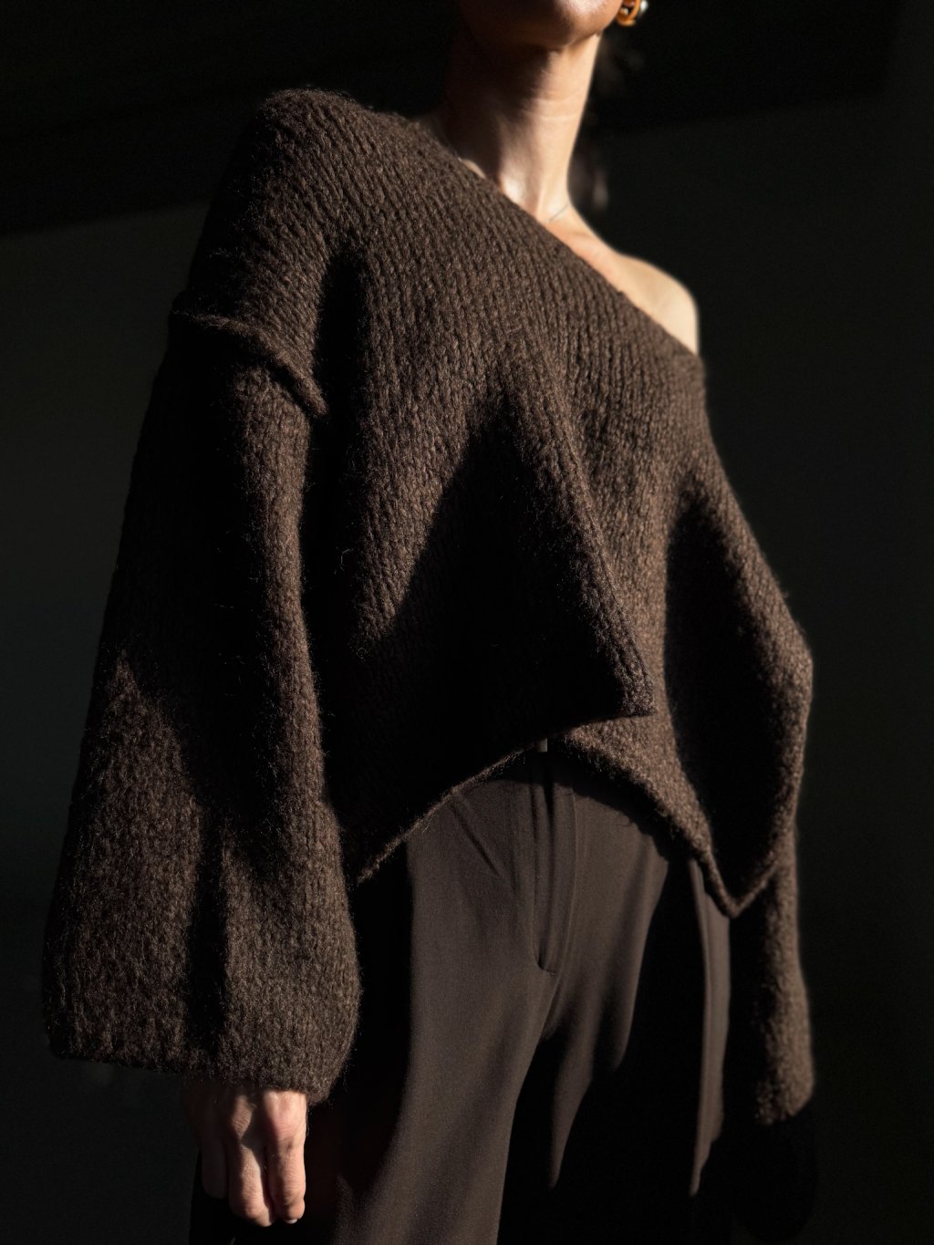 Měkký svetr oversized střihu, délka do pasu, výrazný šev u ramen, široké spadené rukávy, výstřih do "V". Svetr je hutný, zahřeje.
