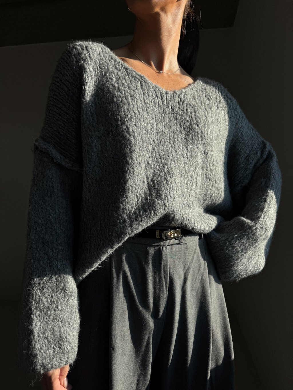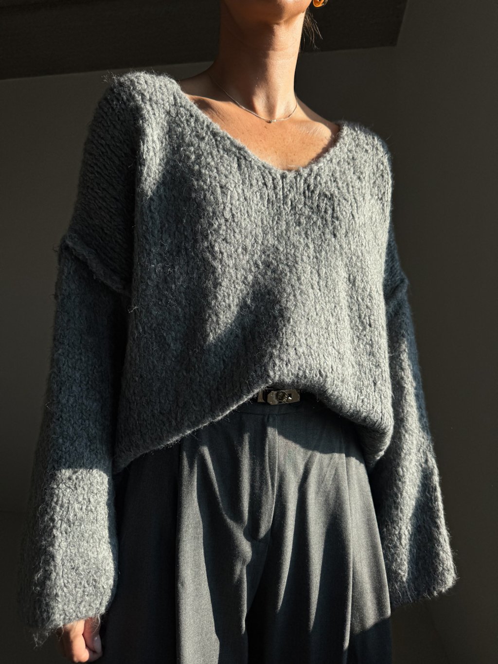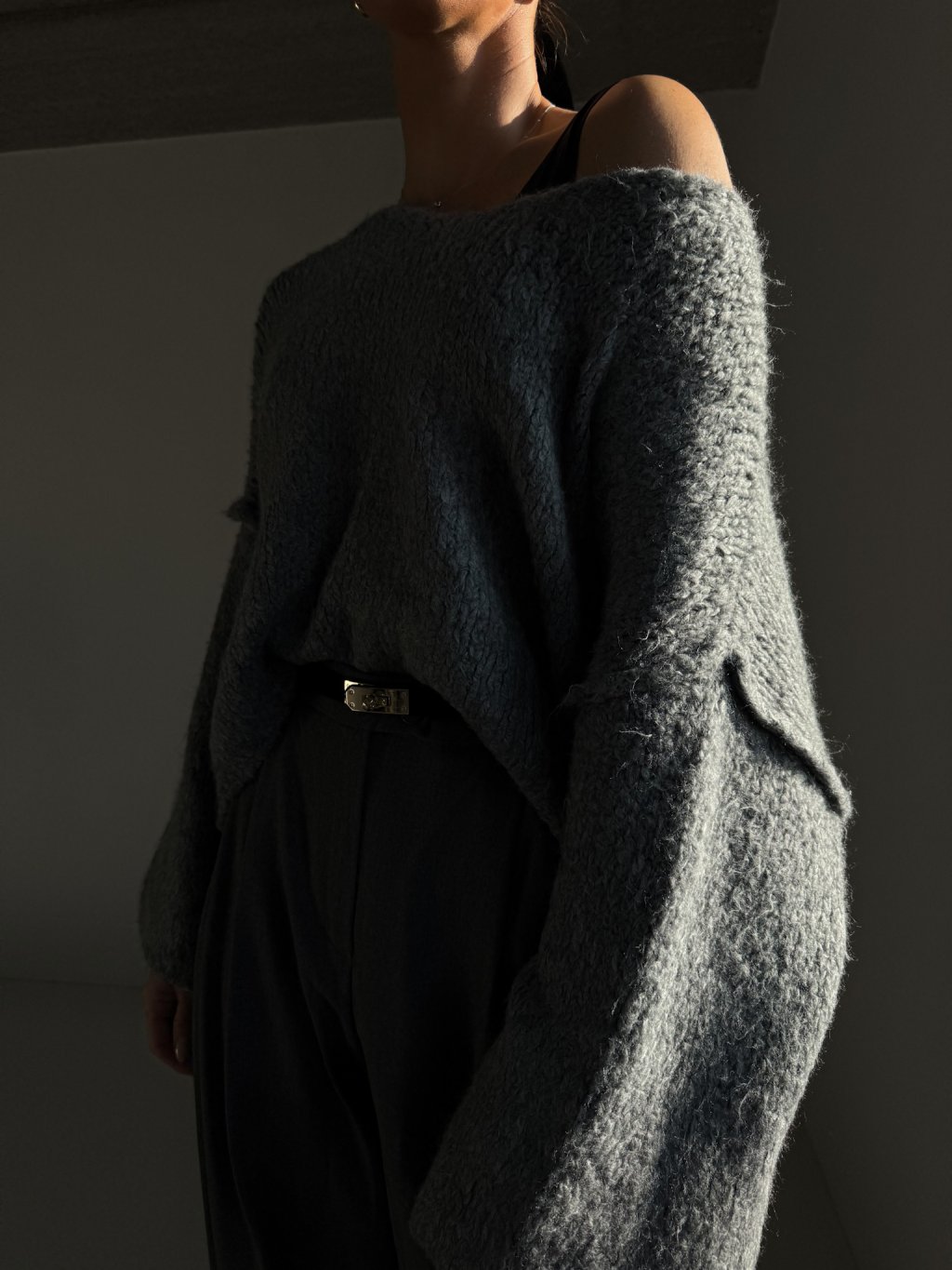 Měkký svetr oversized střihu, délka do pasu, výrazný šev u ramen, široké spadené rukávy, výstřih do "V". Svetr je hutný, zahřeje.