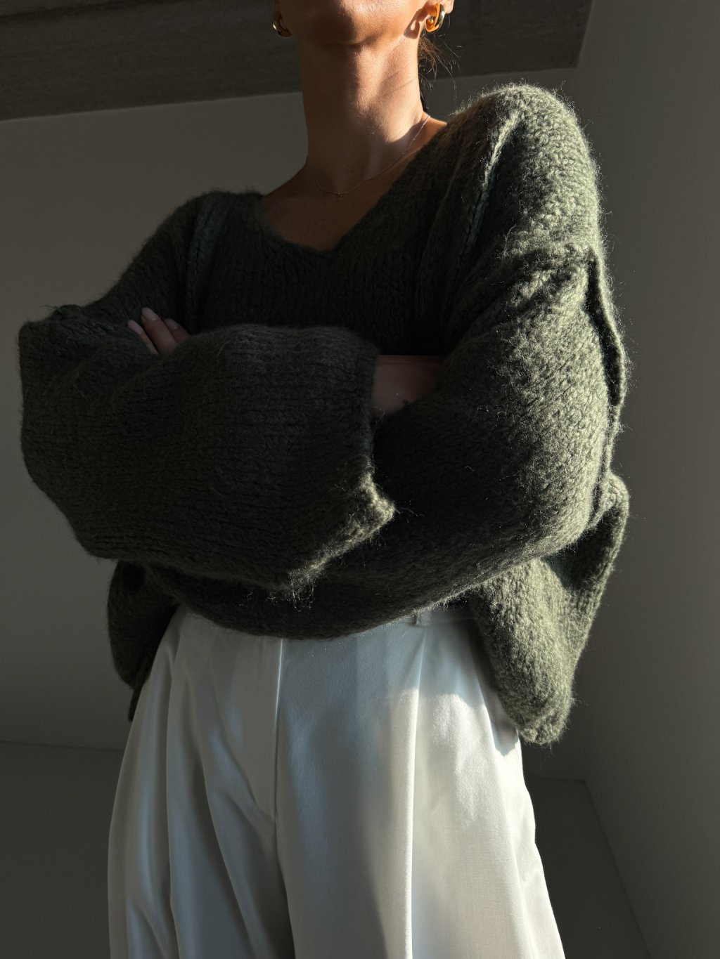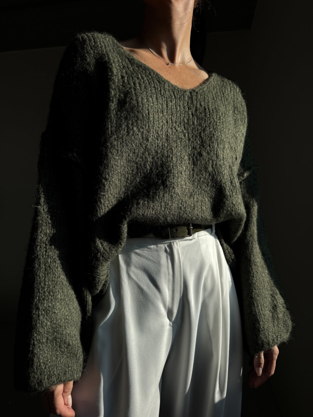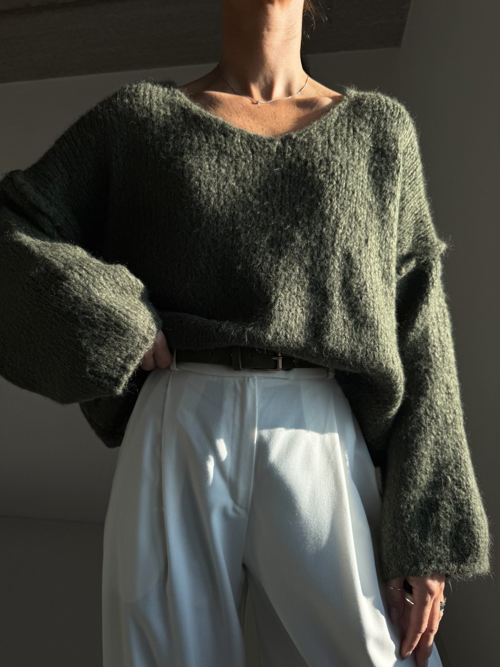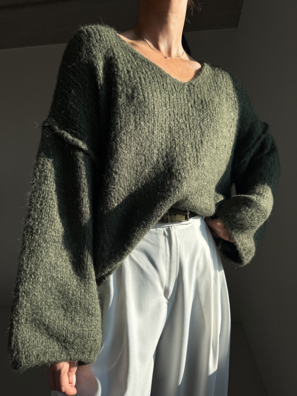 Měkký svetr oversized střihu, délka do pasu, výrazný šev u ramen, široké spadené rukávy, výstřih do "V". Svetr je hutný, zahřeje.