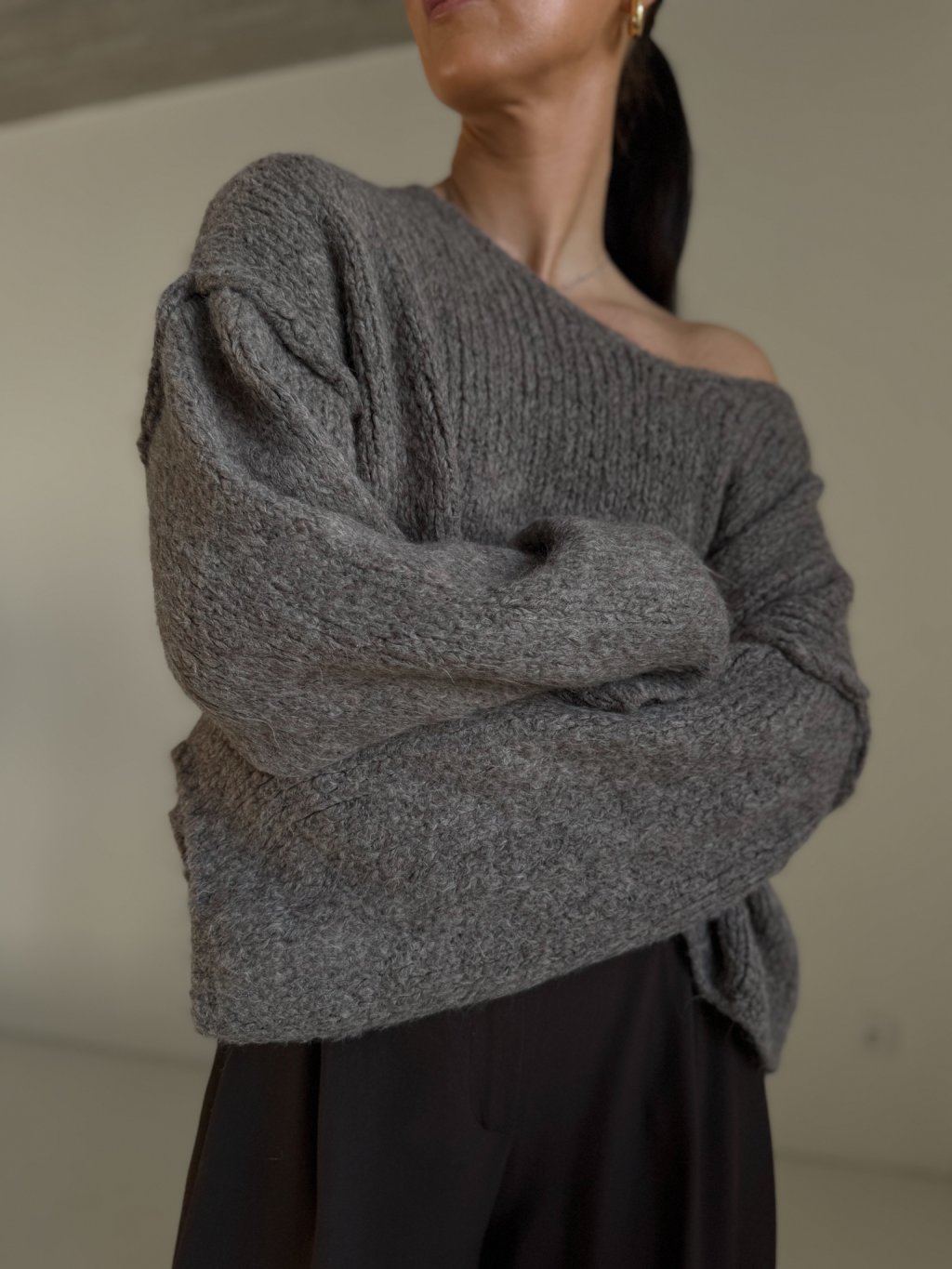 Měkký svetr oversized střihu, délka do pasu, výrazný šev u ramen, široké spadené rukávy, výstřih do "V". Svetr je hutný, zahřeje.