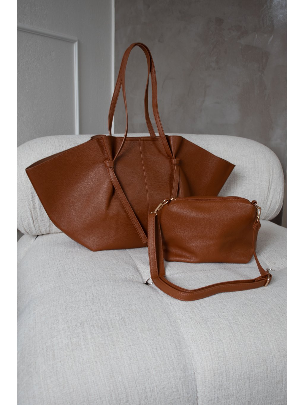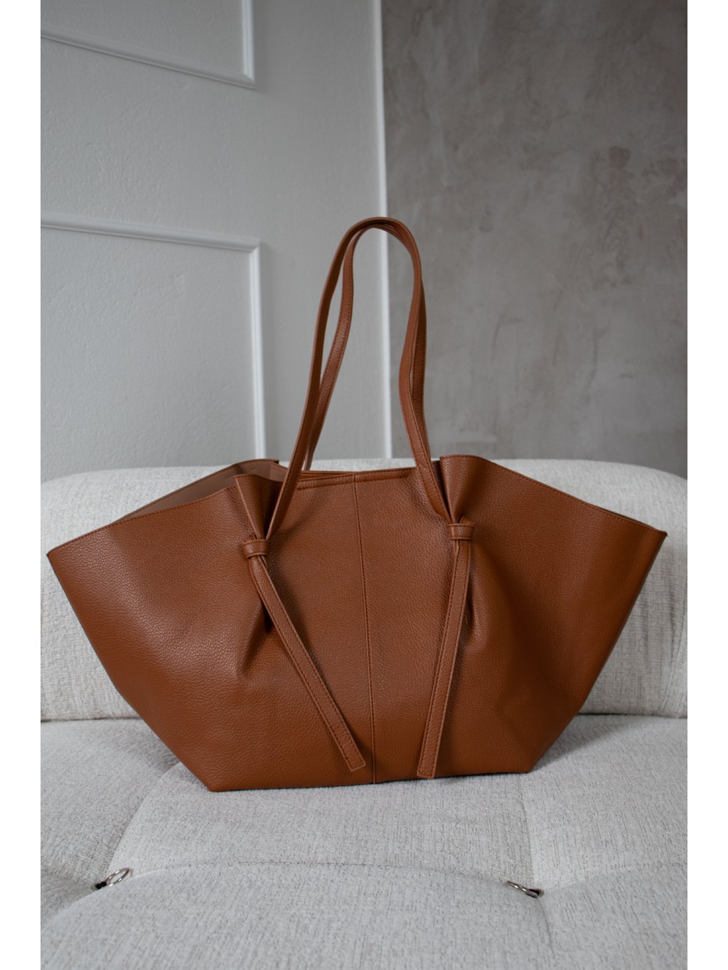 Velká shopper bag taška, zapínání na magnet, s detaily zavázaného uzlu, uvnitř malá kabelka 28x20 cm s popruhem a zapínáním na zip. Kovové prvky jsou ve zlaté barvě.