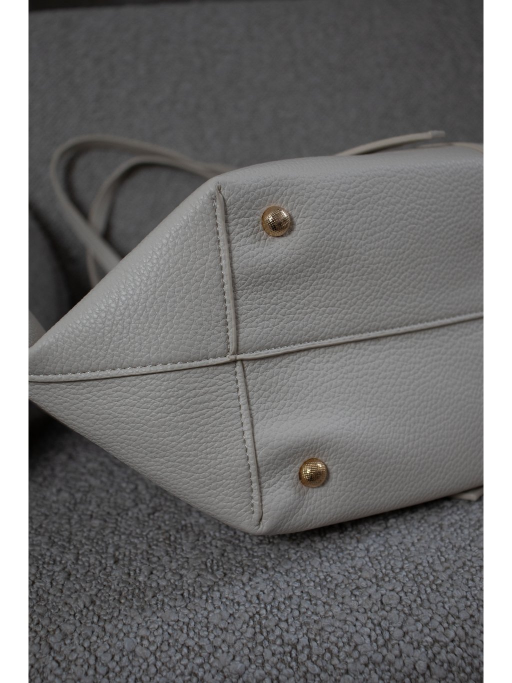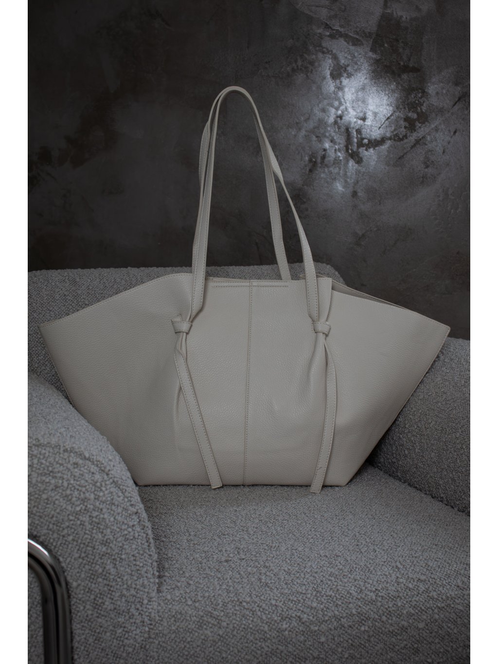 Velká shopper bag taška, zapínání na magnet, s detaily zavázaného uzlu, uvnitř malá kabelka 28x20 cm s popruhem a zapínáním na zip. Kovové prvky jsou ve zlaté barvě.