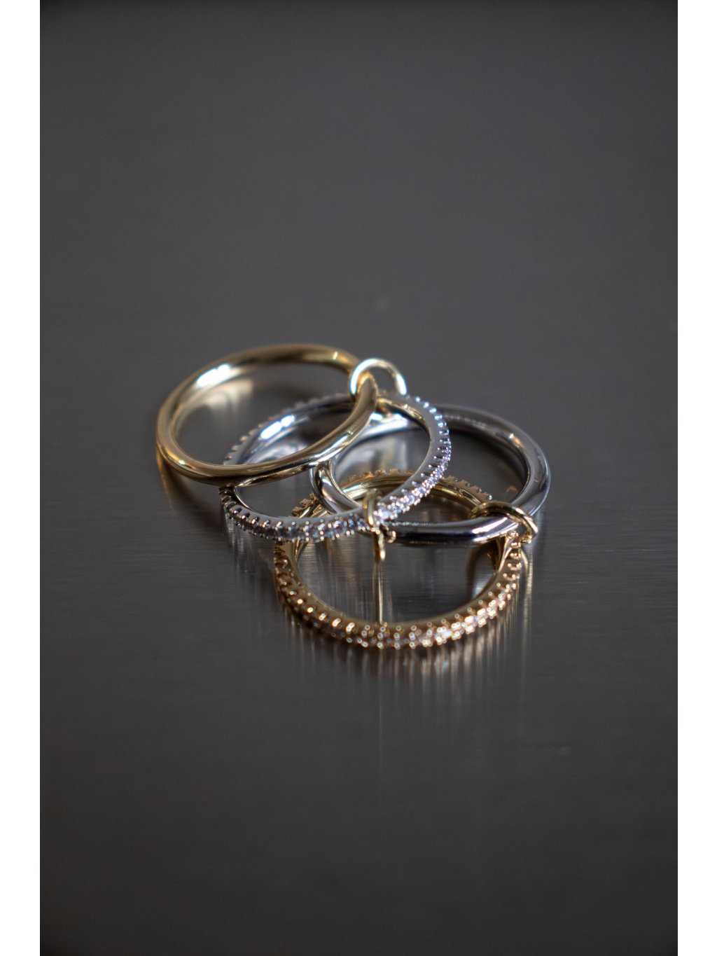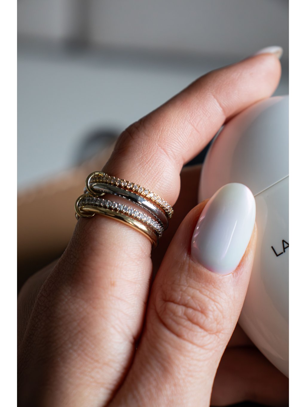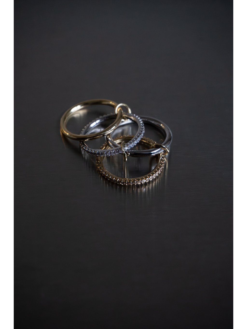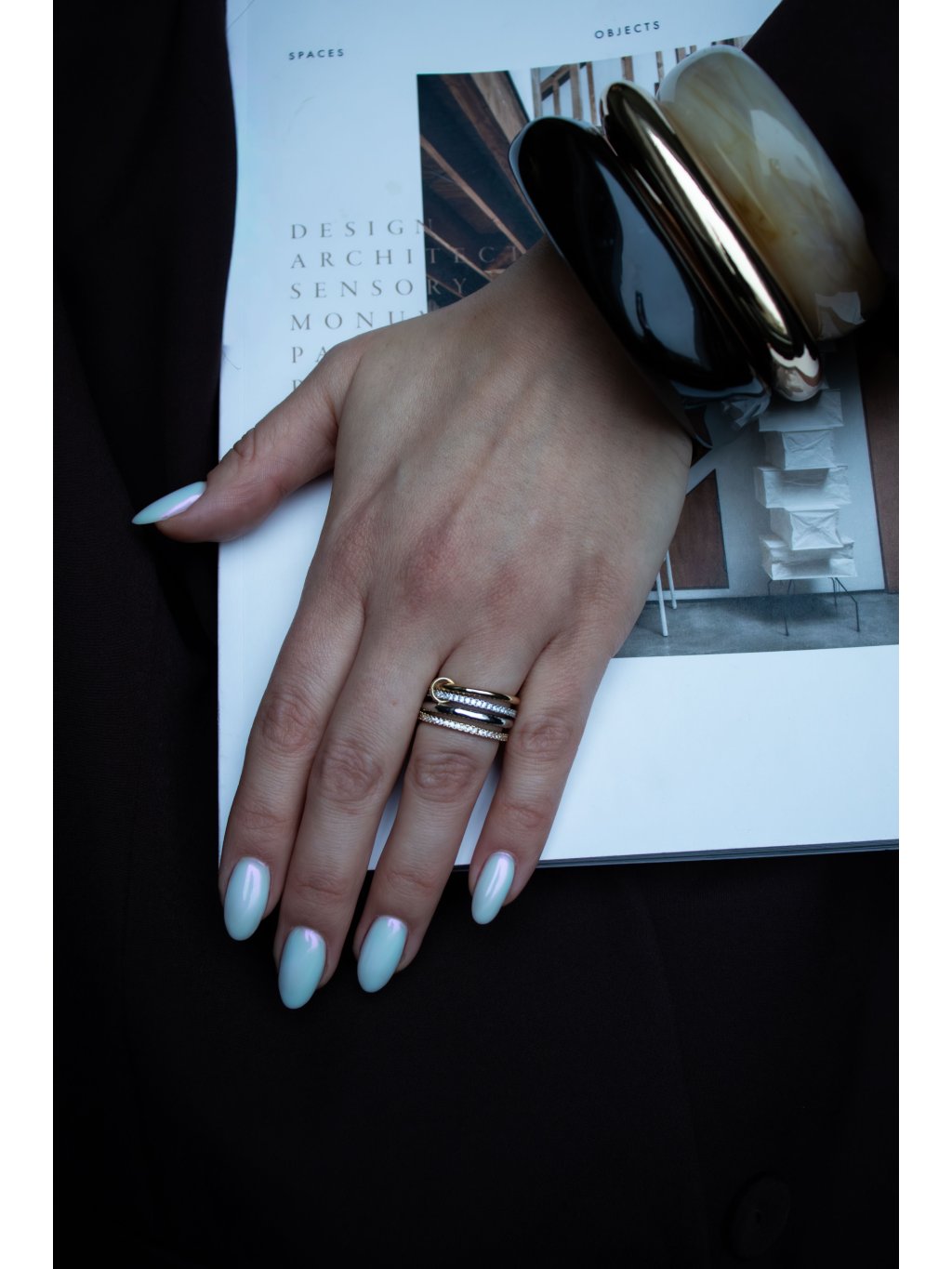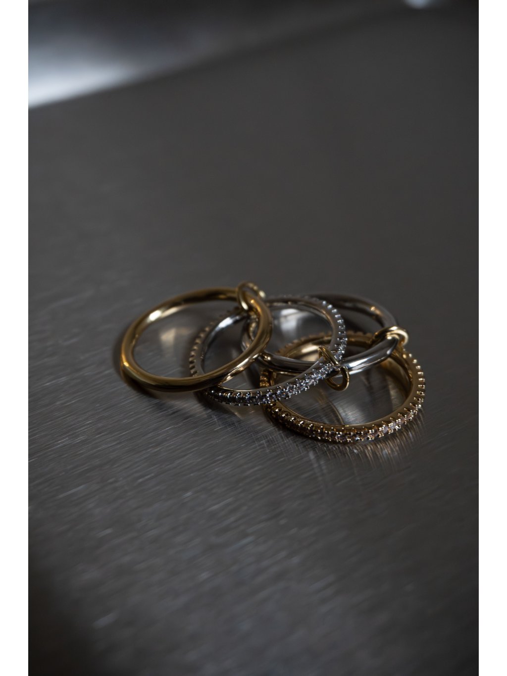 Vrstvený kovový prsten v kombinaci zlaté a stříbrné barvy. Jednotlivé prsteny jsou k sobě spojeny očkem, případně je tedy možné je i zcela oddělit. Dva prsteny jsou hladké, dva jsou s kamínky.