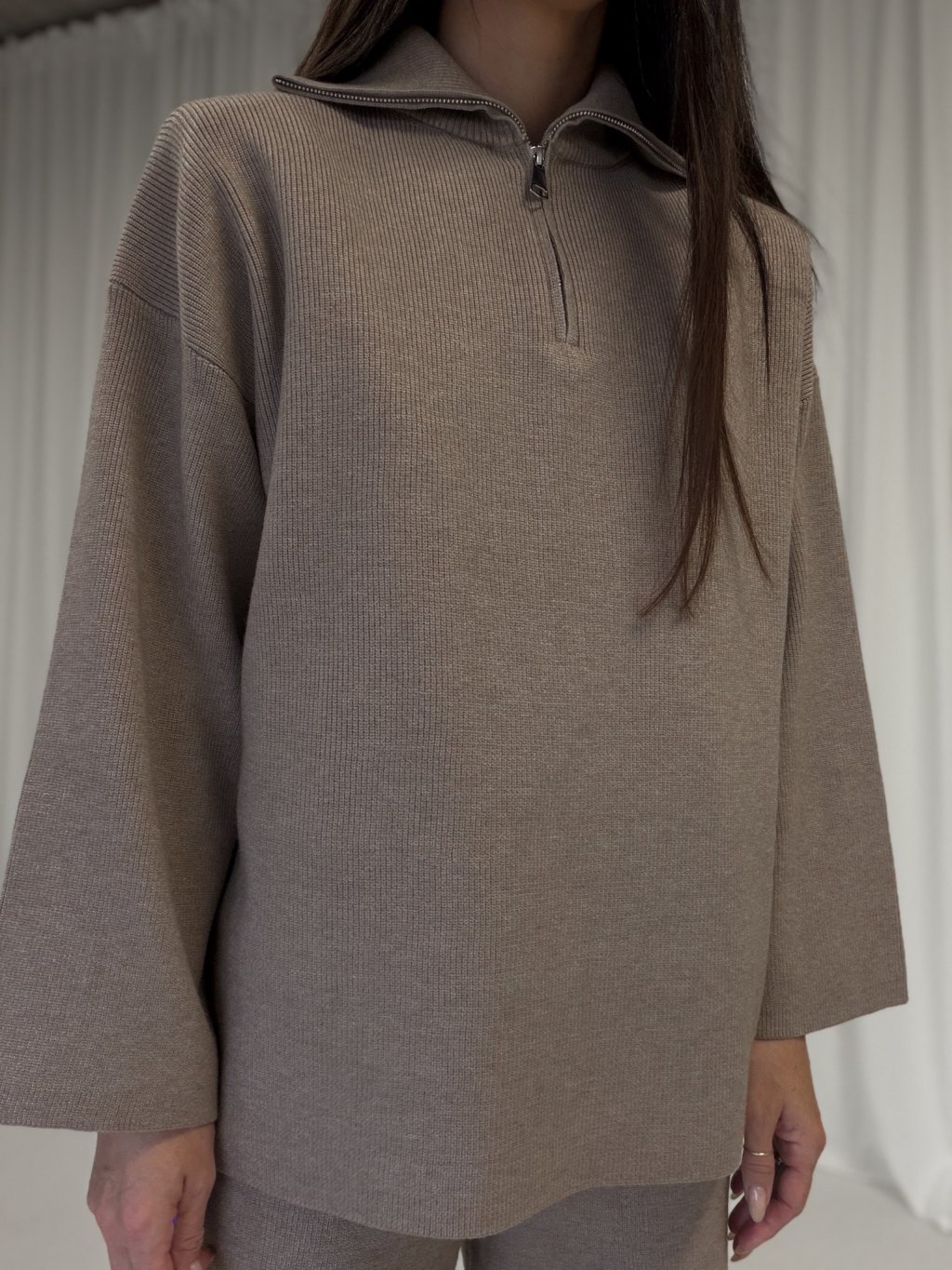 Pleteninový rolák s rozepínáním na zip ve stříbrné barvě. Prodloužená délka, široký dlouhý rukáv. Kalhoty s vyšším pasem, široké nohavice, v pase na gumu.