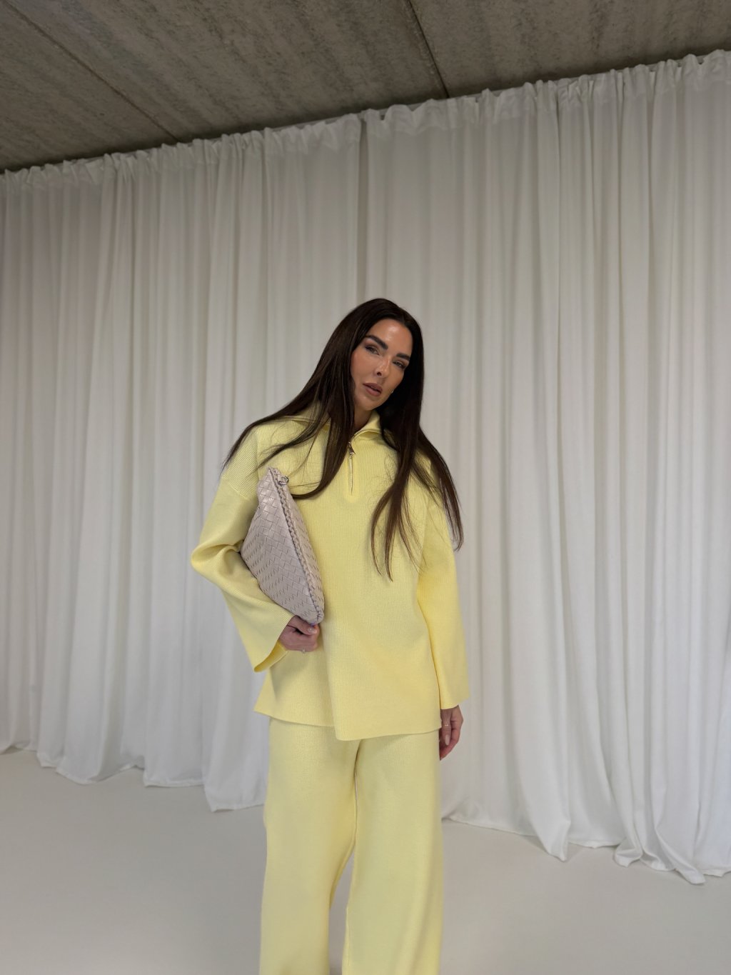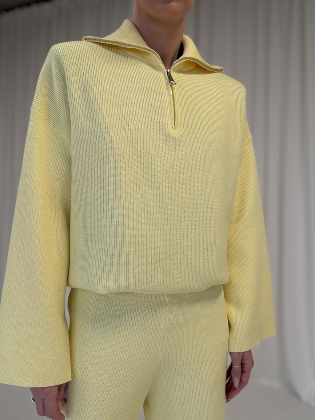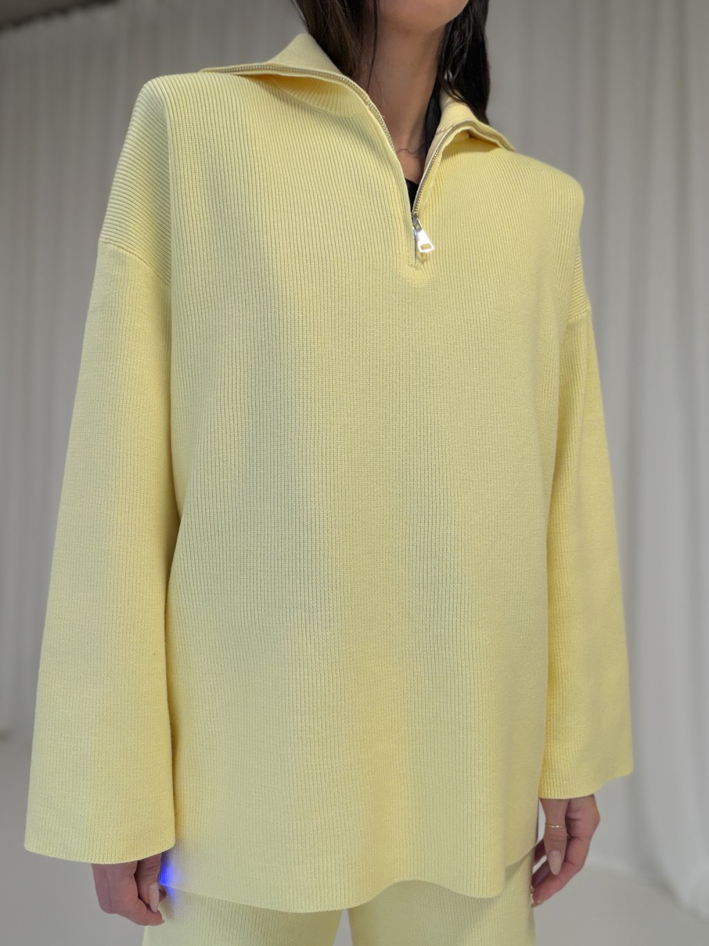 Pleteninový rolák s rozepínáním na zip ve stříbrné barvě. Prodloužená délka, široký dlouhý rukáv. Kalhoty s vyšším pasem, široké nohavice, v pase na gumu.
