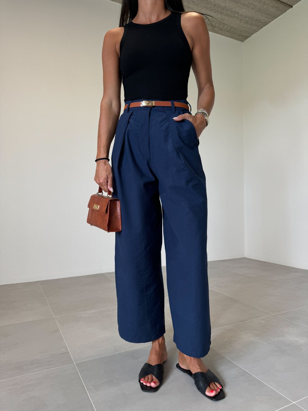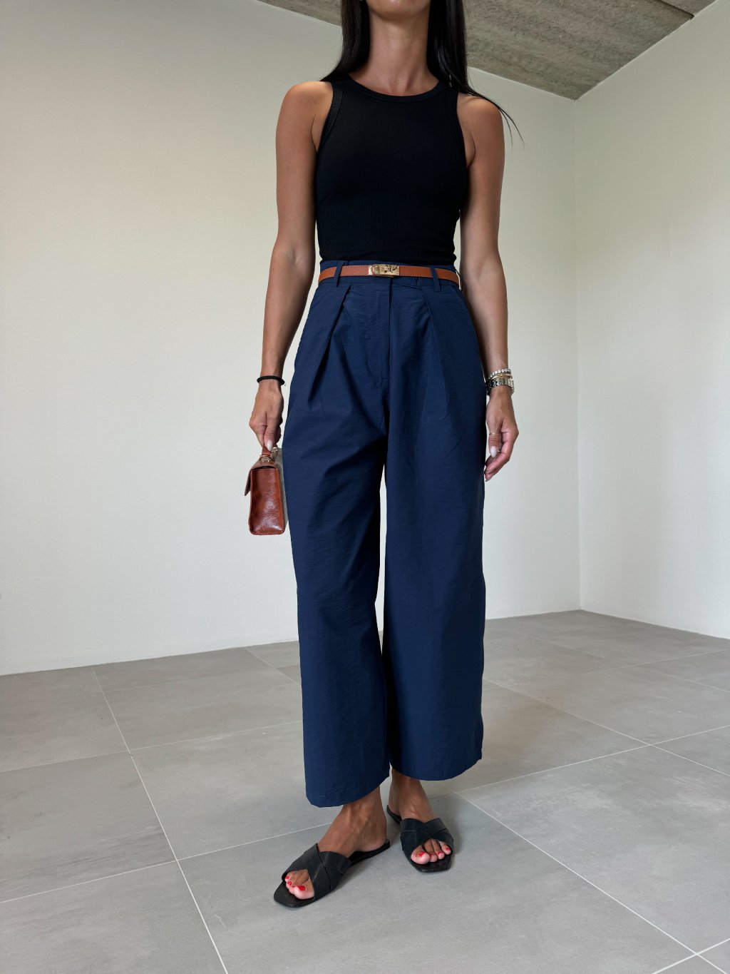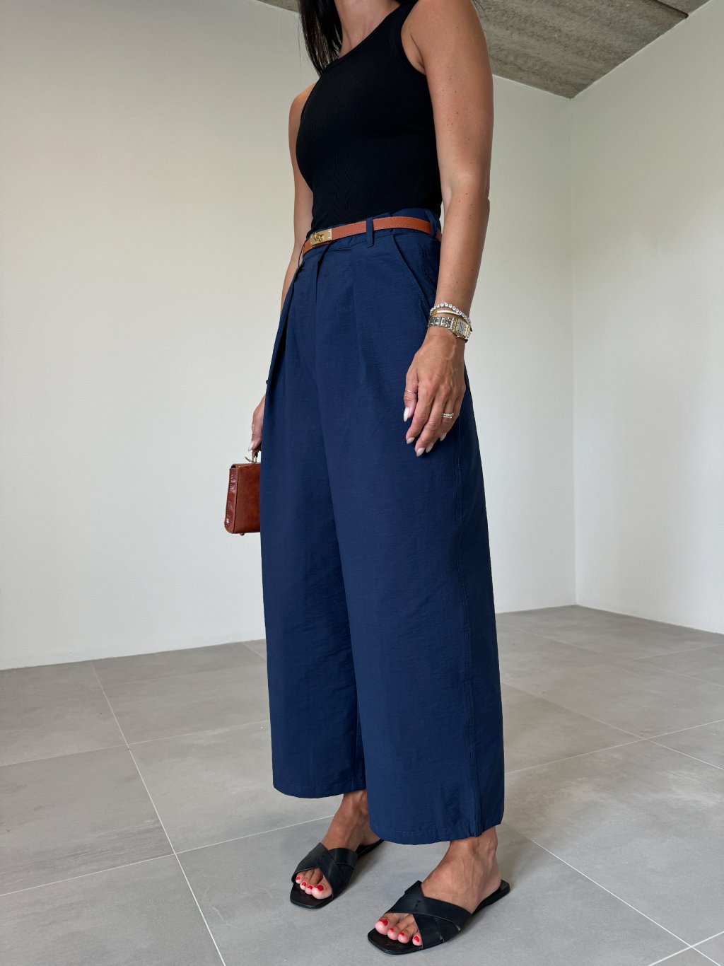 Kalhoty v 7/8 délce, volný, široký střih, v přední části mírně nabrané, boční kapsy. Jemný šusťákový materiál.