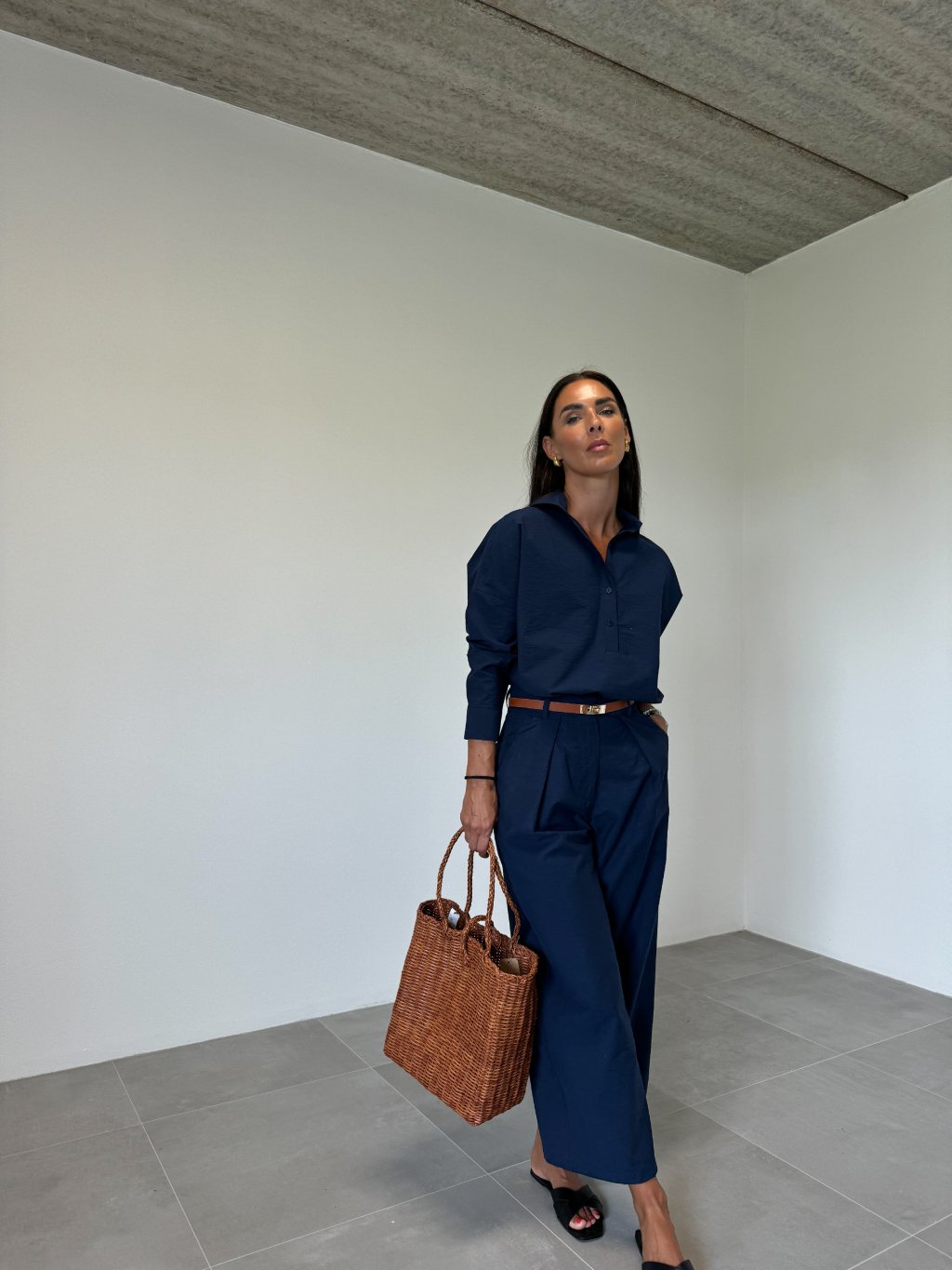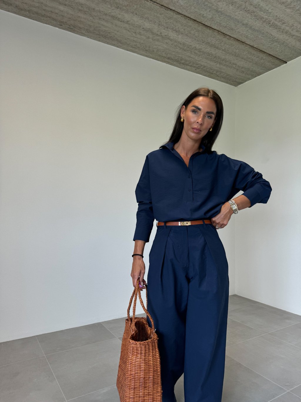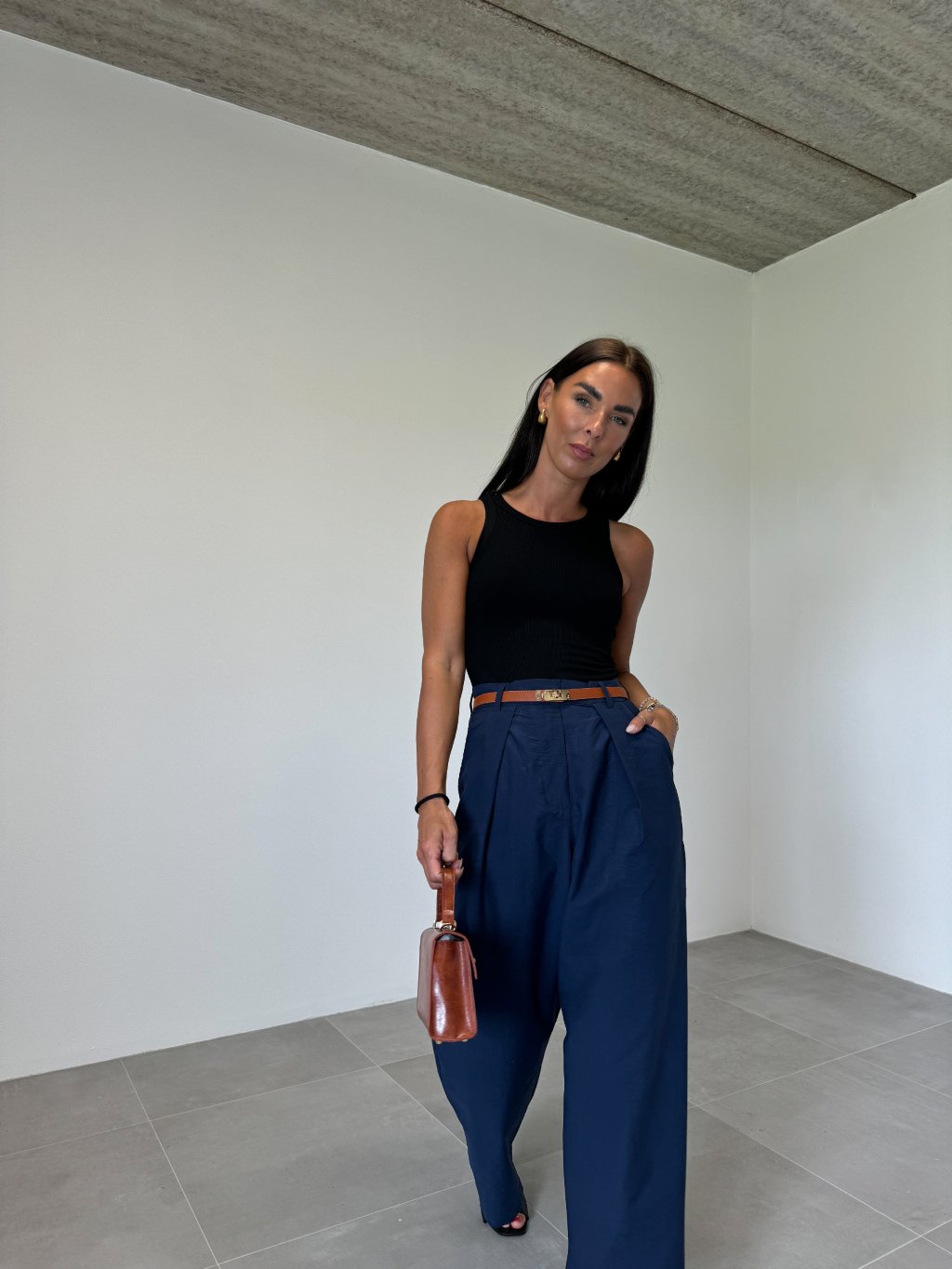 Kalhoty v 7/8 délce, volný, široký střih, v přední části mírně nabrané, boční kapsy. Jemný šusťákový materiál.