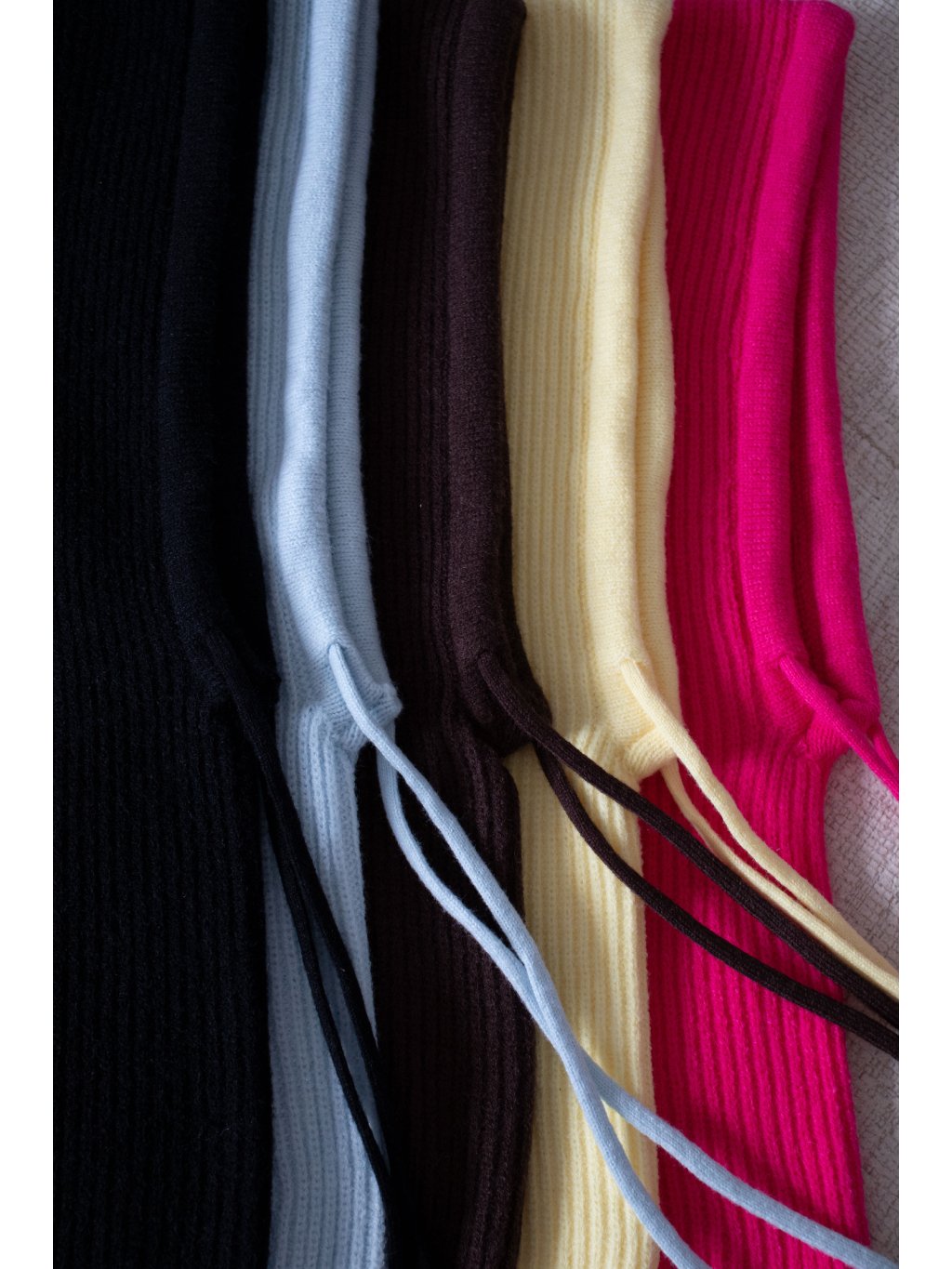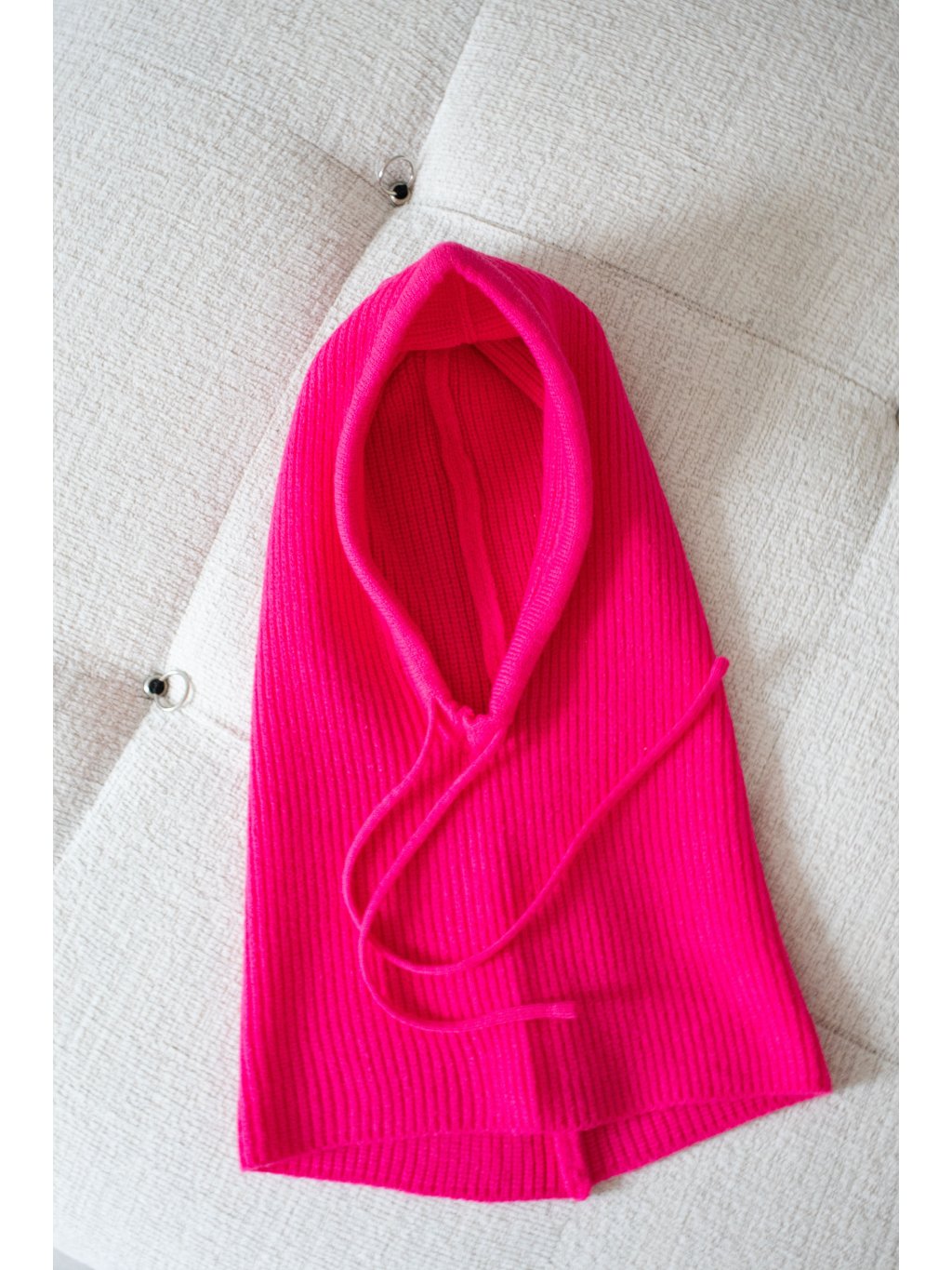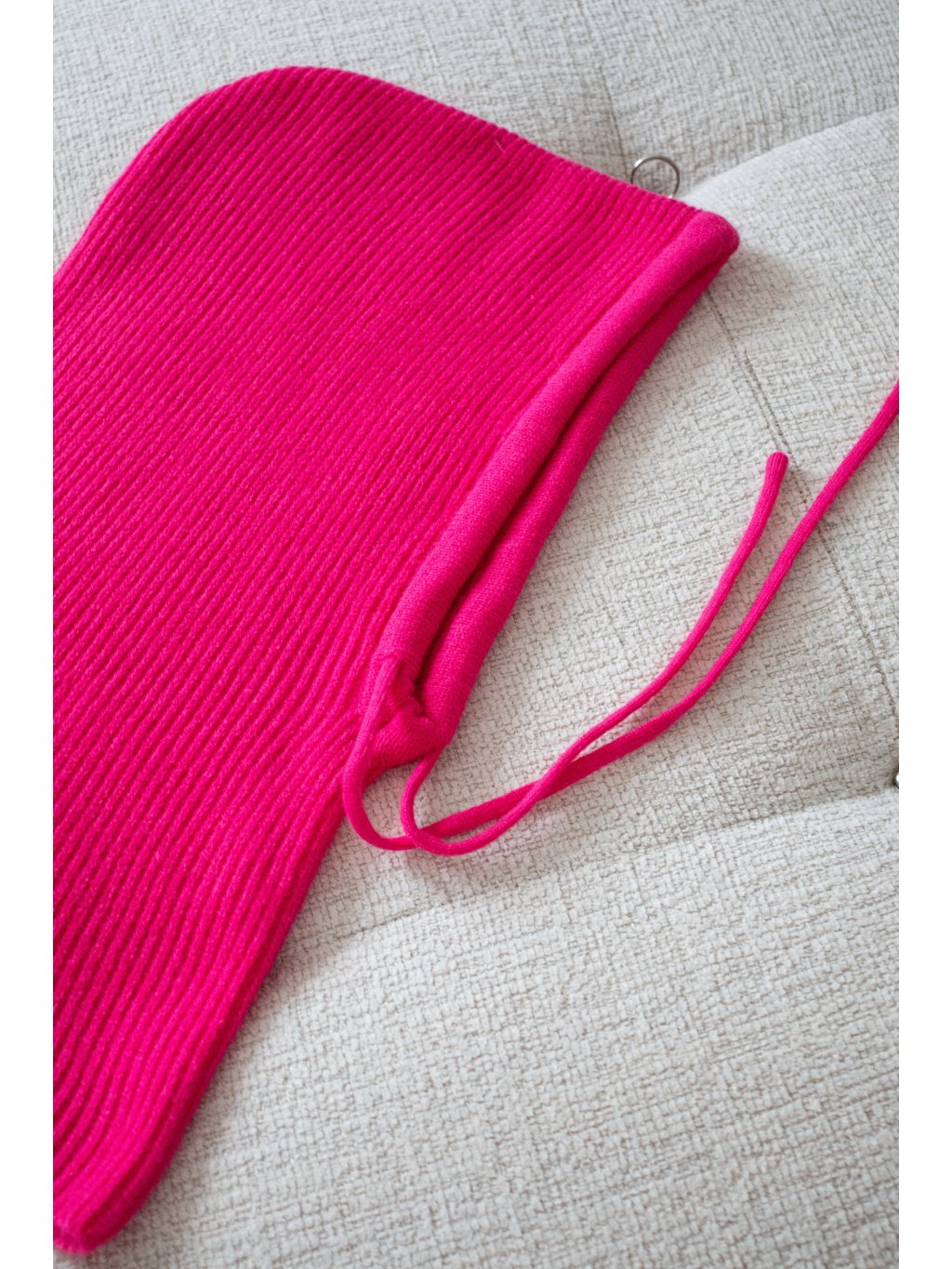 Pletená kukla, prodloužený krk, zavazování na šňůrky, příjemný materiál.