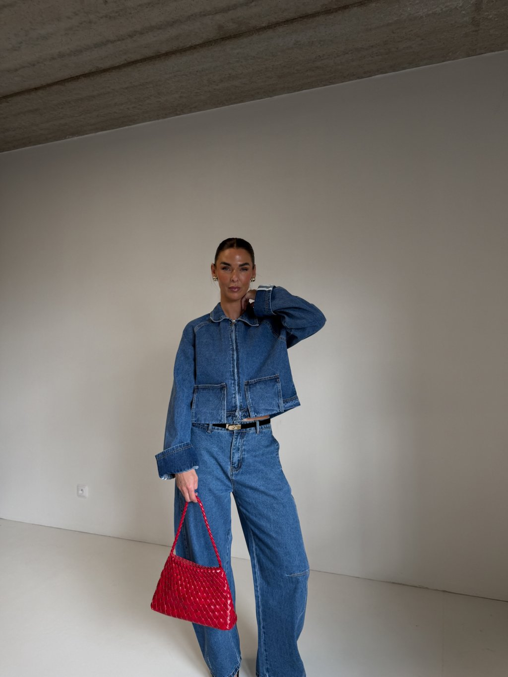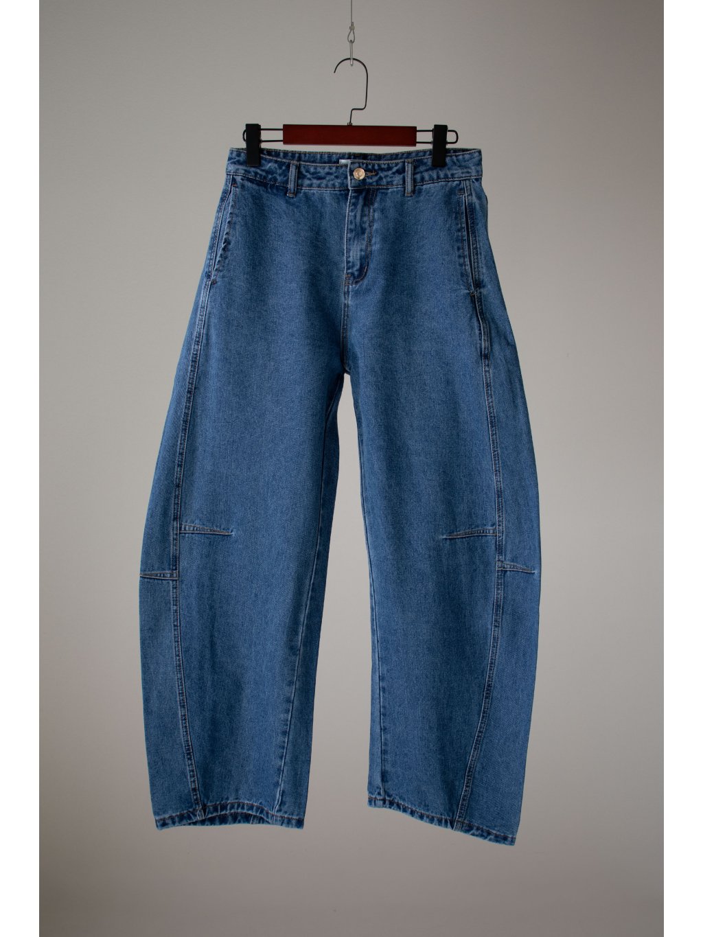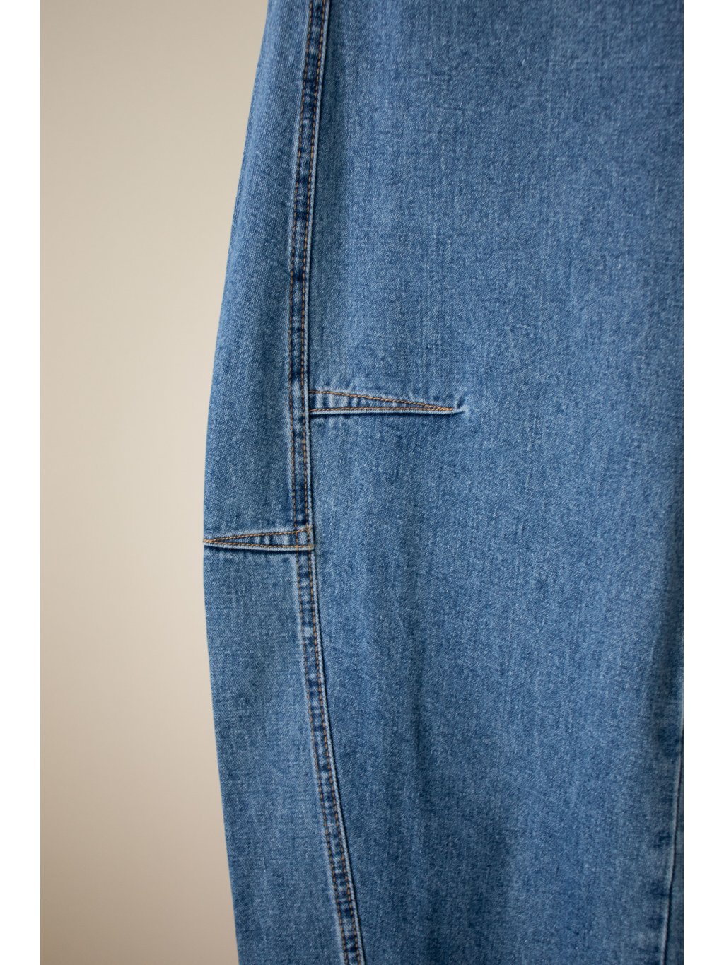 Džíny širokého balonového střihu, boční i zadní kapsy, zapínání na zip a denim knoflík, středně vysoký pas, poutka na pásek, kontrastní prošití, na nohavicích šikmý šev.