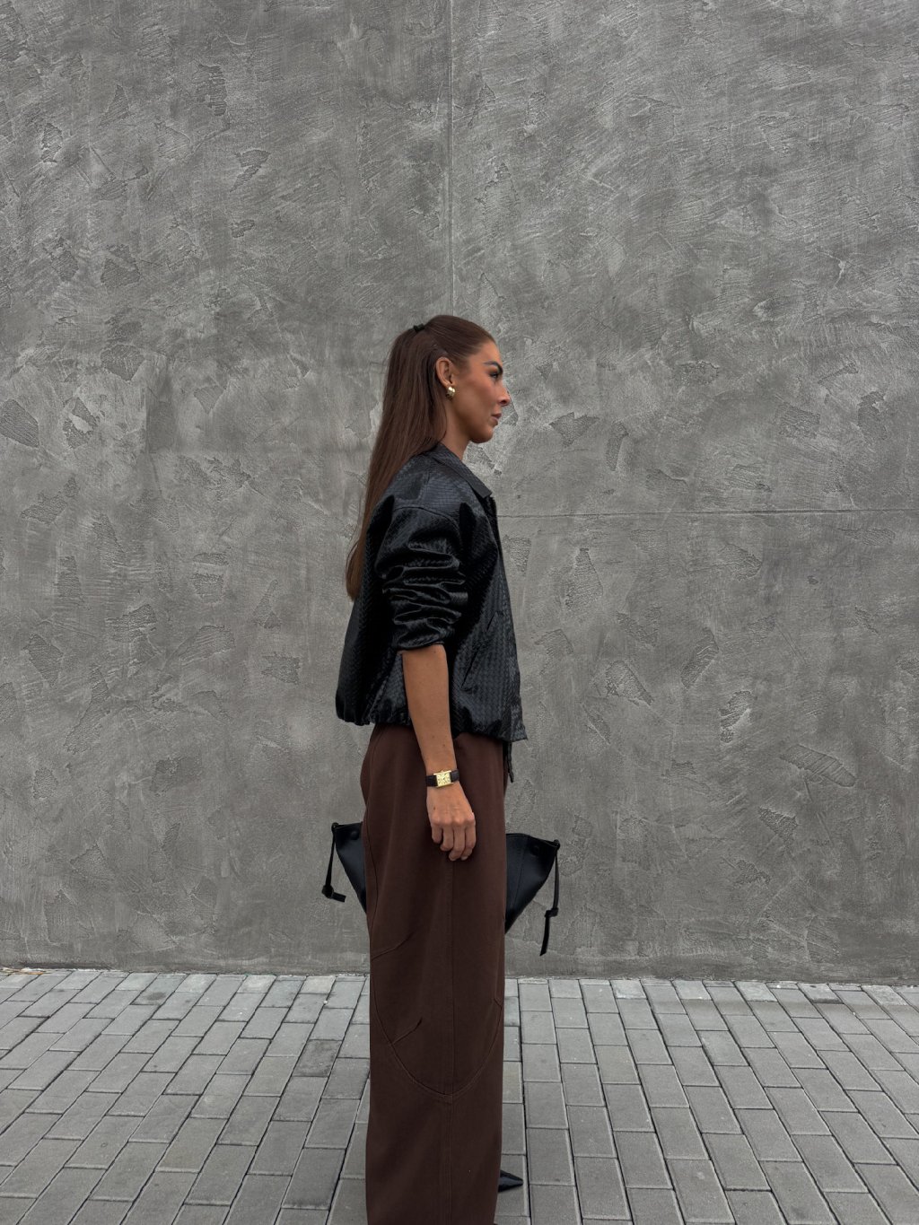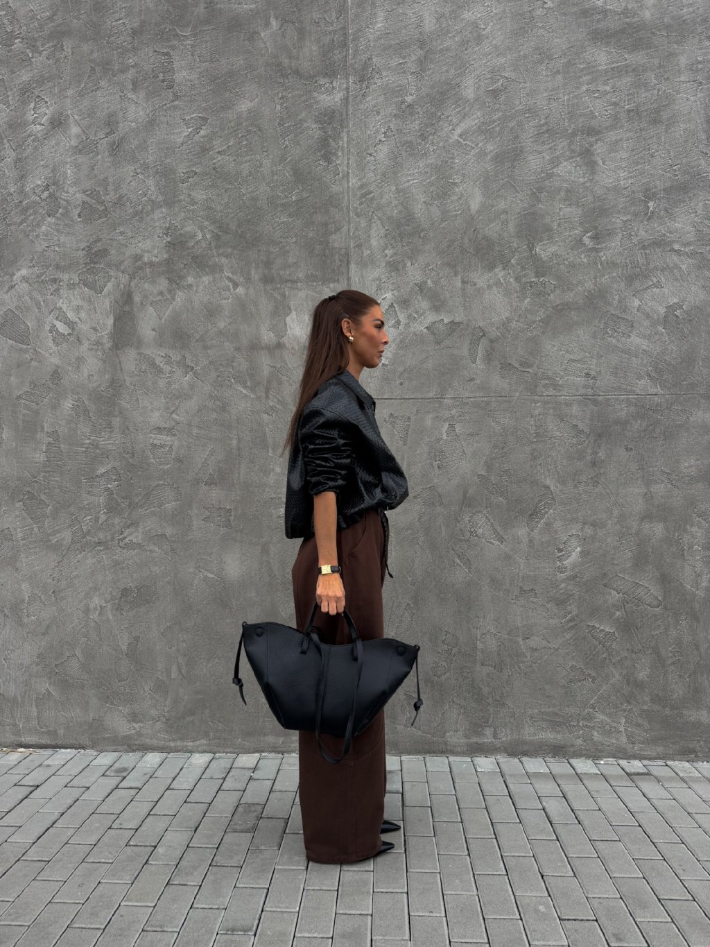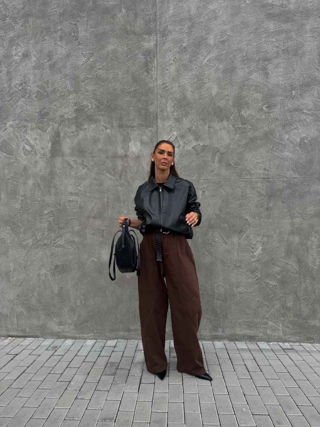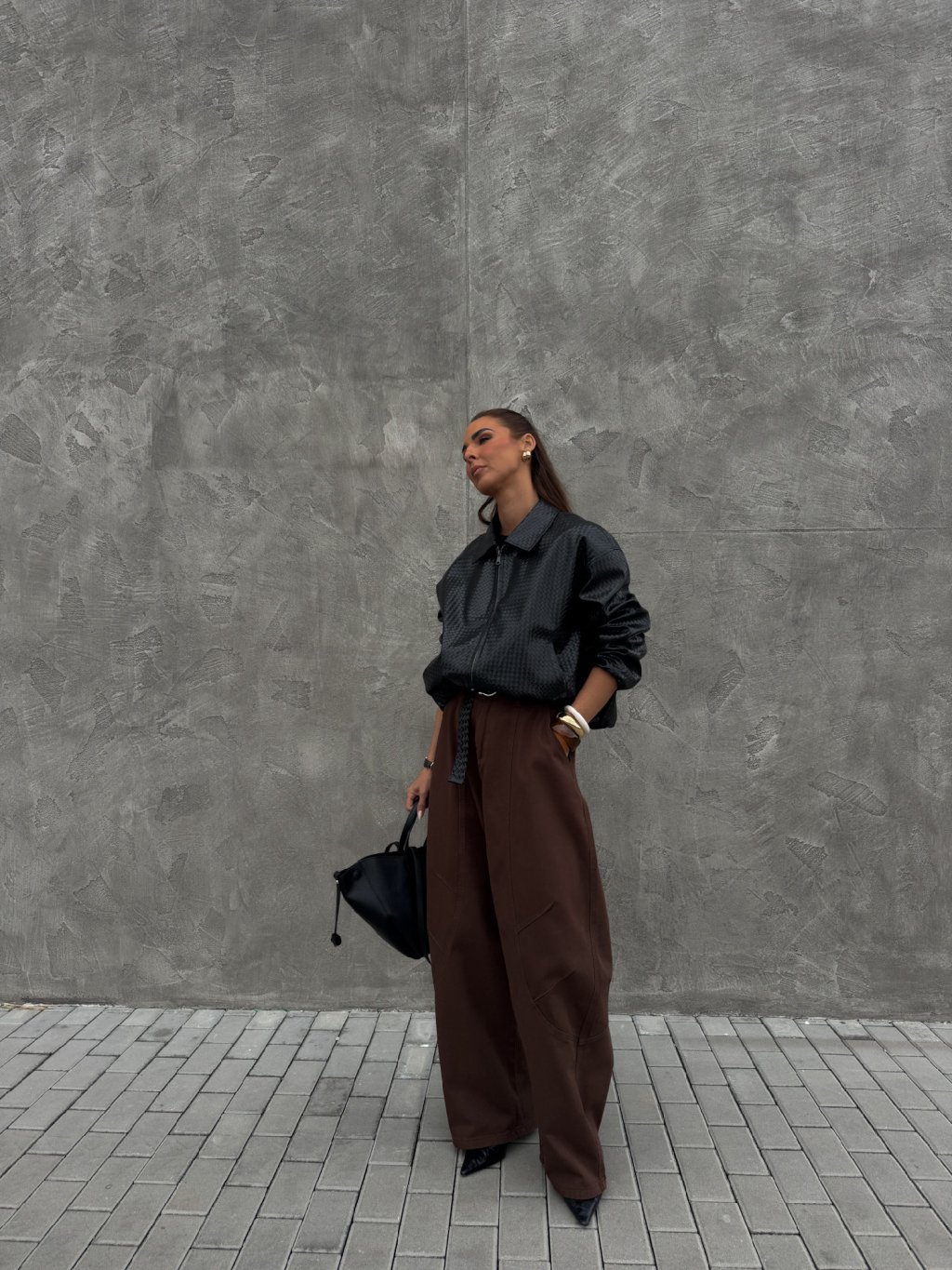 Džíny širokého balonového střihu, přední kapsy, zapínání na zip, vpředu detail šikmého prošití, v pase poutka na opasek.