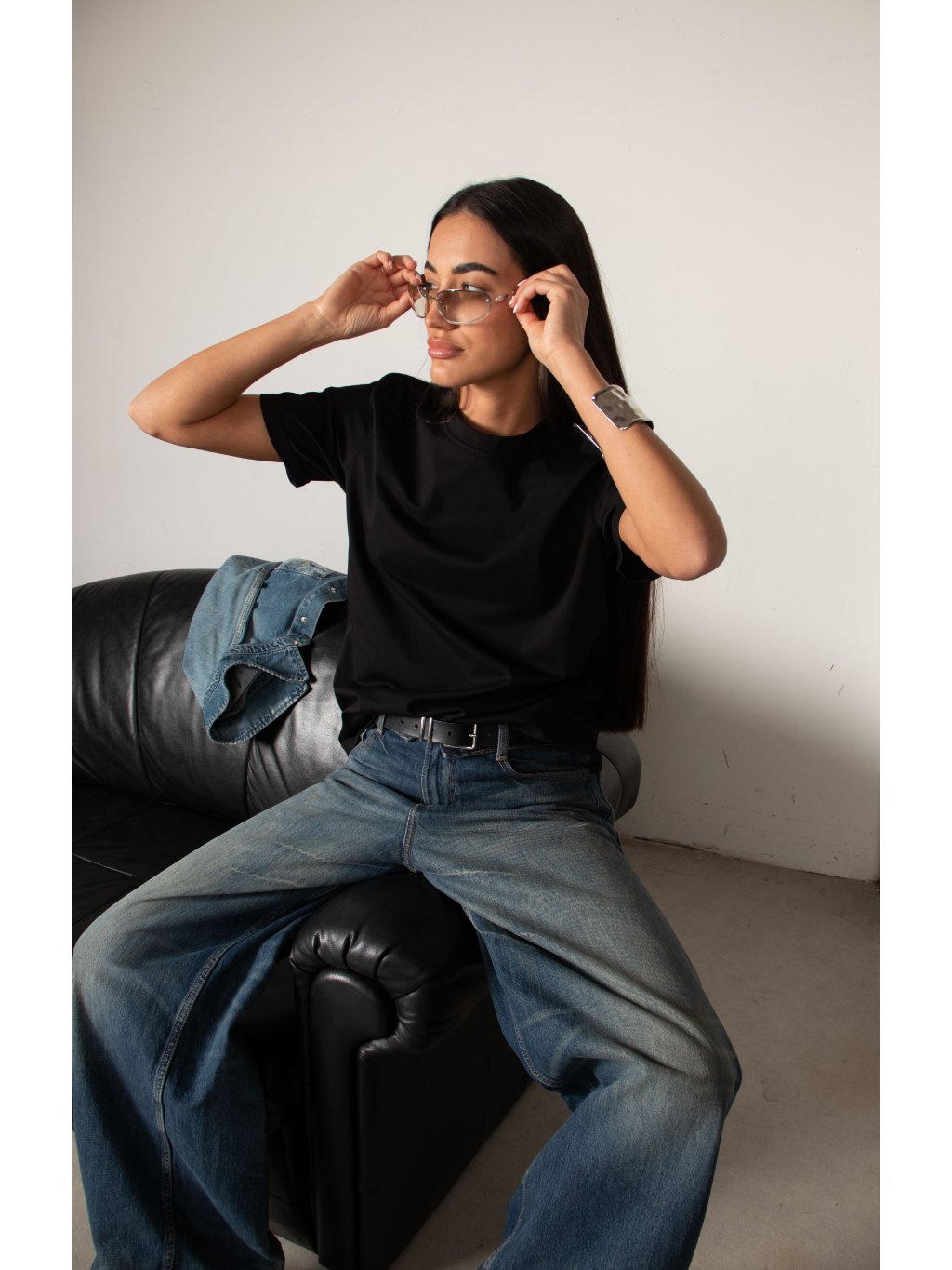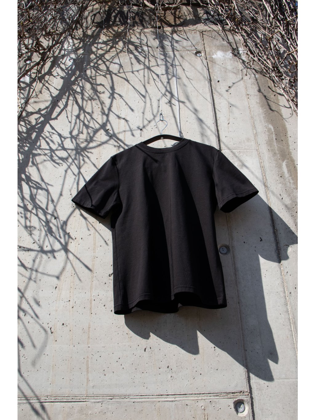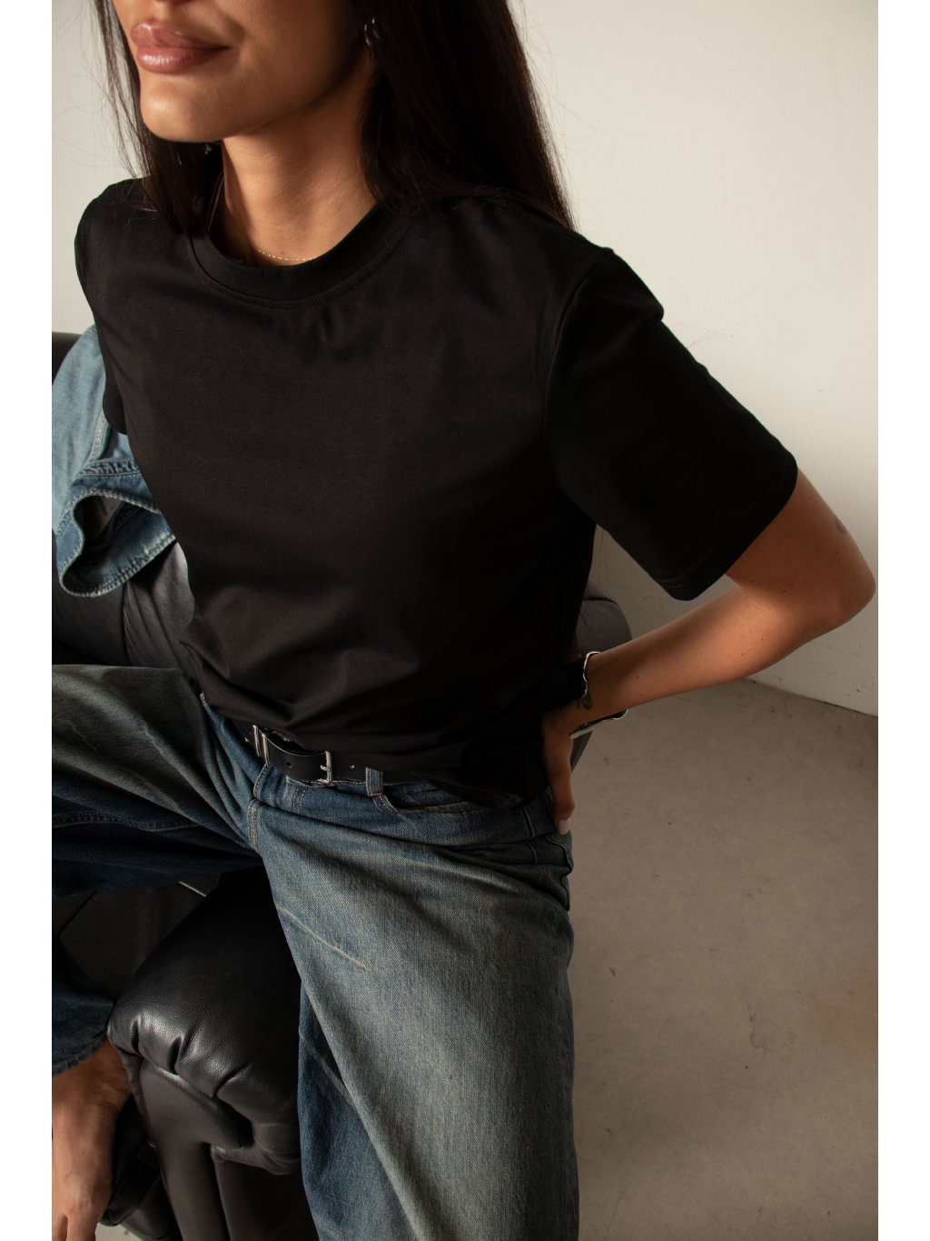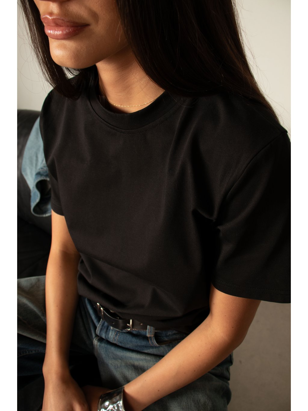 Bavlněné tričko volnějšího střihu, mírně spadené rukávy, délka pod pas, kulatý výstřih. Materiál má vysokou gramáž bavlny.