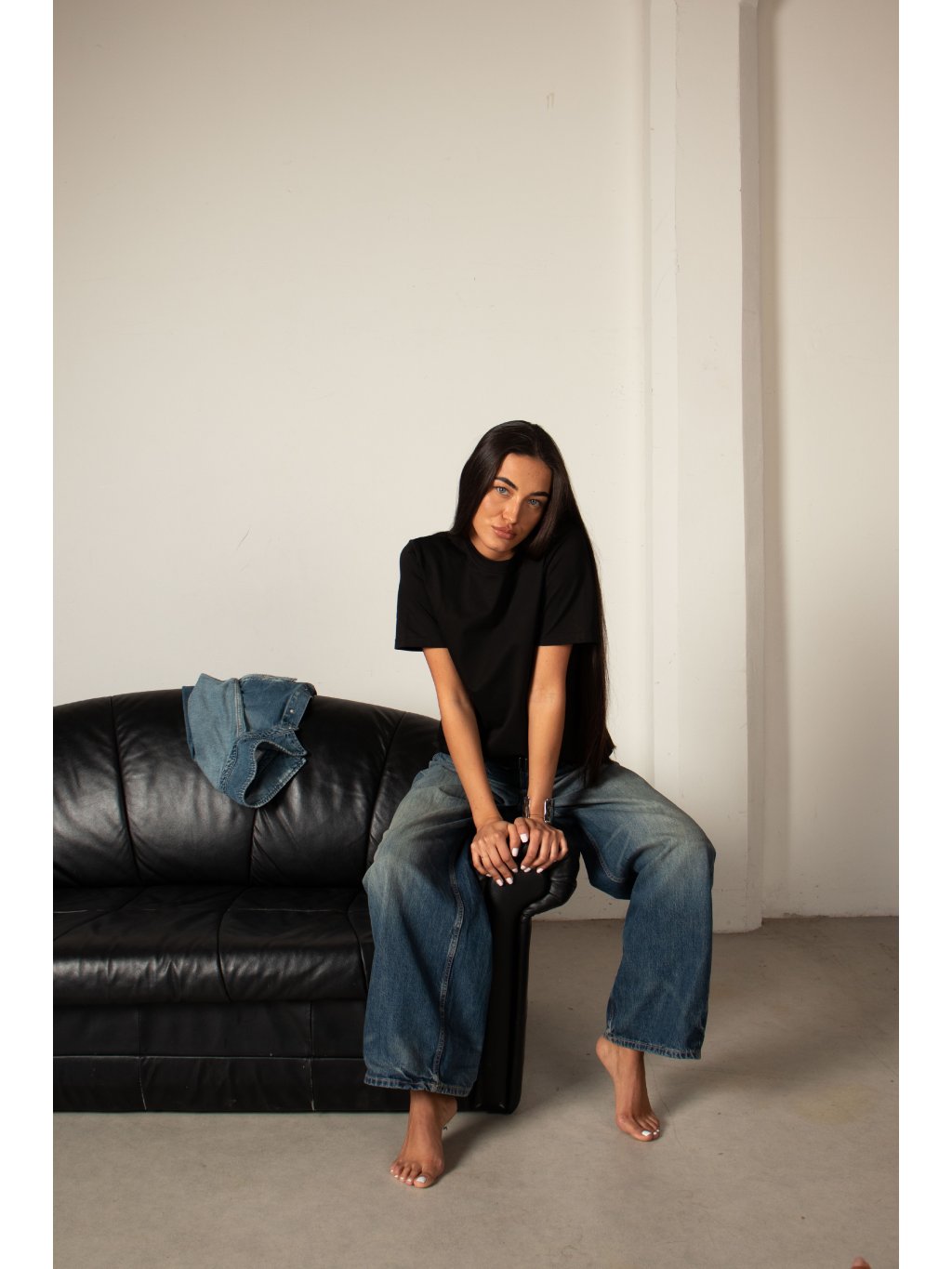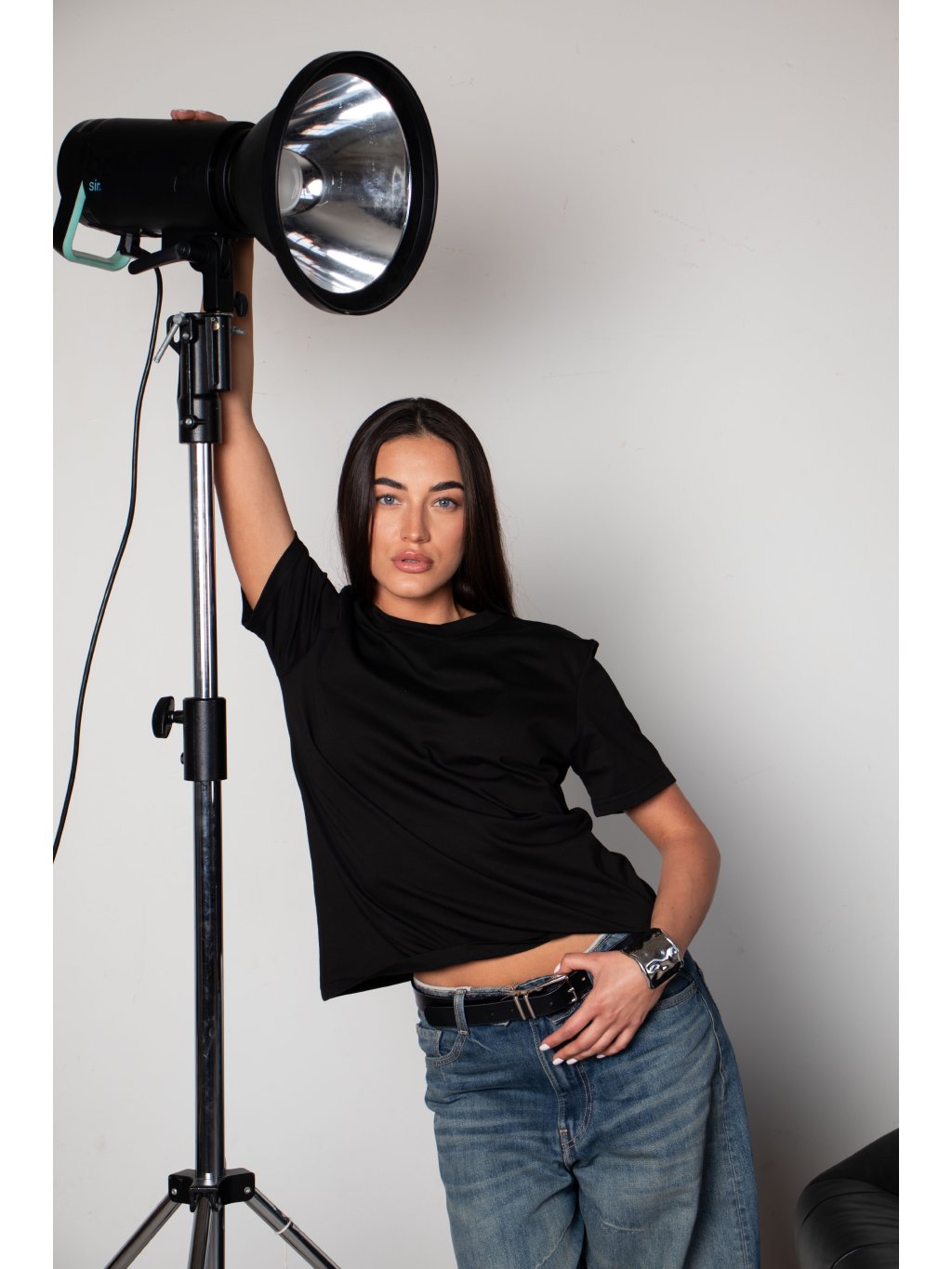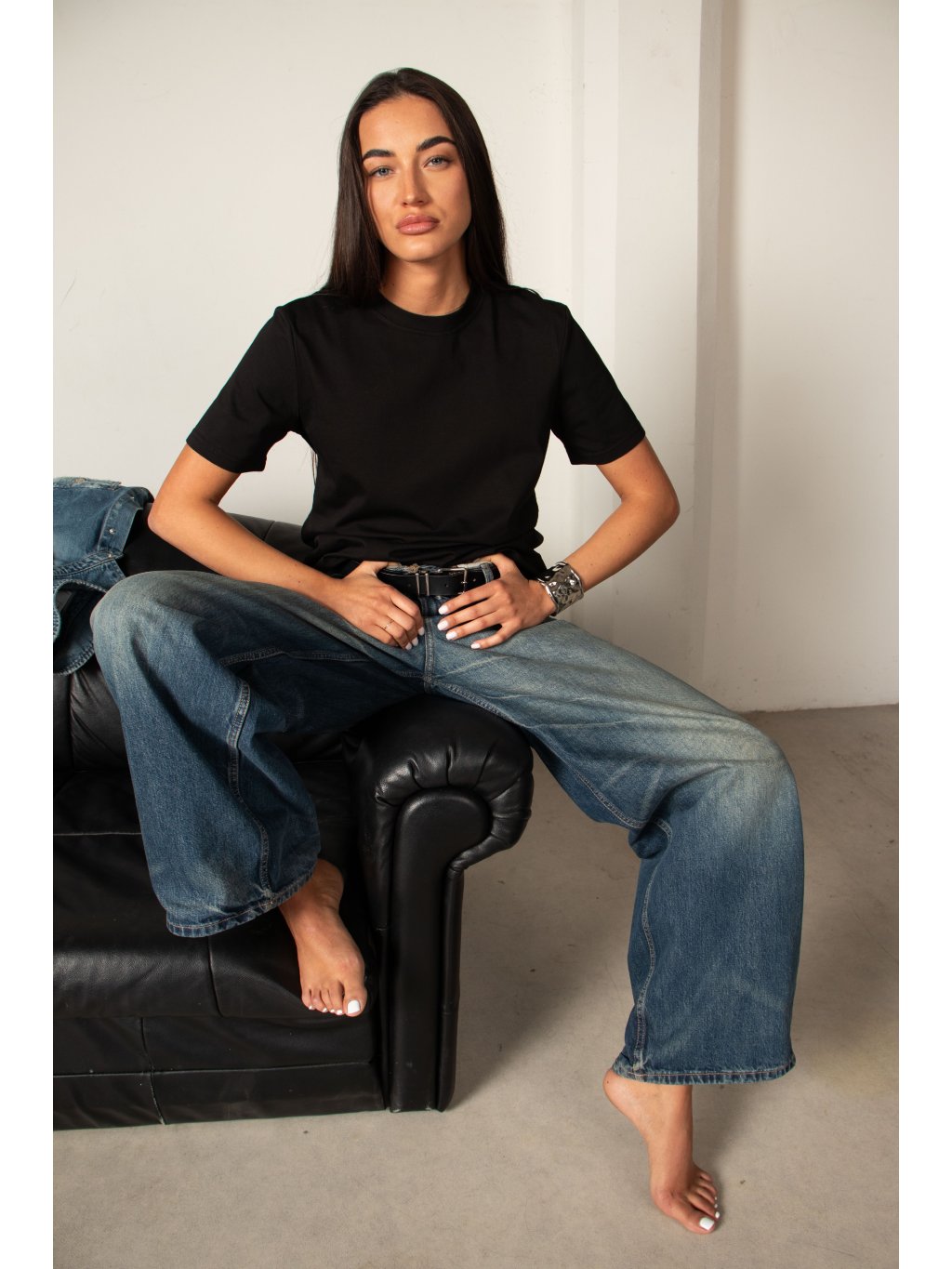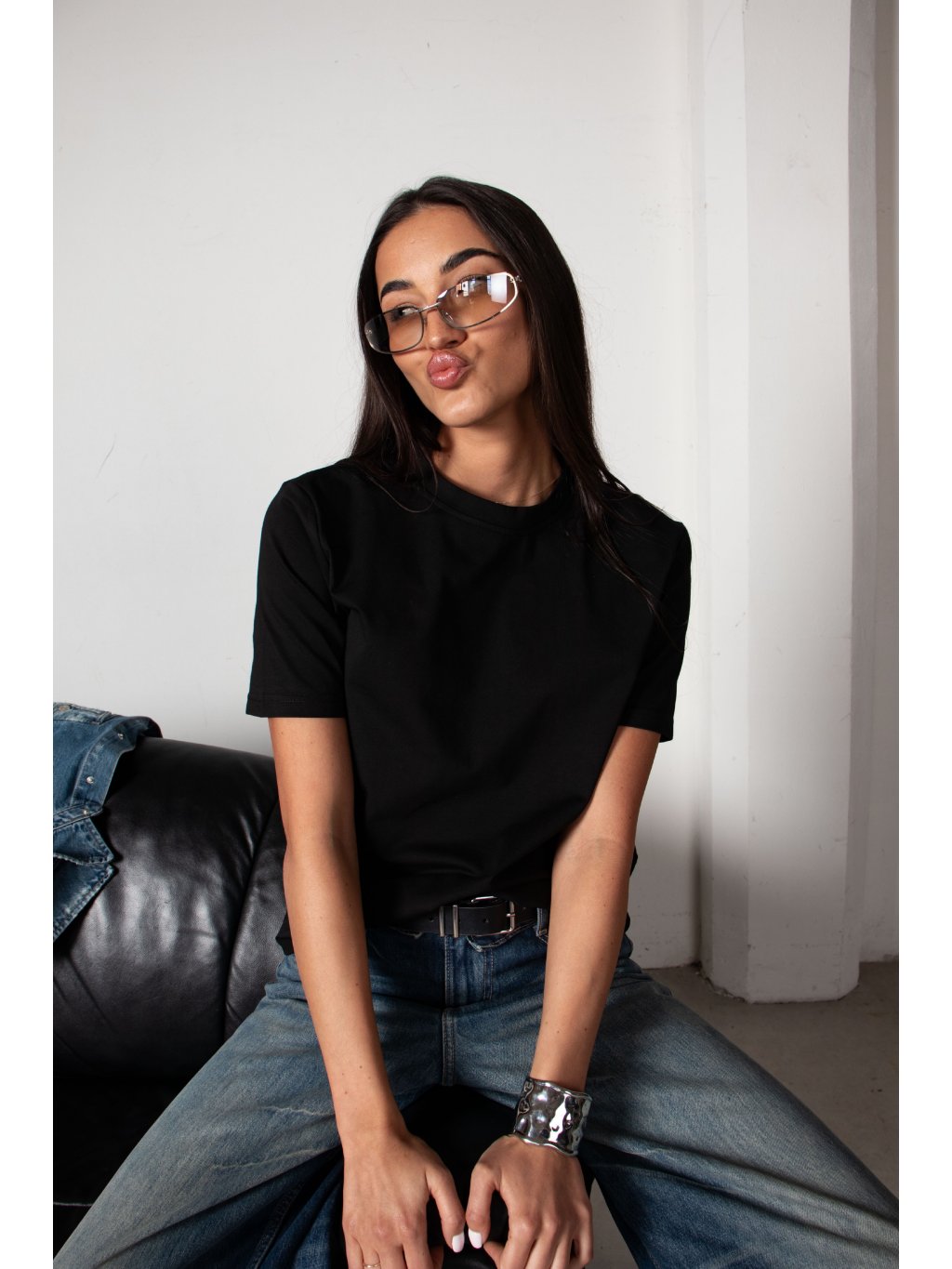 Bavlněné tričko volnějšího střihu, mírně spadené rukávy, délka pod pas, kulatý výstřih. Materiál má vysokou gramáž bavlny.