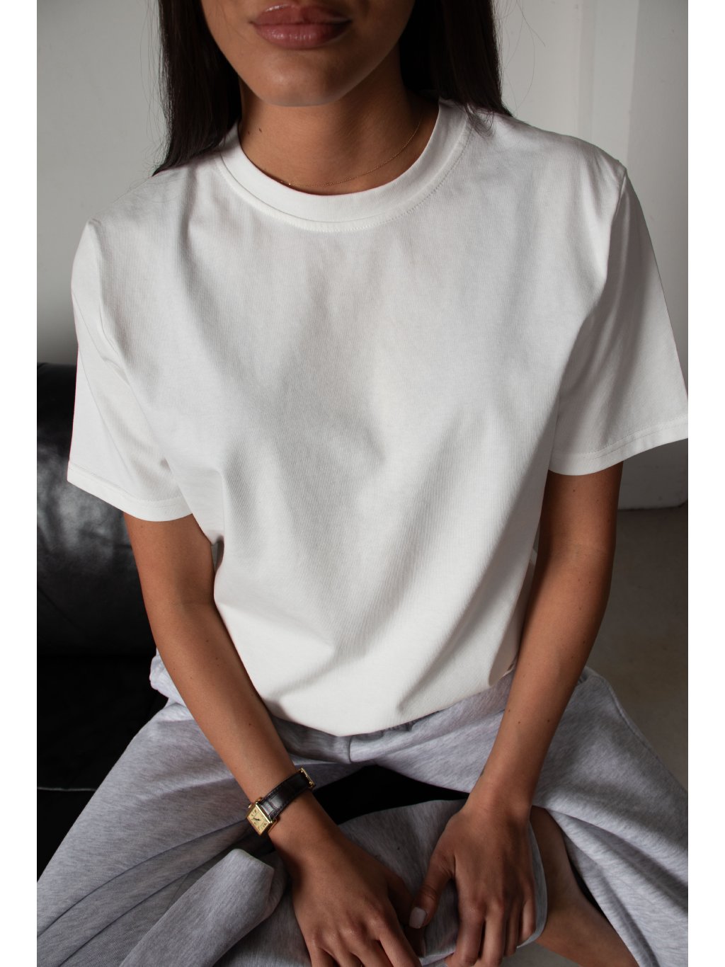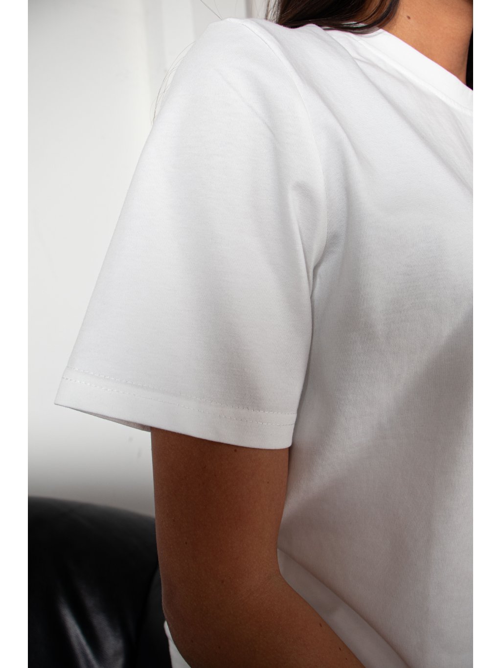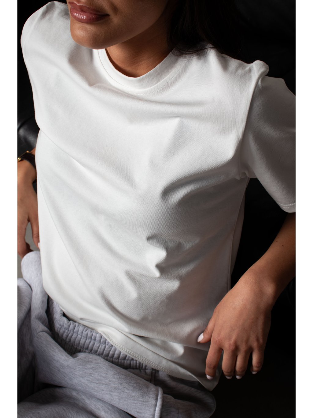 Bavlněné tričko volnějšího střihu, mírně spadené rukávy, délka pod pas, kulatý výstřih. Materiál má vysokou gramáž bavlny.