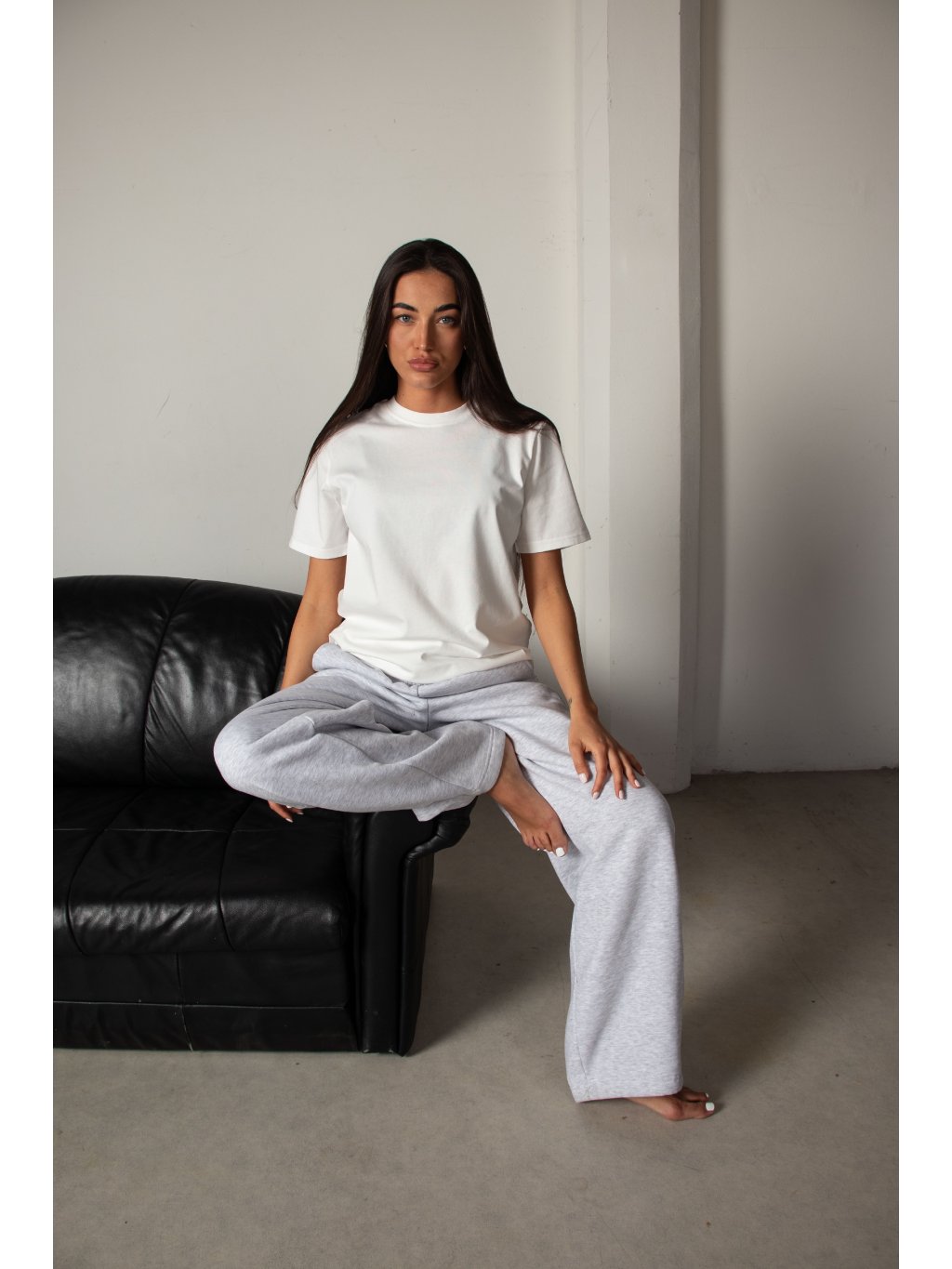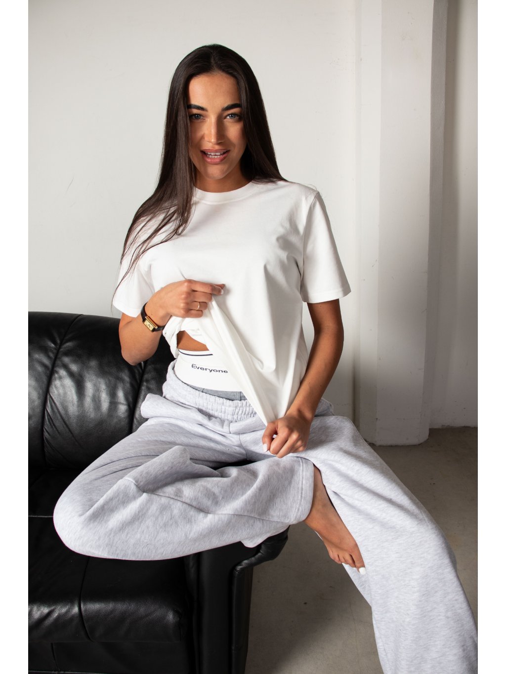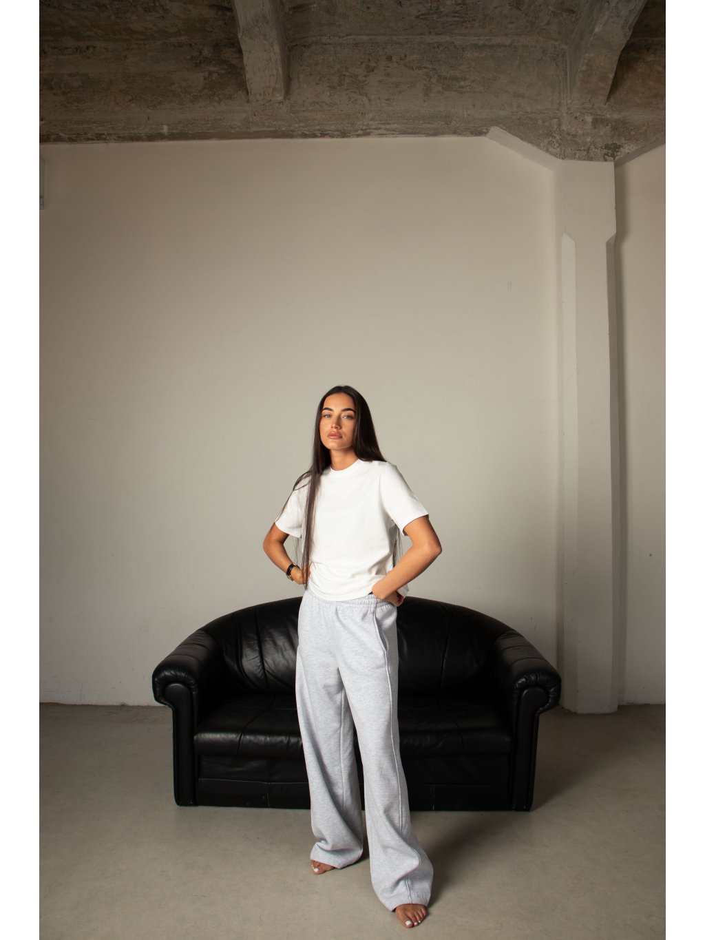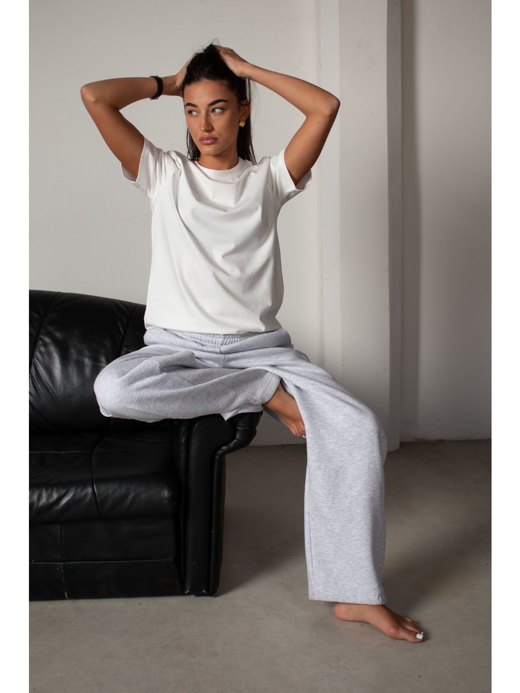 Bavlněné tričko volnějšího střihu, mírně spadené rukávy, délka pod pas, kulatý výstřih. Materiál má vysokou gramáž bavlny.