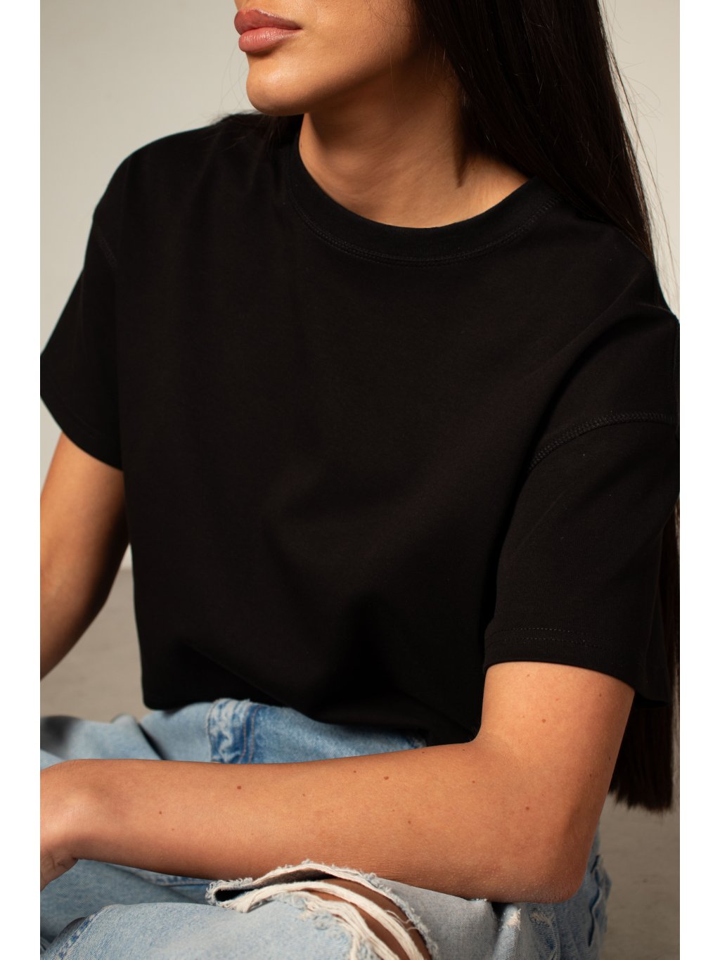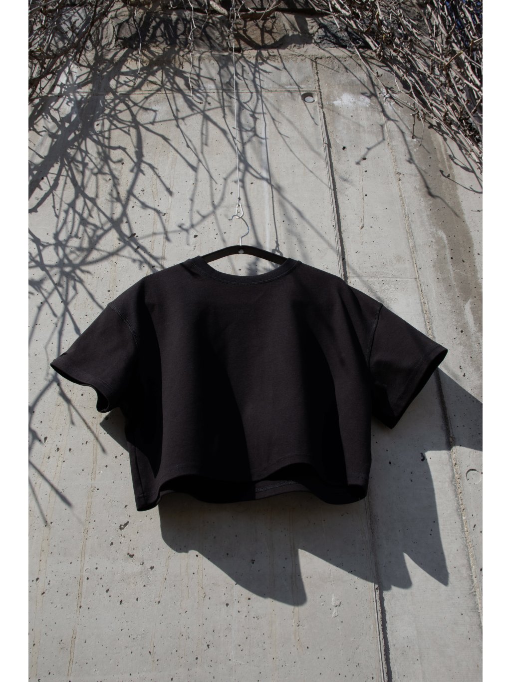 Bavlněné tričko volnějšího střihu, zkrácená - cropped délka, mírně spadené rukávy, kulatý výstřih. Materiál má vysokou gramáž bavlny.