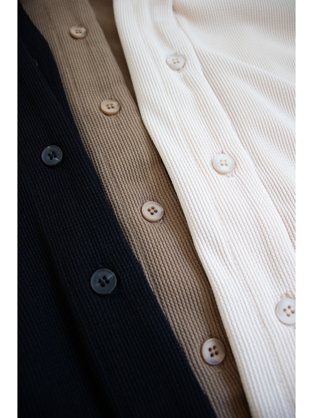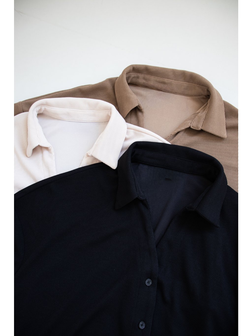 Kalhoty v pase na širší gumu se stahovacími šňůrkami, širší rovné nohavice. Košile s dlouhým rukávem, celopropínací na knoflíčky, límeček, výstřih do "V", rukáv ukončený úzkou manžetou na knoflíček, u manžety je mírné řasení. Zadní díl košile je delší. Materiál je lehký, splývavý.