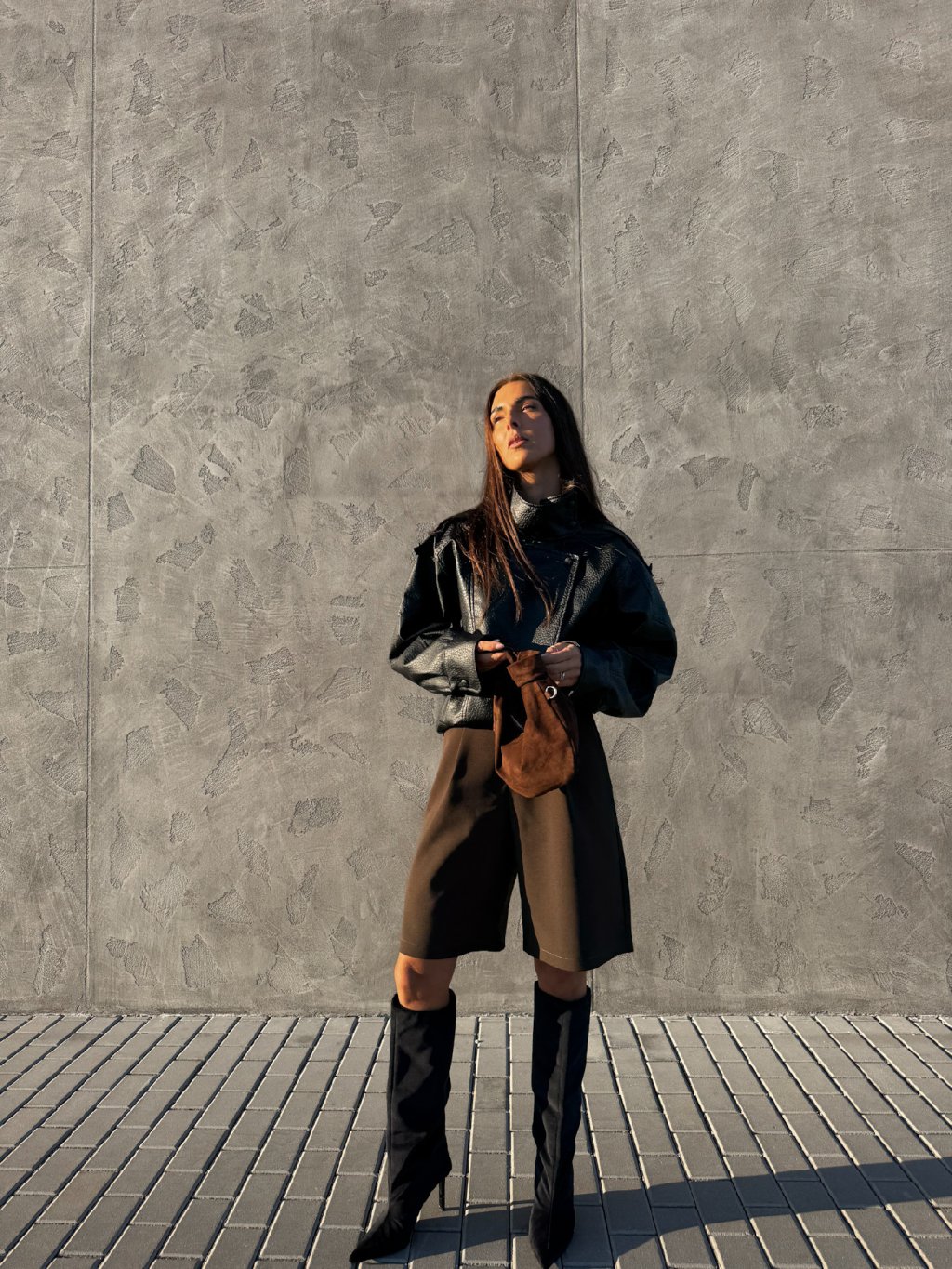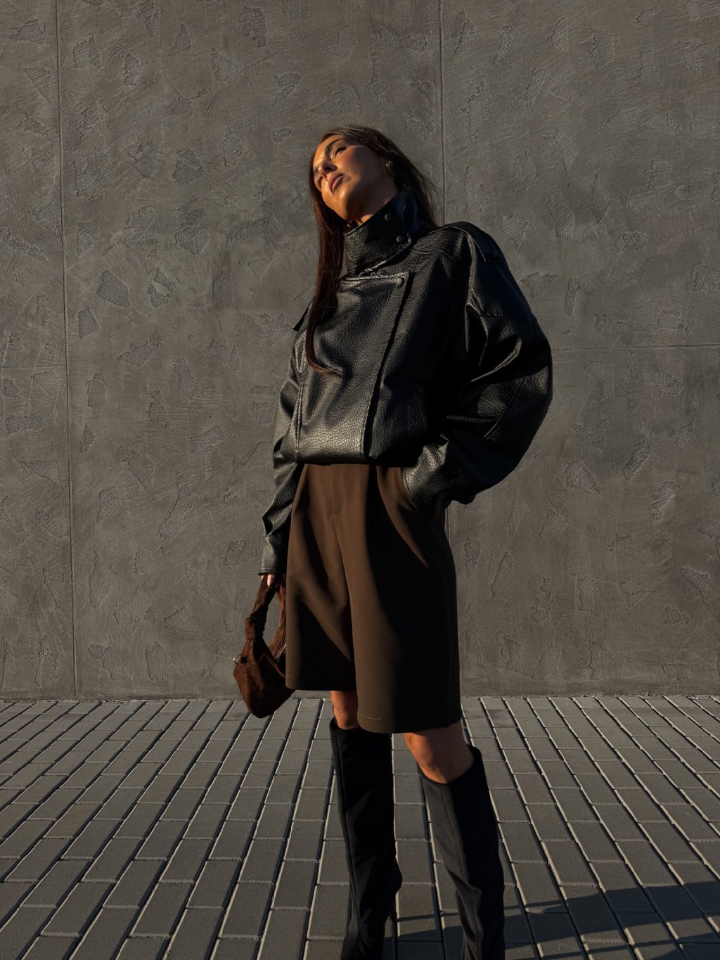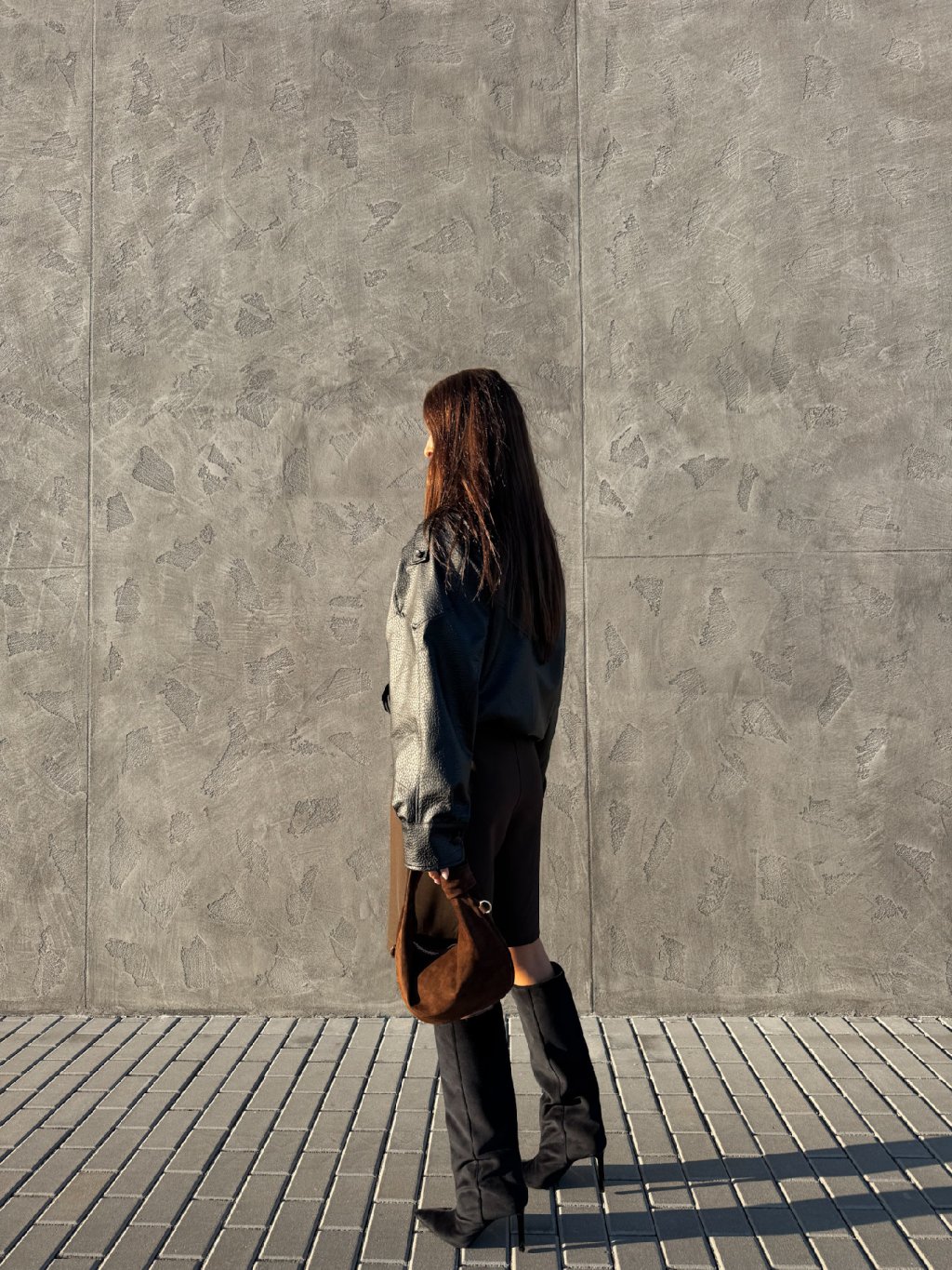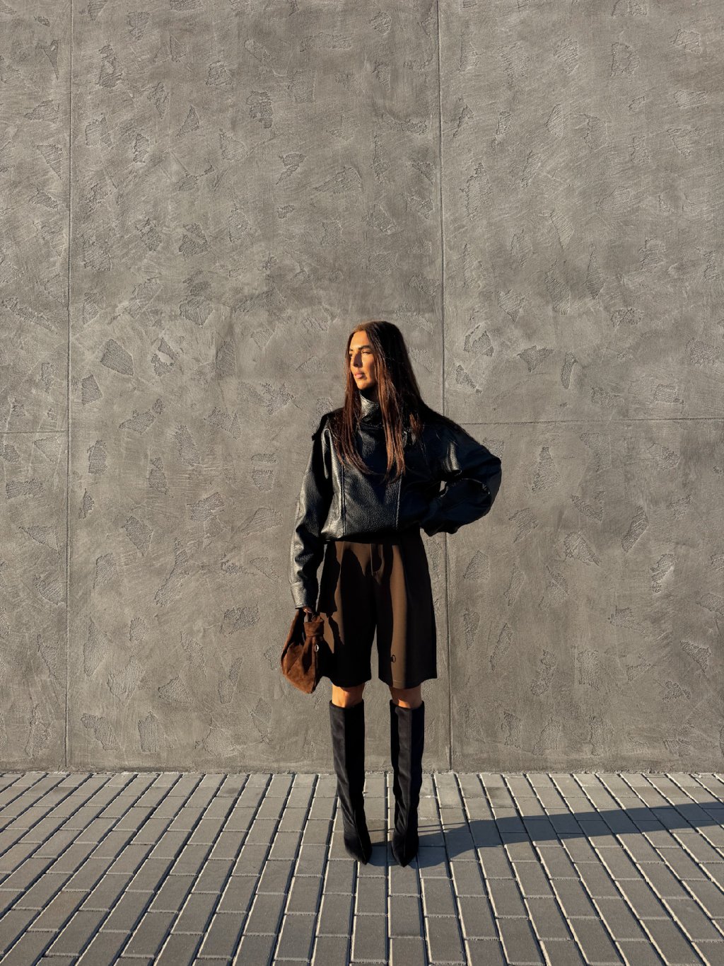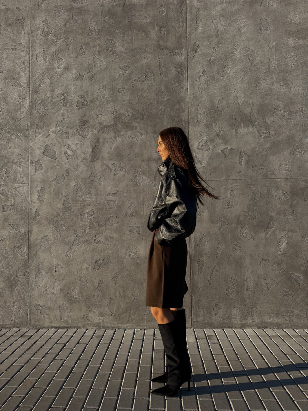 Modelka měří 173 cm, váha 56 kg. Běžně nosí velikost S/M a oversized oblečení L. |