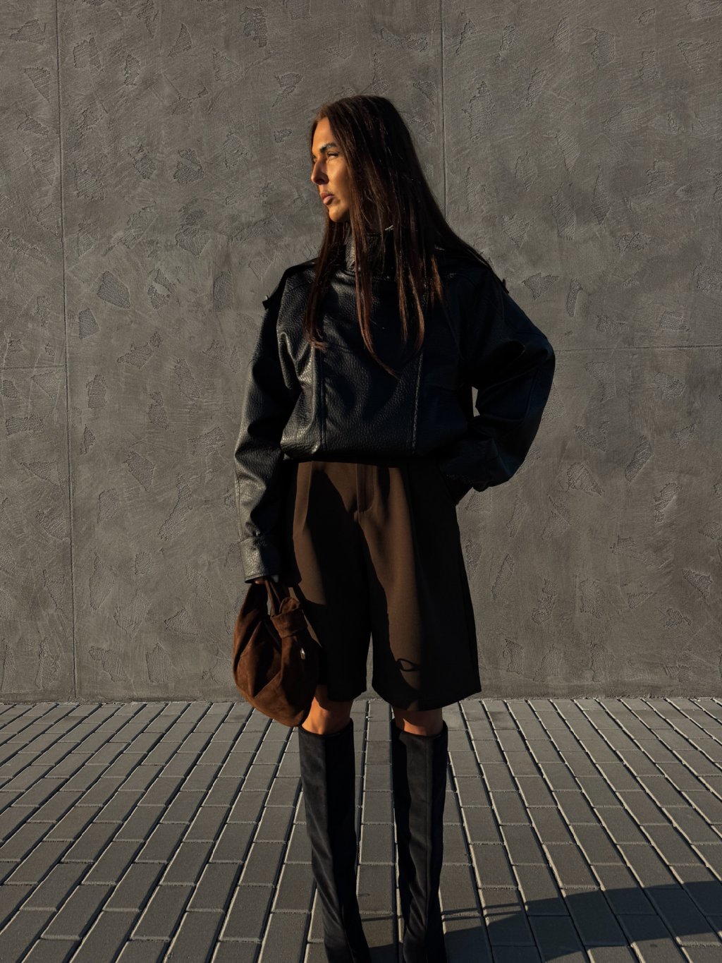 Bermudy s vyšším pasem, boční kapsy, vpředu nařasení/sámek, délka nad kolena, volnější střih, zapínání na zip a knoflík, poutka na pásek.
