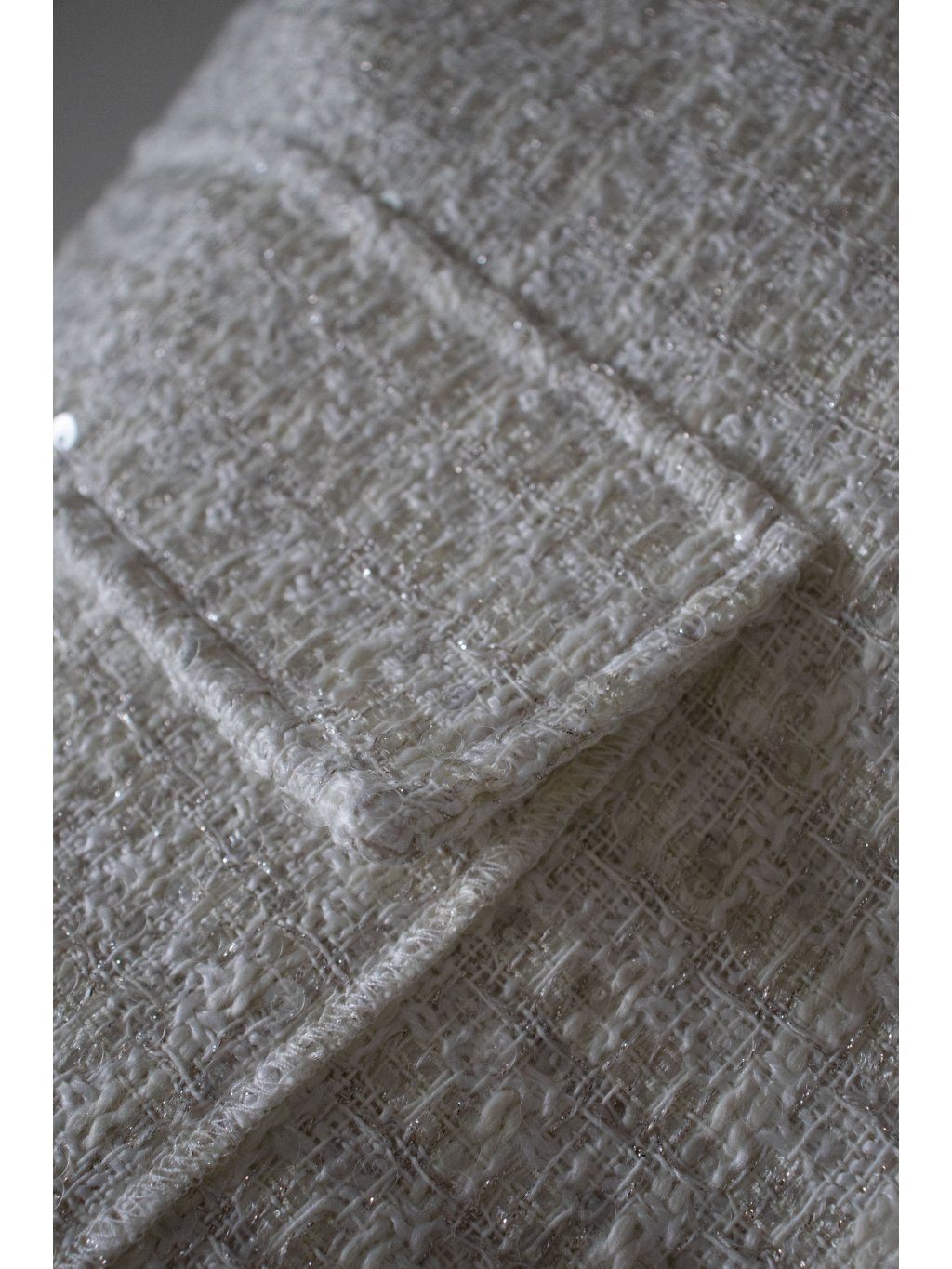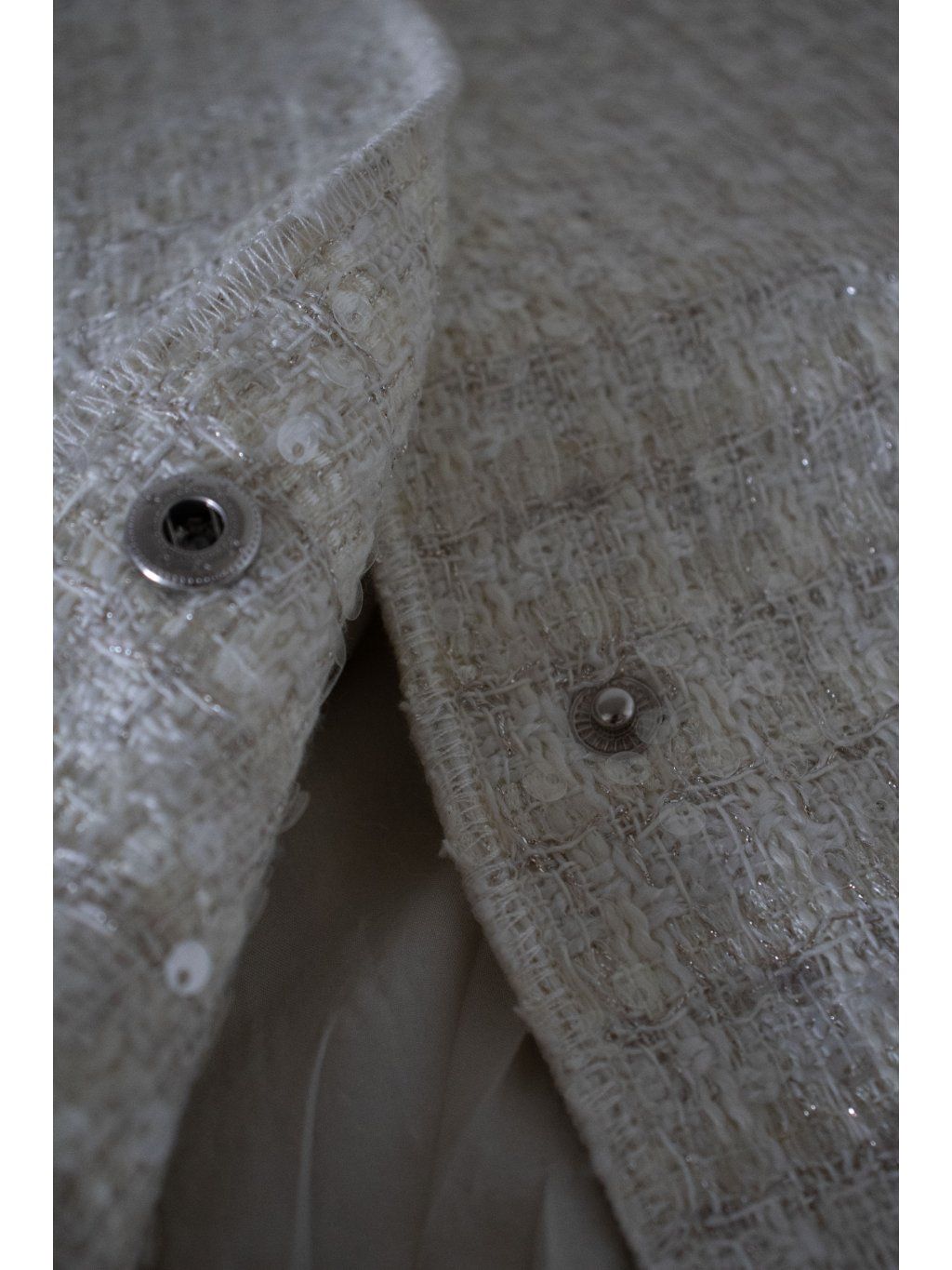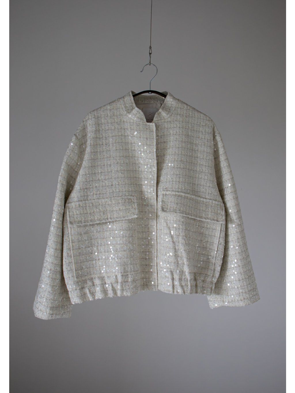 Bomber s jemnými flitry, délka do pasu, mírný stojáček, zapínání na cvoky, velké boční kapsy s klopou, dlouhý širší rukáv, podšívka, v pase je guma.