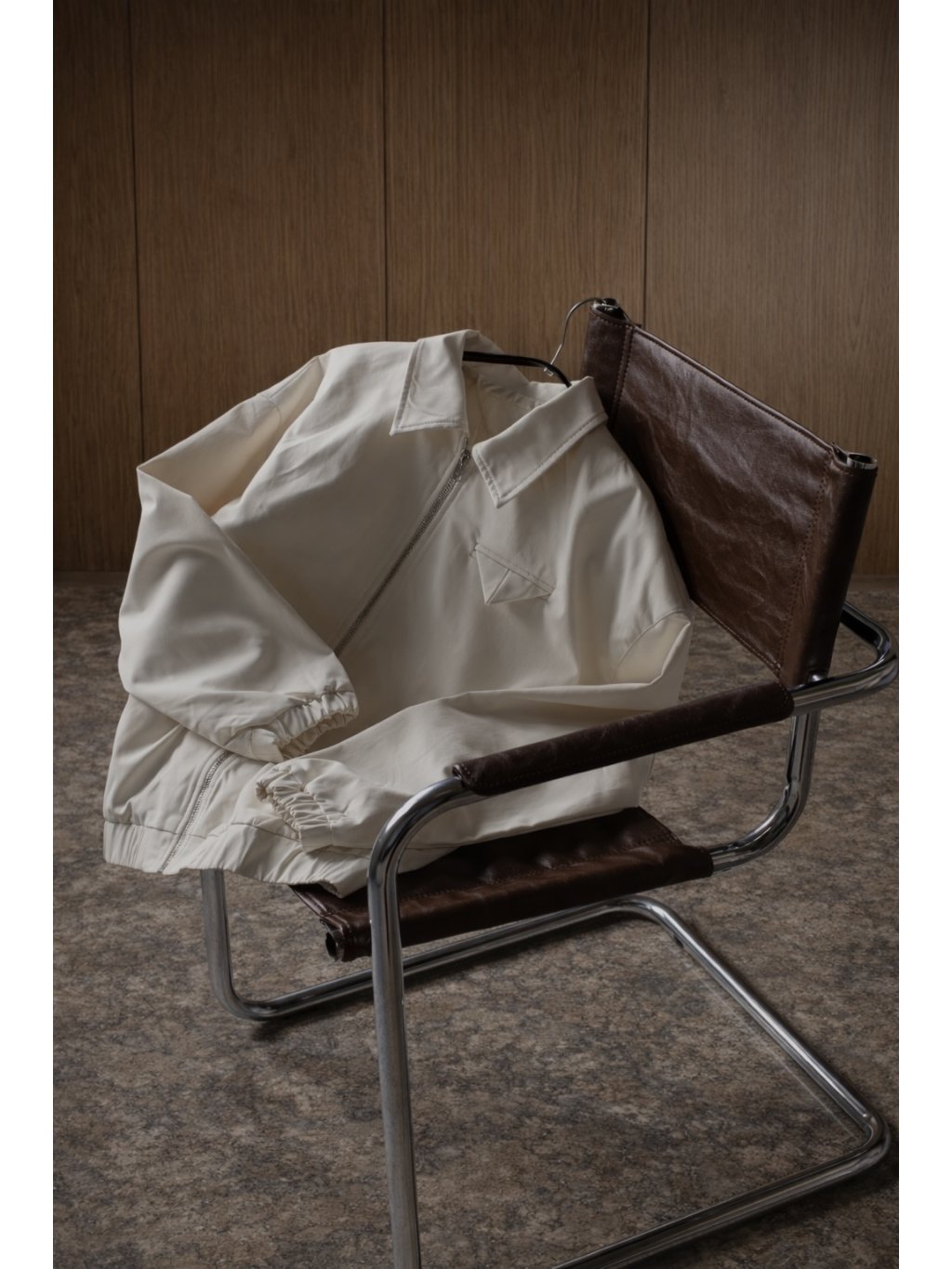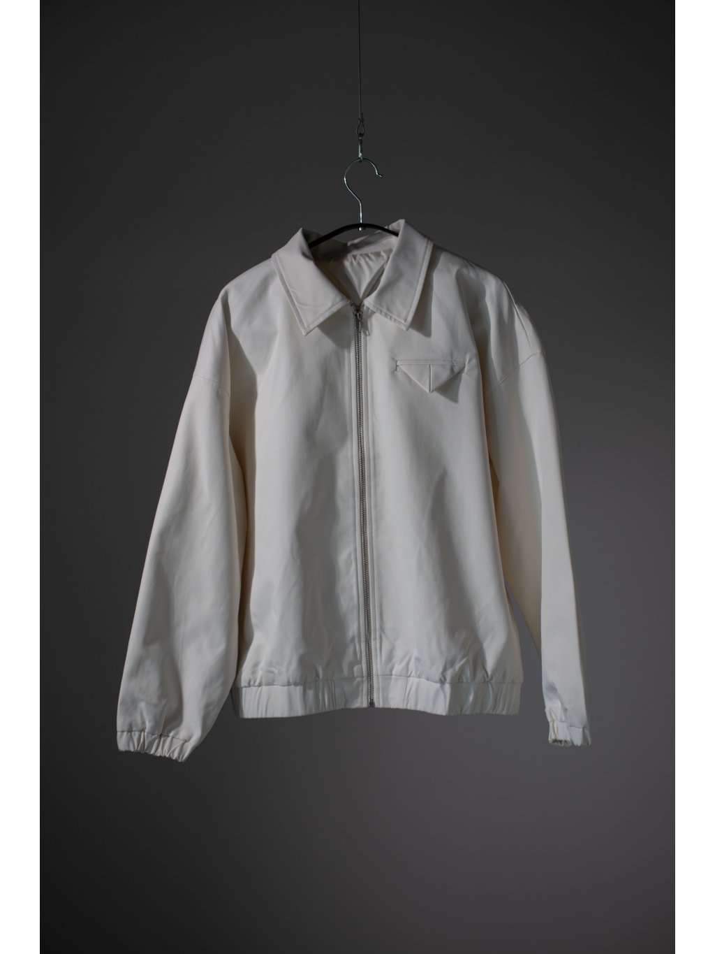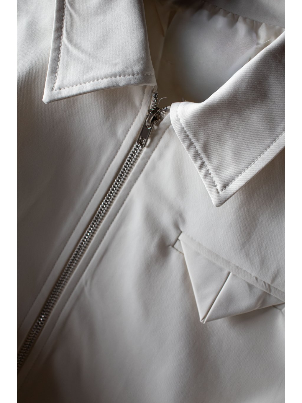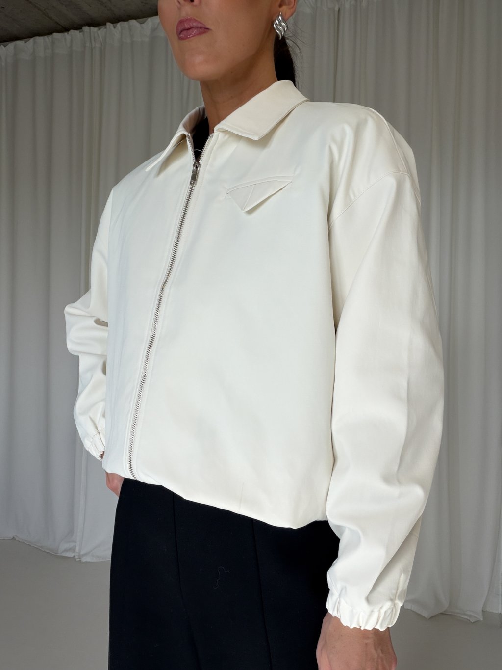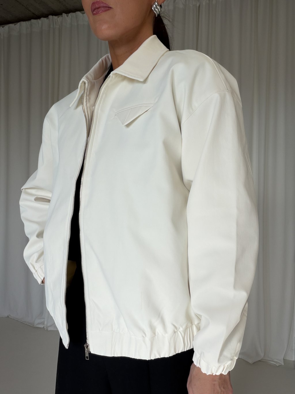 Bomber s límečkem, zapínání na zip ve stříbrné barvě, rukávy i spodní lem jsou do gumy, na levé straně detail kapsičky se skládanou klopou, podšívka.