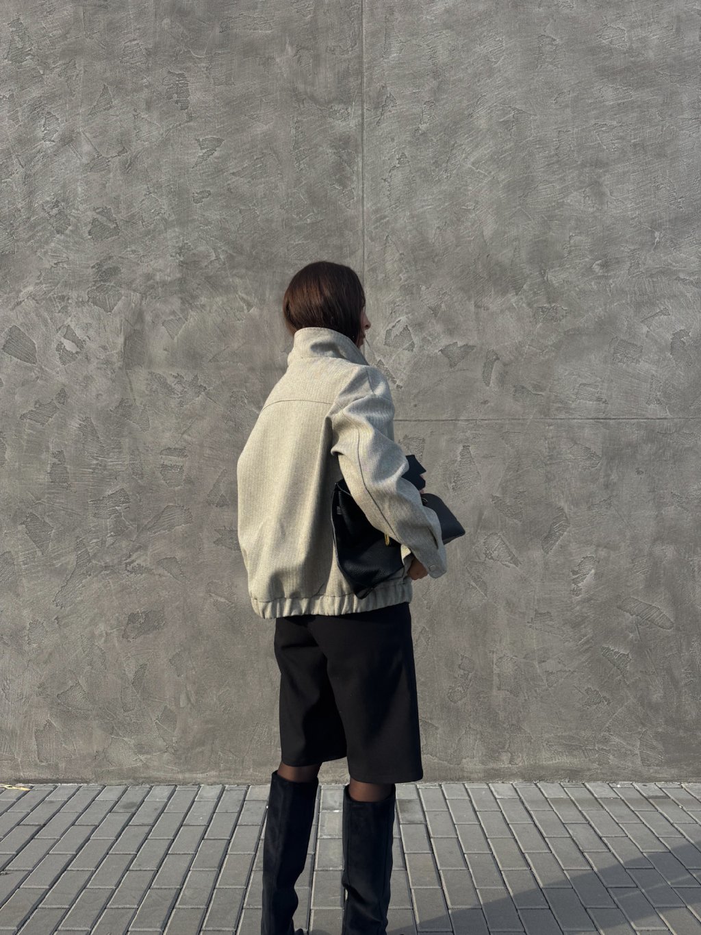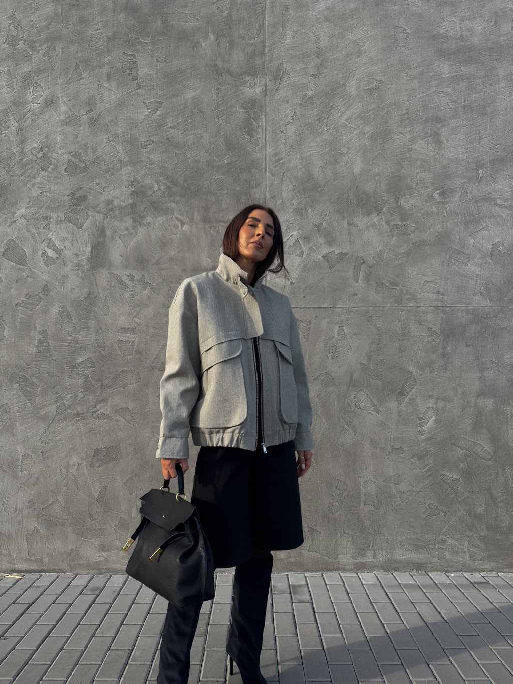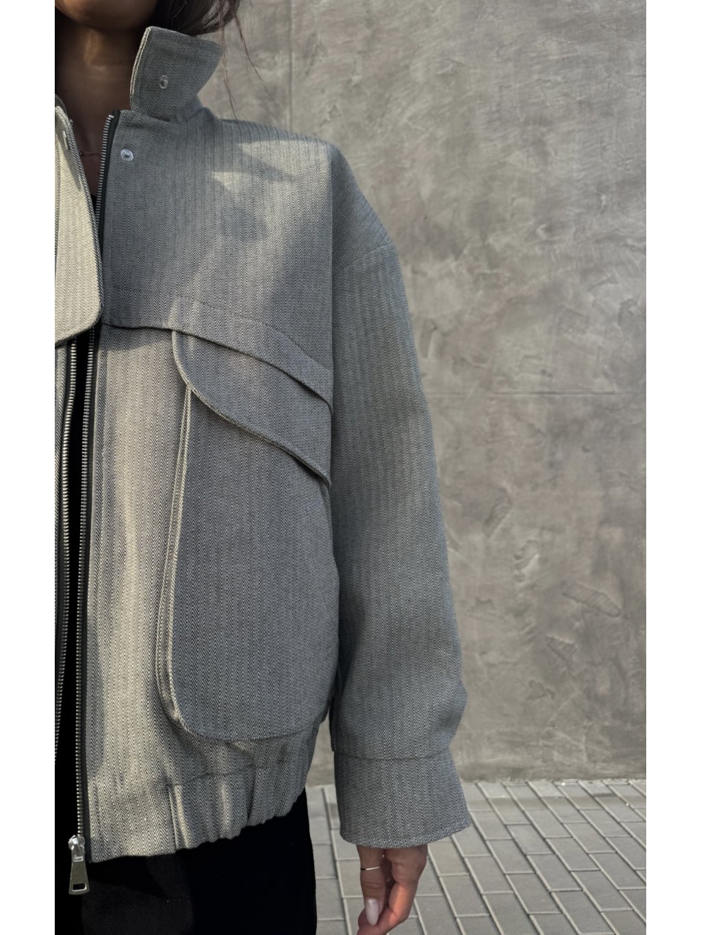 Tvídový bomber s jemným stromečkovým vzorem, velké přední kapsy s klopami, podšívka, zapínání na zip ve stříbrné barvě a krátkou klopu