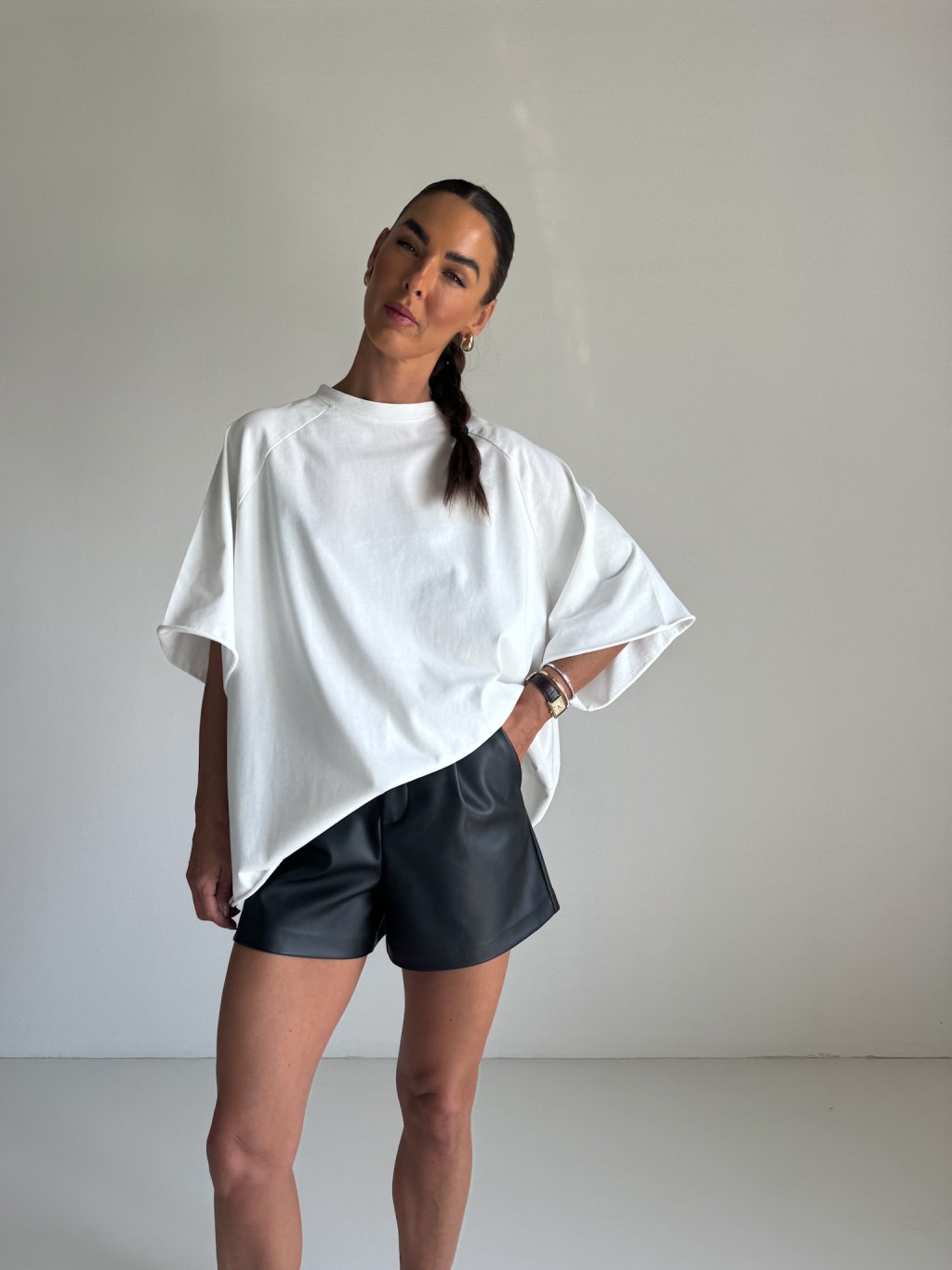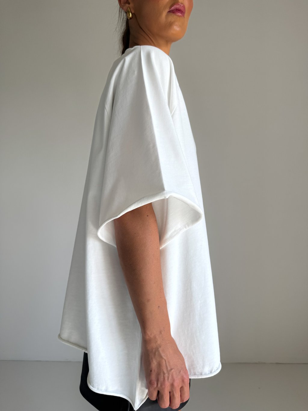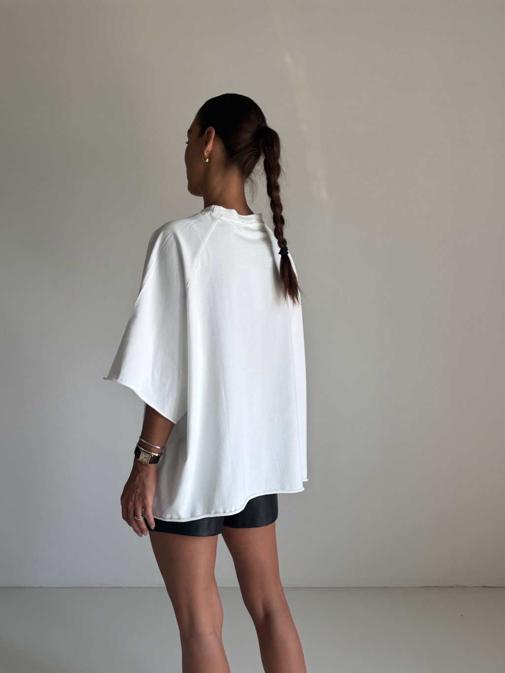 Boxy triko volného oversized střihu, nezačištěné okraje rukávů a spodní okraj. Vysokogramážní bavlna.