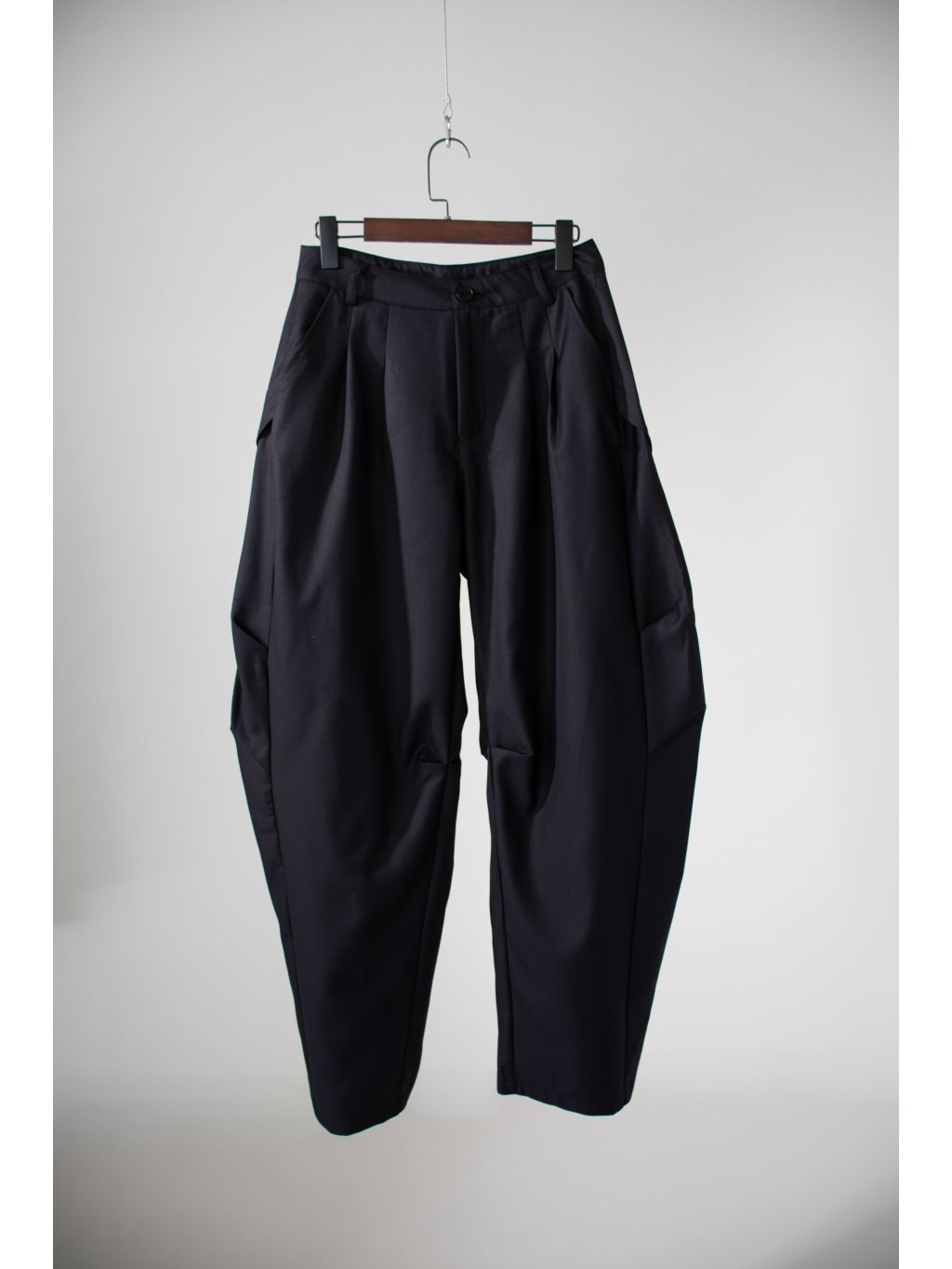 Kalhoty střihu cargo, široké balonové nohavice se sklady, boční kapsy, vpředu dva sámky, zapínání na zip a knoflík, vzadu šikmý šev se skladem a klopy - bez kapes.