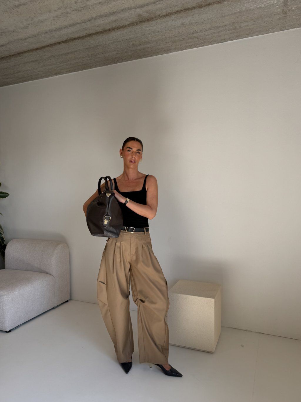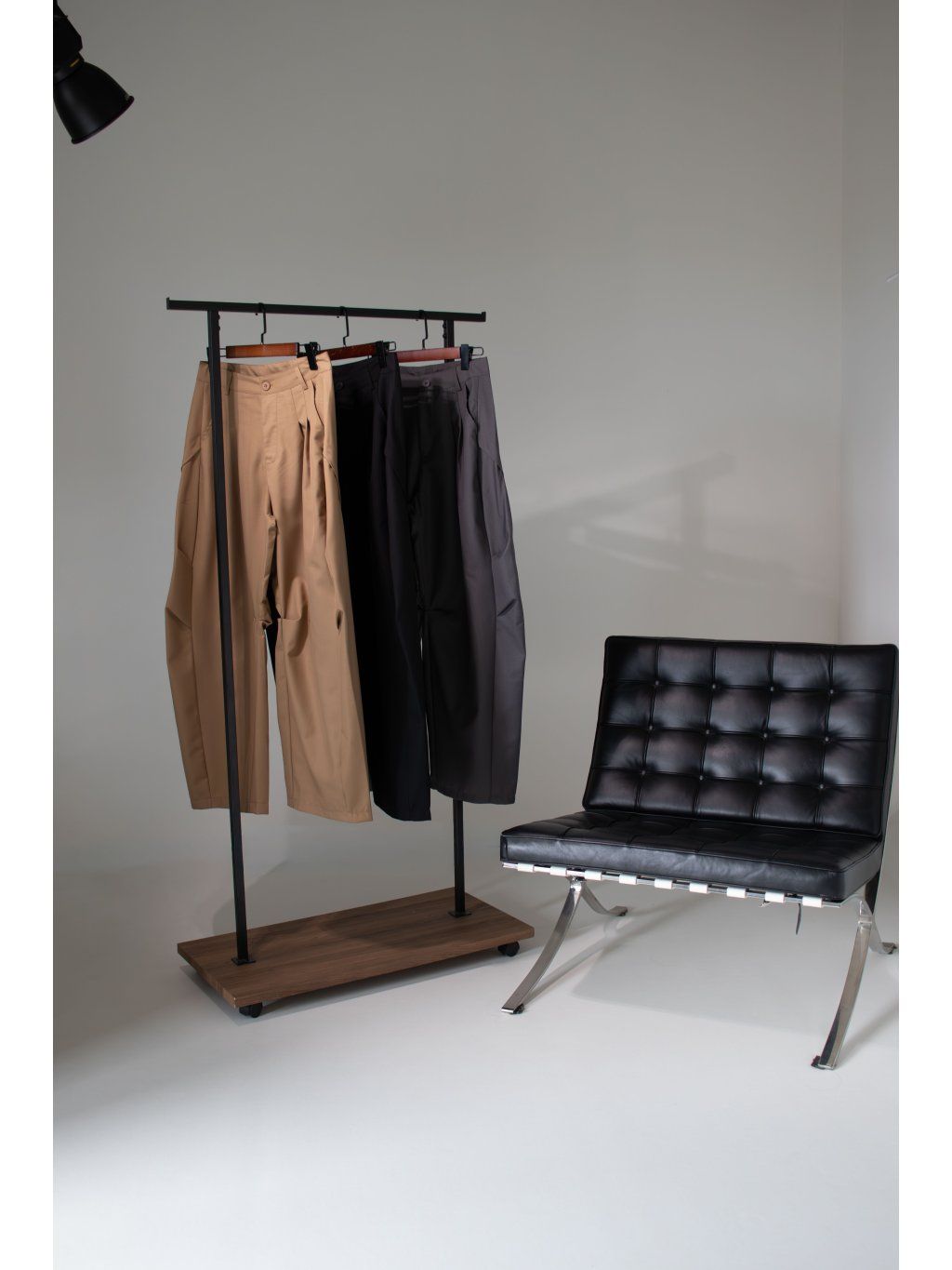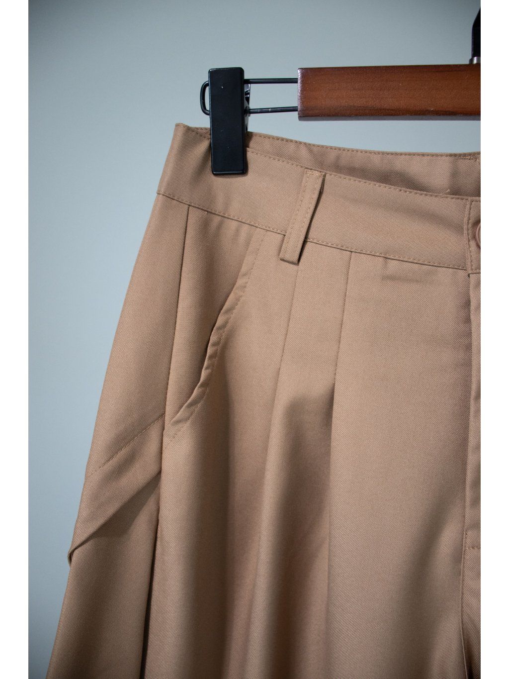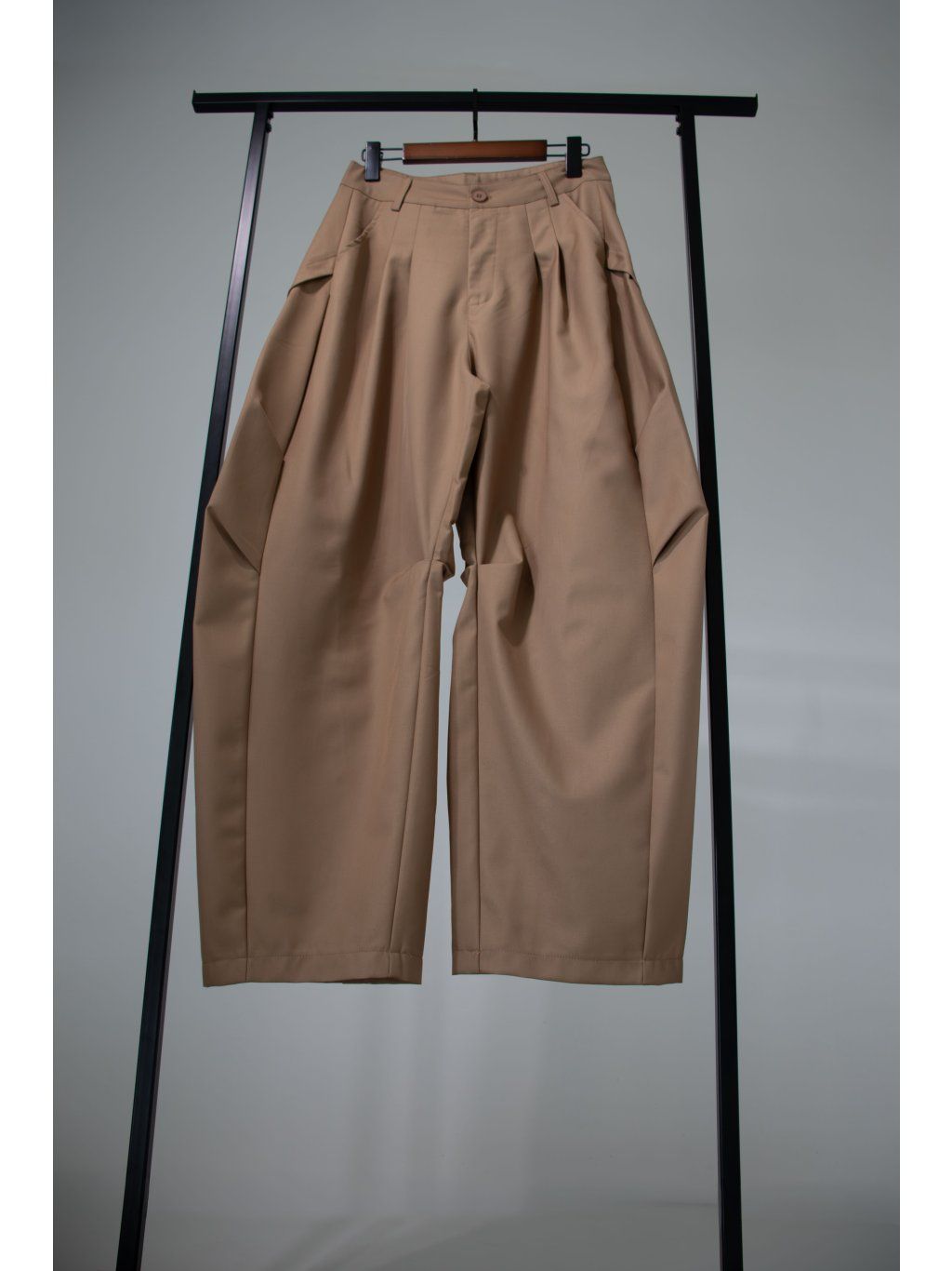 Kalhoty střihu cargo, široké balonové nohavice se sklady, boční kapsy, vpředu dva sámky, zapínání na zip a knoflík, vzadu šikmý šev se skladem a klopy - bez kapes.