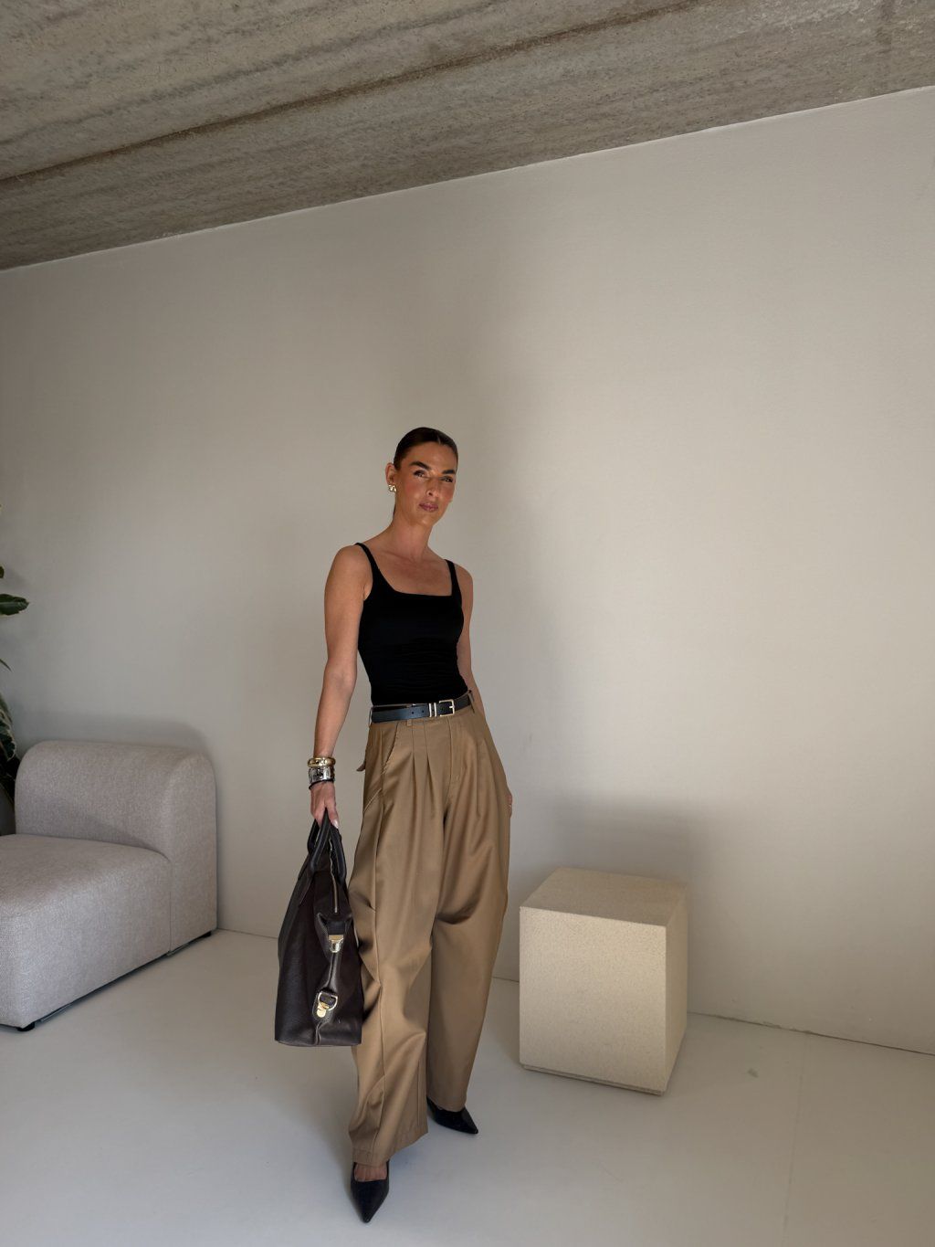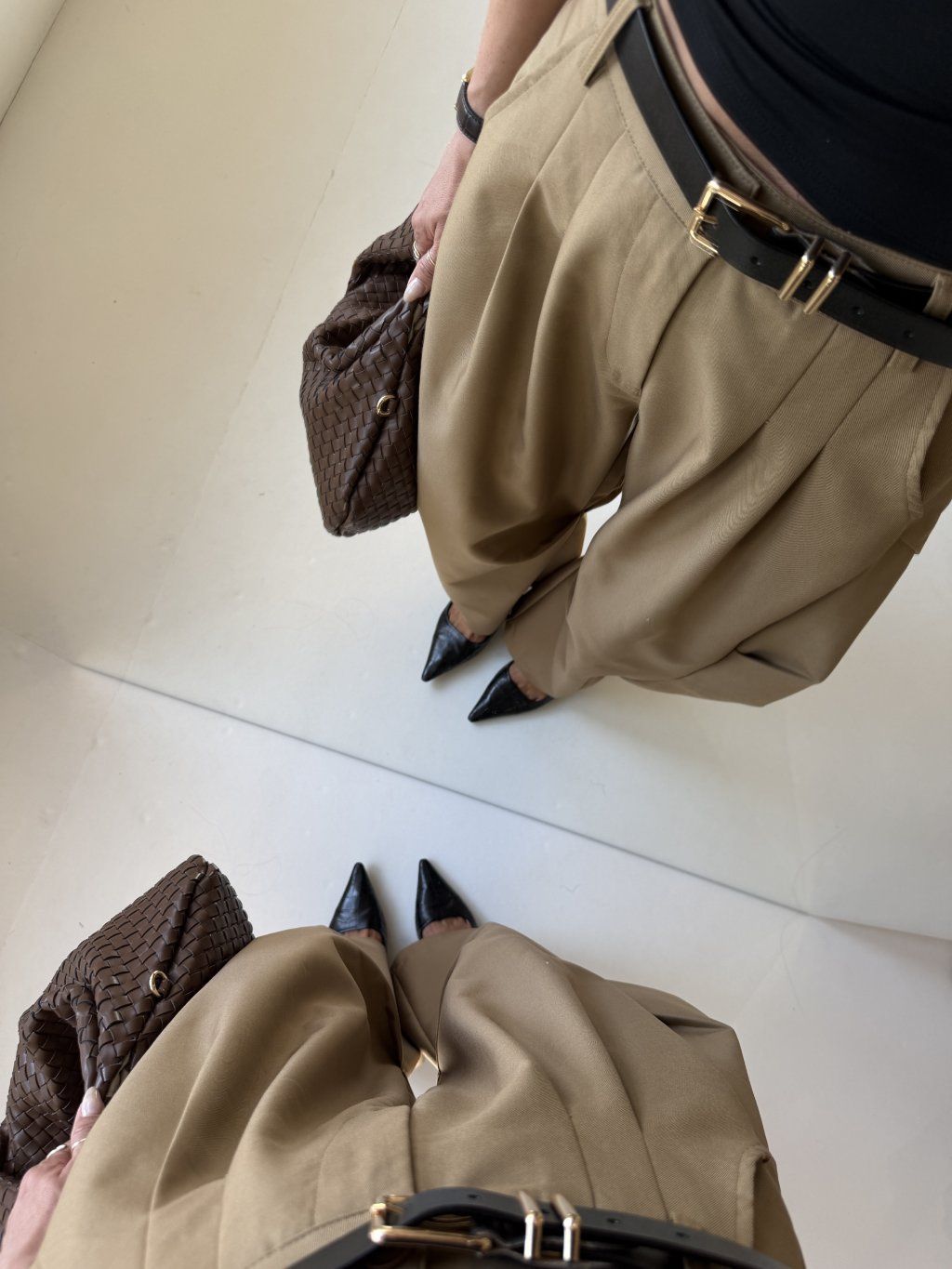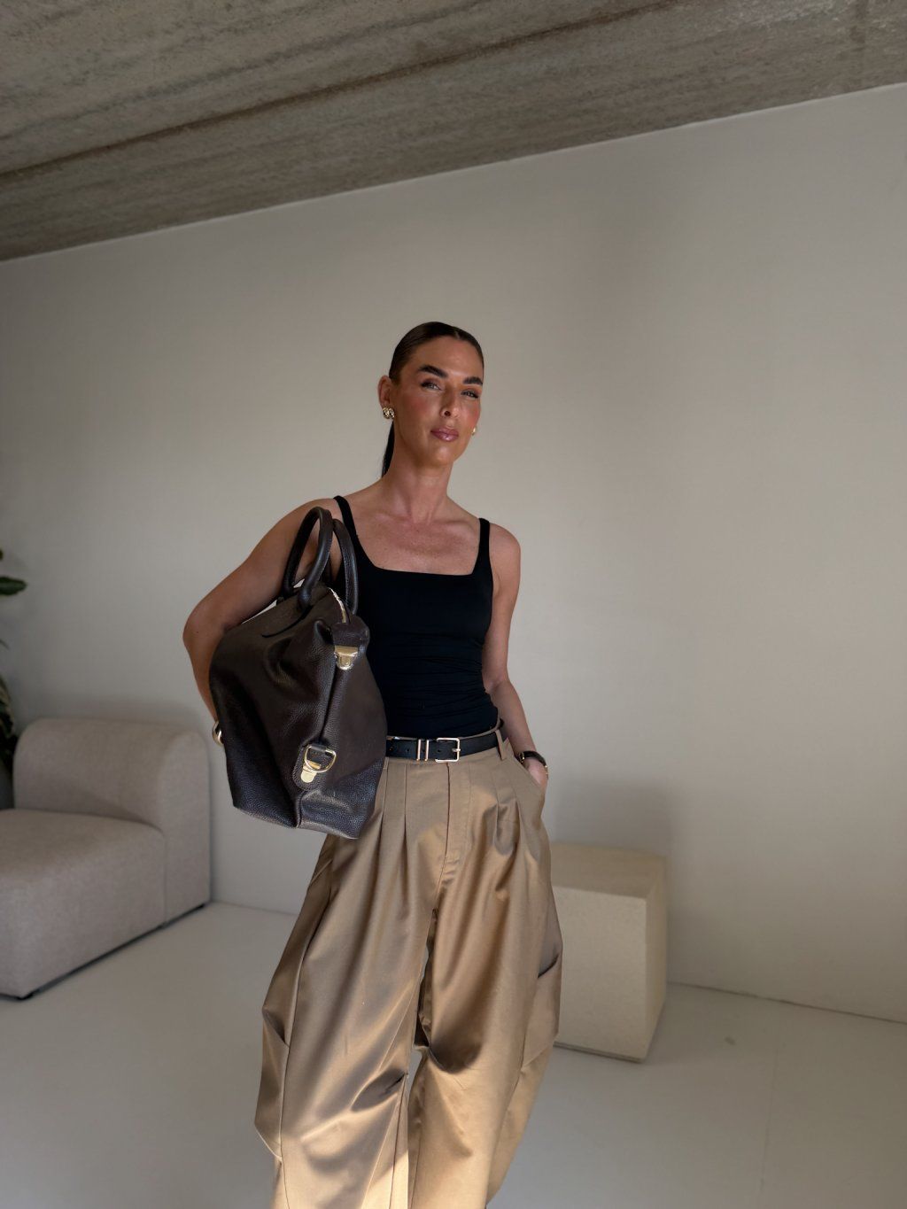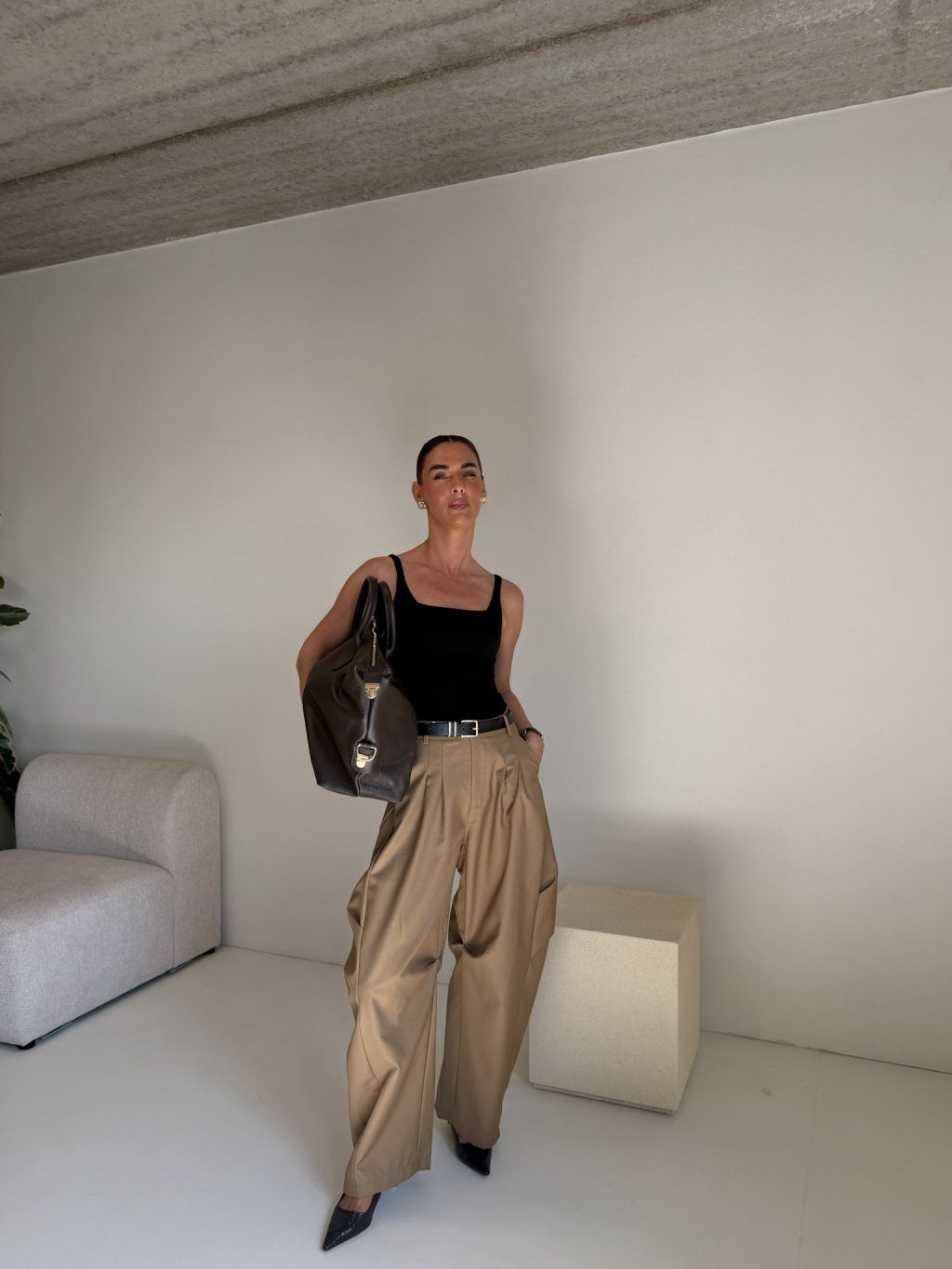 Kalhoty střihu cargo, široké balonové nohavice se sklady, boční kapsy, vpředu dva sámky, zapínání na zip a knoflík, vzadu šikmý šev se skladem a klopy - bez kapes.