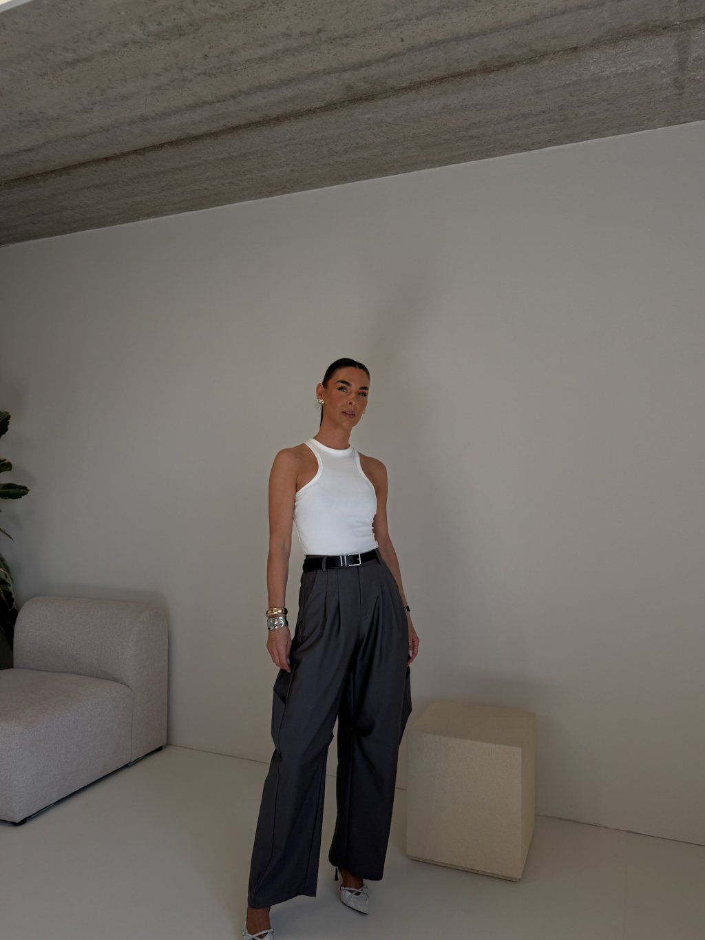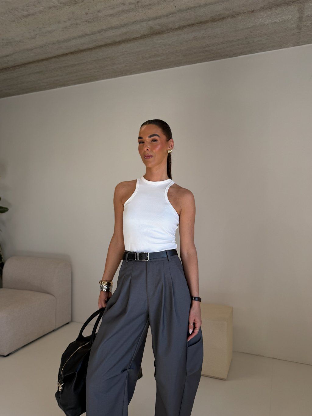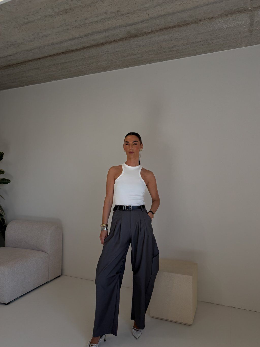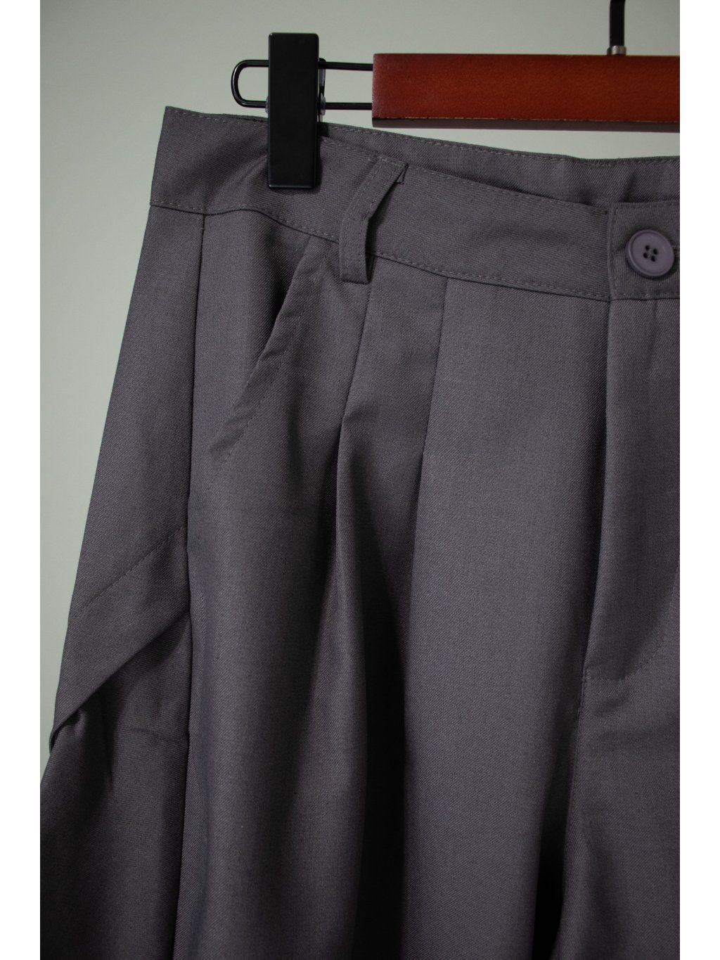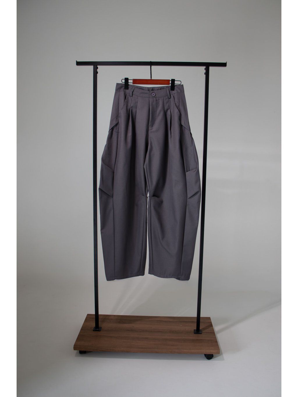 Kalhoty střihu cargo, široké balonové nohavice se sklady, boční kapsy, vpředu dva sámky, zapínání na zip a knoflík, vzadu šikmý šev se skladem a klopy - bez kapes.