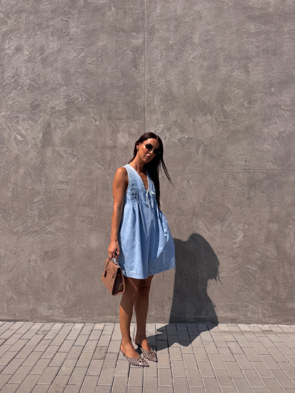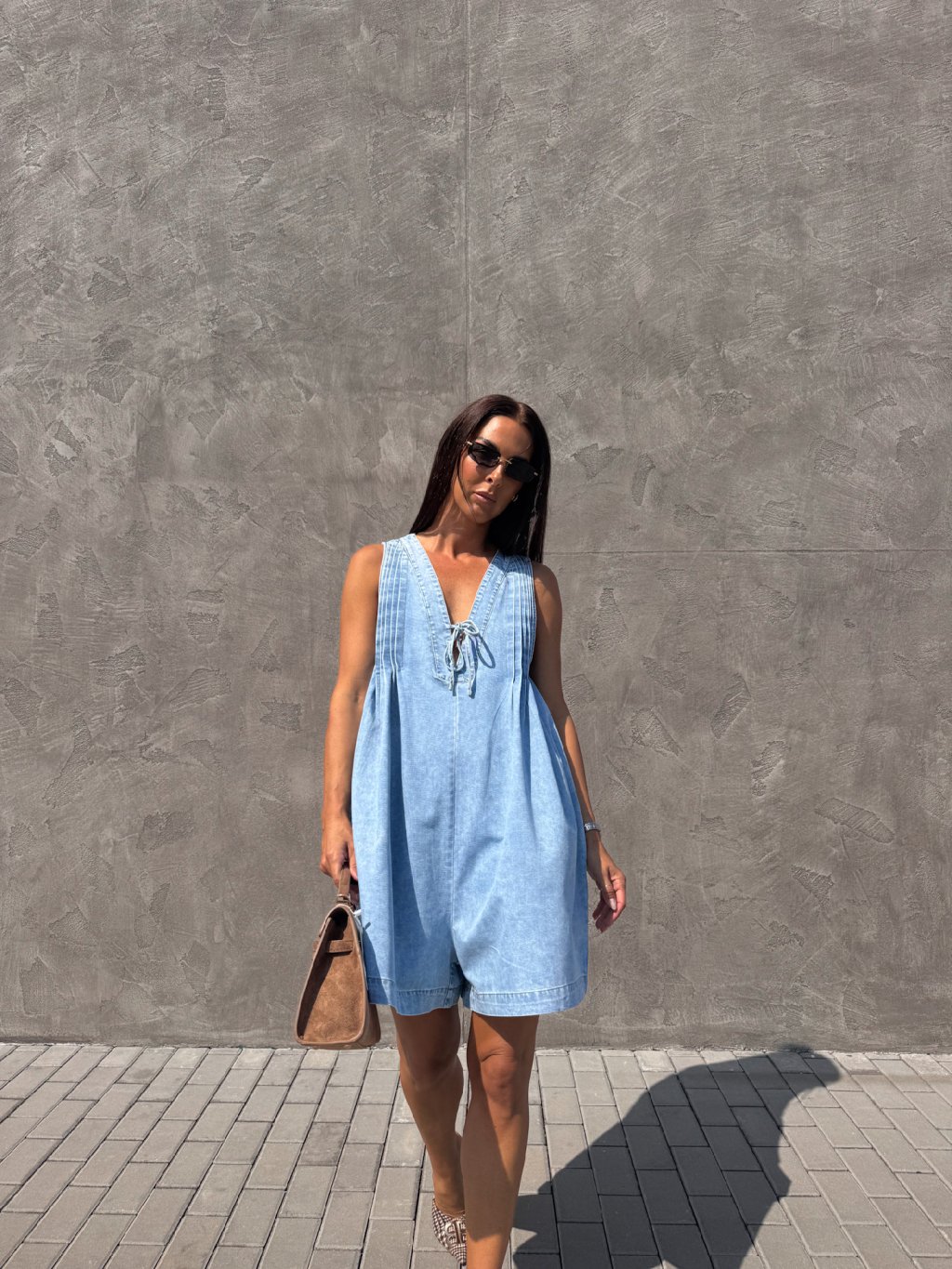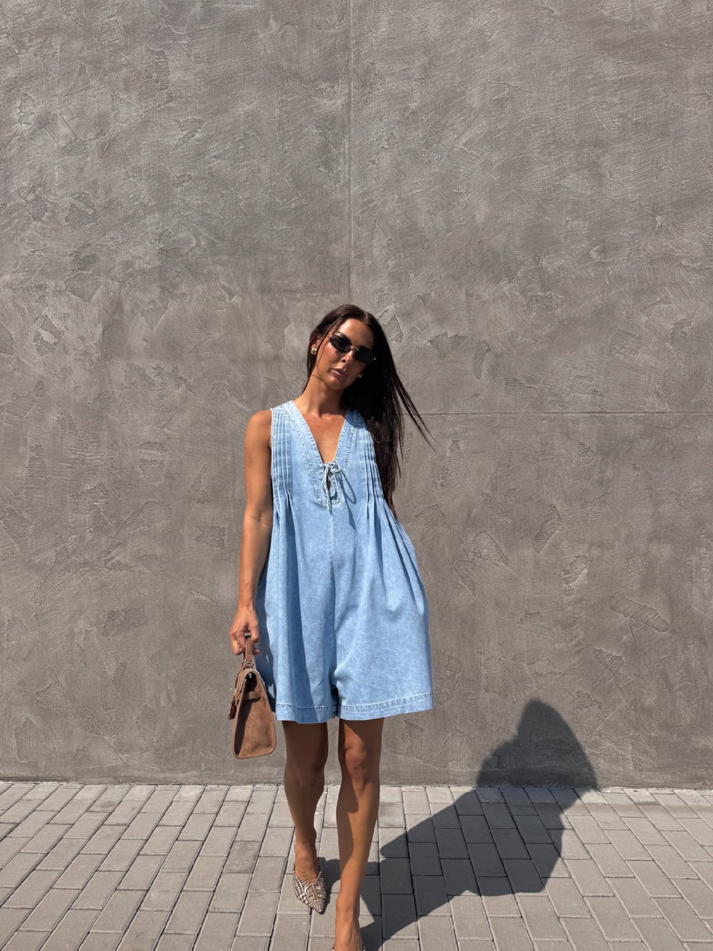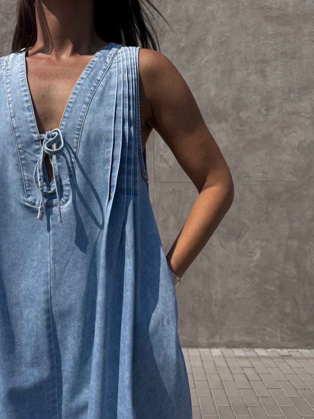 Denim overal bez rukávů, rozšiřující se střih, vpředu s výrazným řasením, hlubší výstřih do "V" na zavázání, boční kapsy, vzadu zapínání na zip.