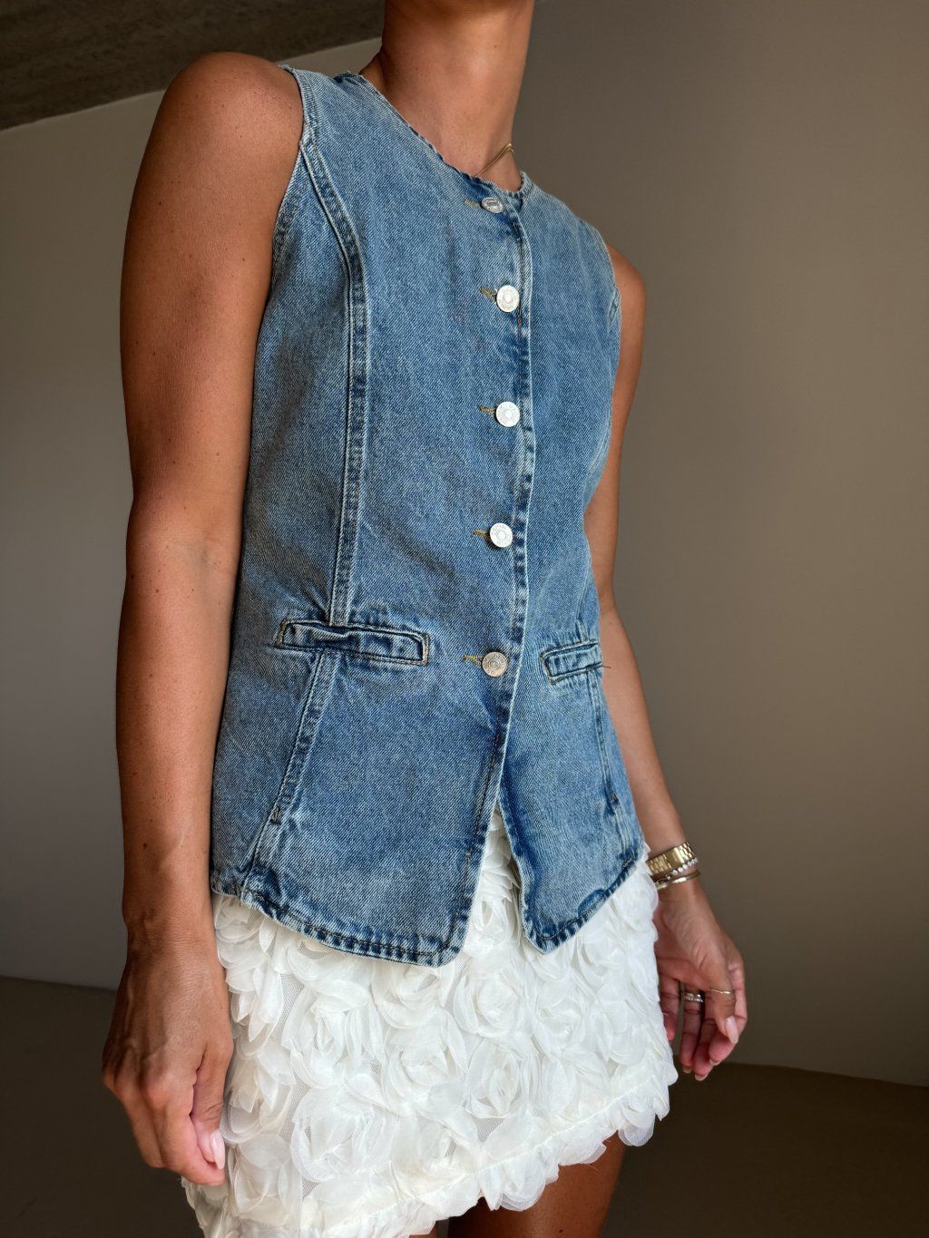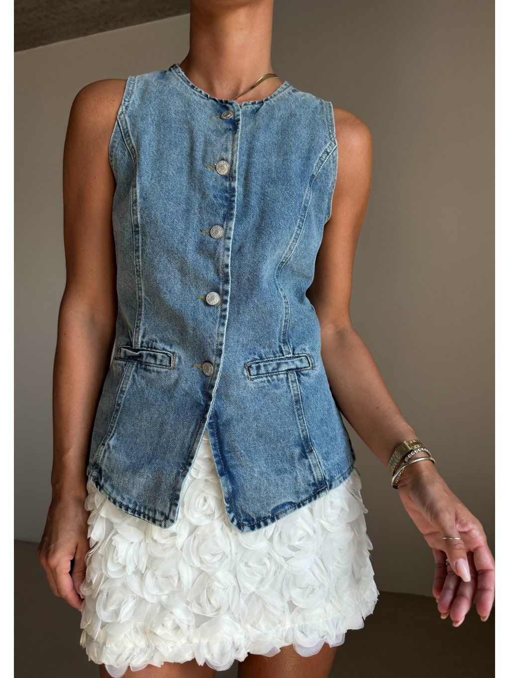 Vypasovaná vesta, pevný denim, prodloužená délka, kovový knoflík.