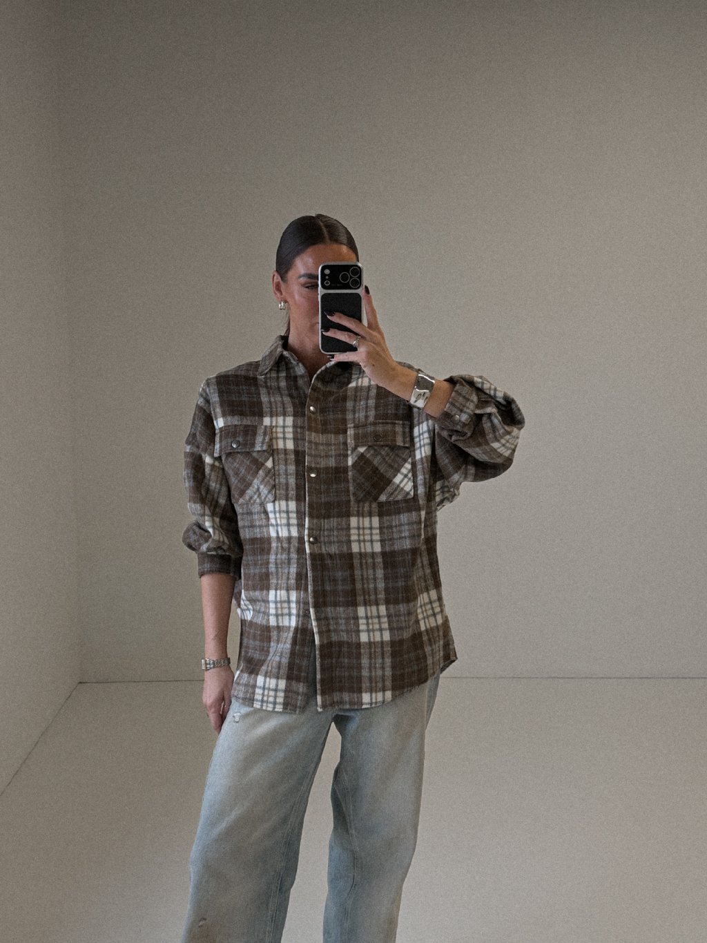 Flanelová košile s károvaným vzorem, široký střih, dlouhý spadený rukáv ukončený manžetou se cvočkem, celopropínací na cvoky, na prsou kapsy s klopami na cvoky, zadní díl košile je delší. Materiál je hebký.
