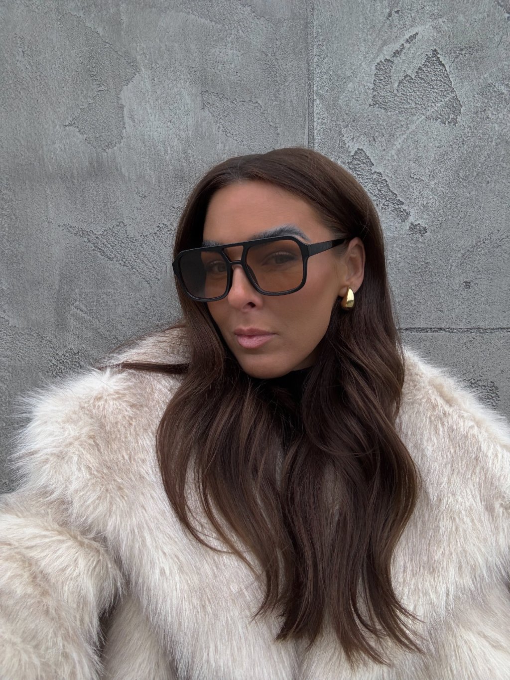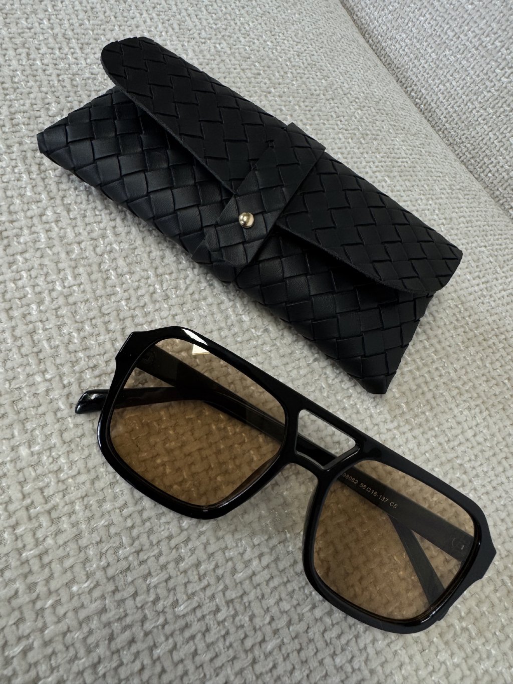 Velké hranaté brýle, černá obruba, oranžová skla.