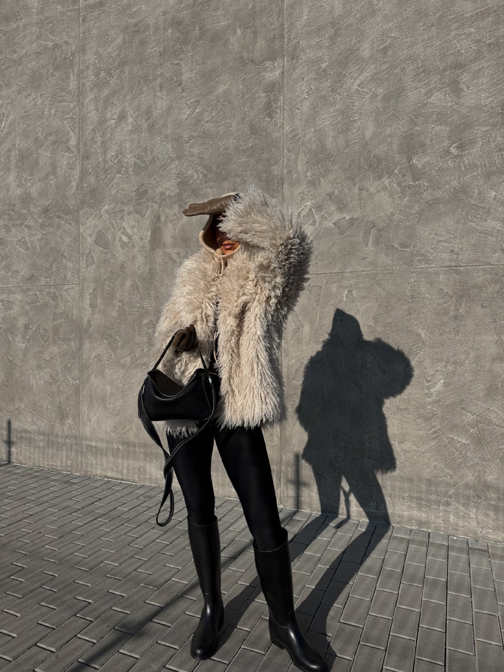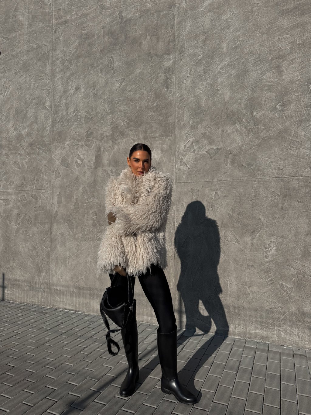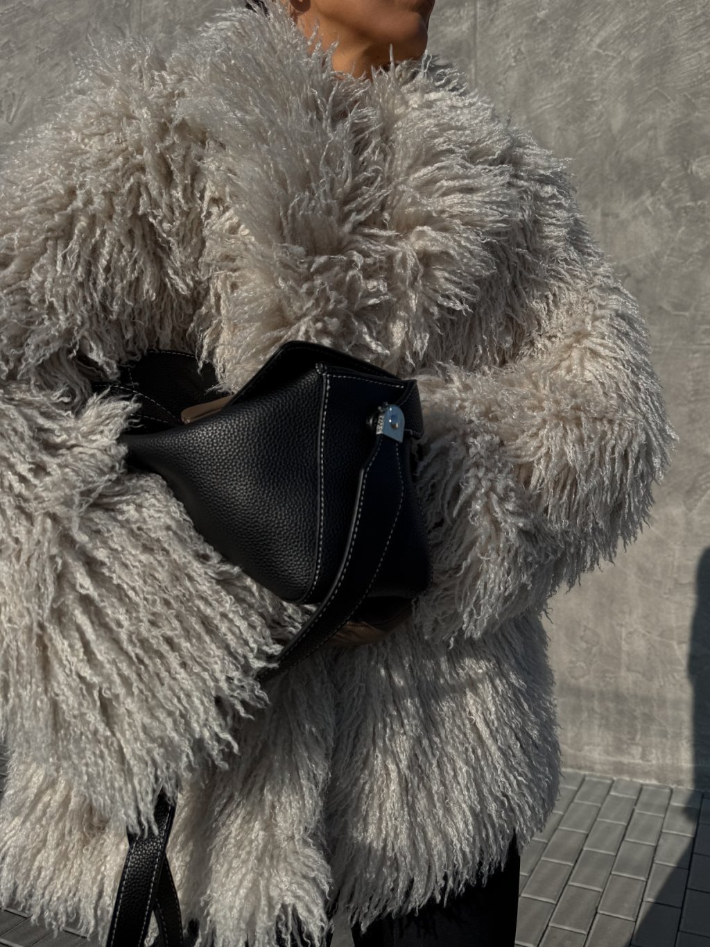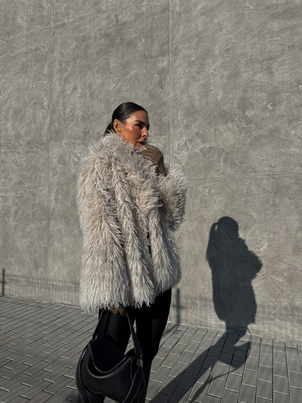 Kožíšek s dlouhým chlupem podobným mongolské ovci, prodloužená délka, výrazný límec, zapínání na háčky. Měkký příjemný materiál, podšívka, boční kapsy.