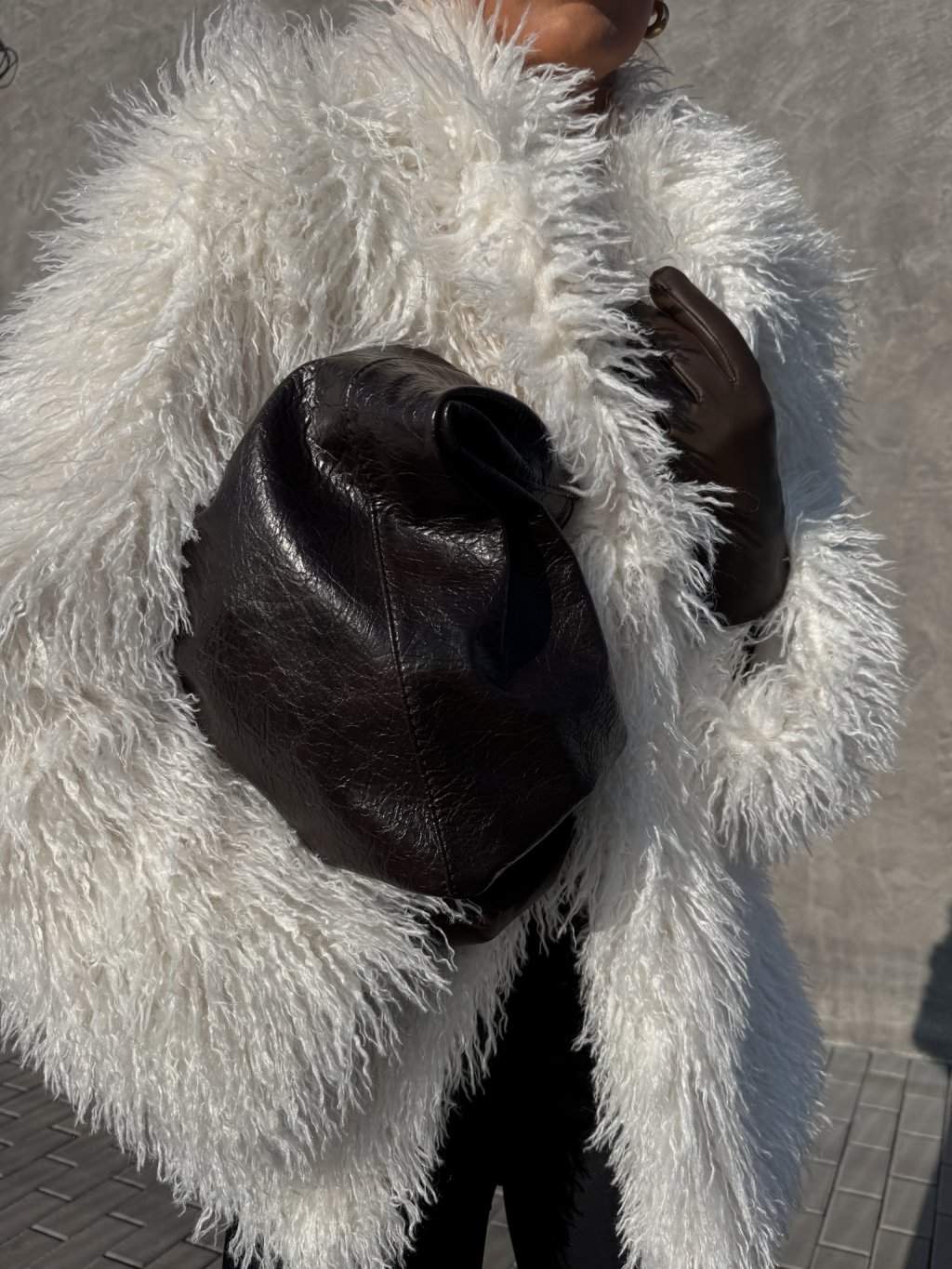 Kožíšek s dlouhým chlupem podobným mongolské ovci, prodloužená délka, výrazný límec, zapínání na háčky. Měkký příjemný materiál, podšívka, boční kapsy.