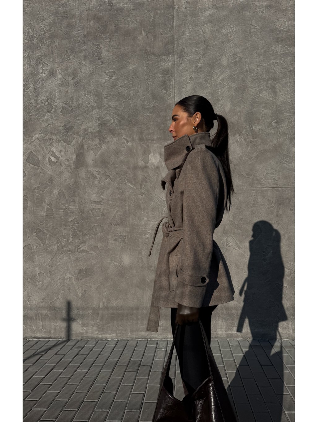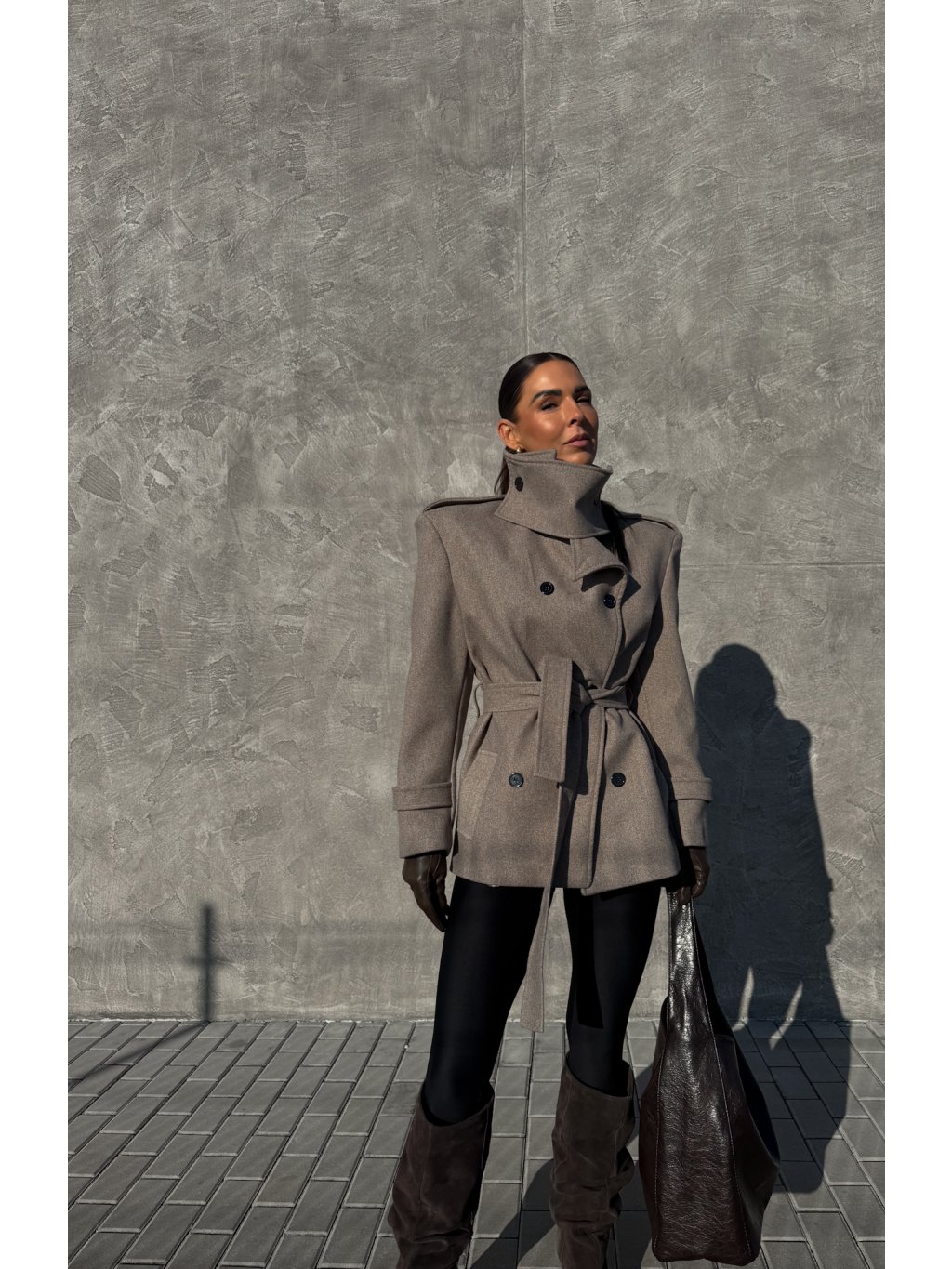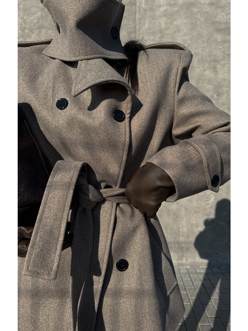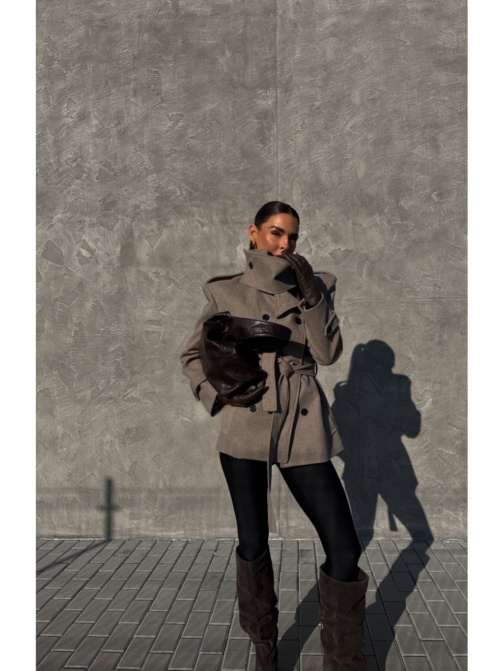 Flaušový kabátek, prodloužená délka - do půli stehen, dvouřadé zapínání na černý knoflík, ramenní vycpávky a výložky, výrazný límec/stojáček. Na rukávech krátký pásek s knoflíkem, boční kapsy, podšívka, opasek ze stejného materiálu.