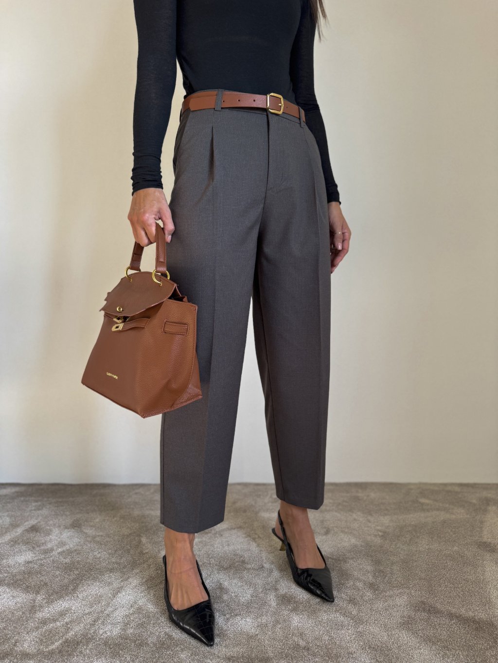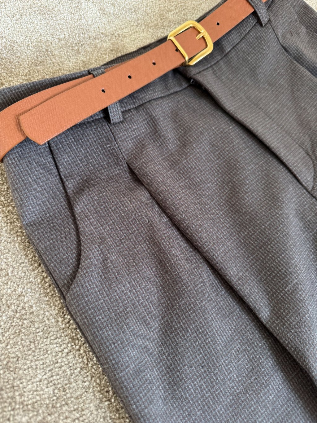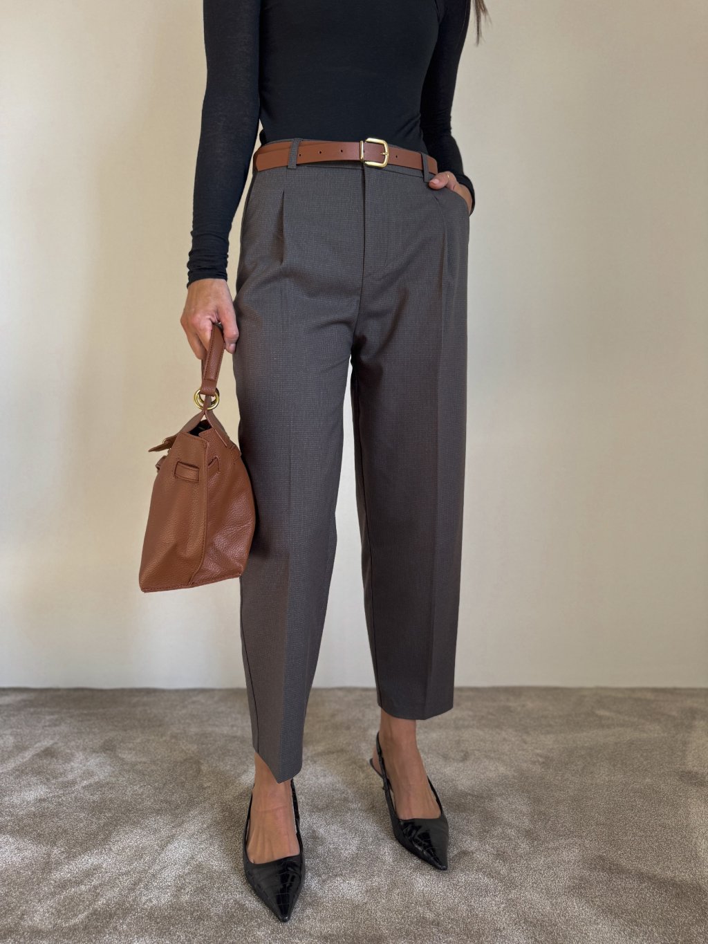 Kalhoty s délkou ke kotníkům, mírně nabrané, postupně se rozšiřují a ke kotníkům zužují. Součástí je opasek v barvě camel.