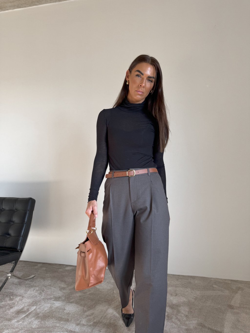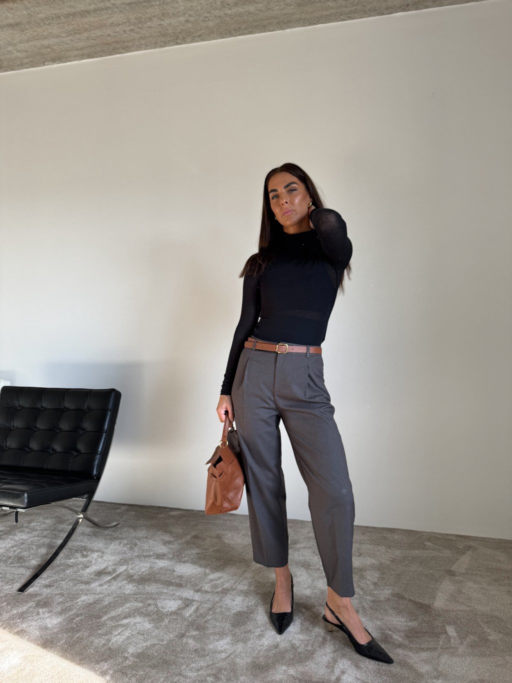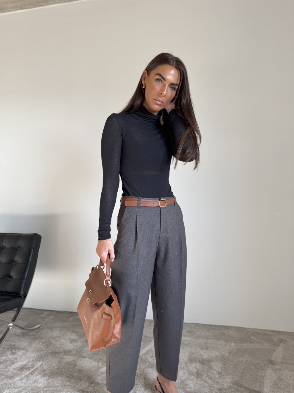 Kalhoty s délkou ke kotníkům, mírně nabrané, postupně se rozšiřují a ke kotníkům zužují. Součástí je opasek v barvě camel.
