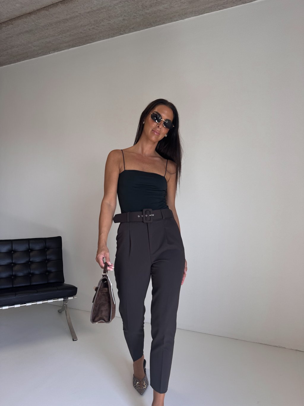 Elegantní kalhoty, úzký střih, boční kapsy, zapínání na zip a háčky, součástí je pásek se sponou.