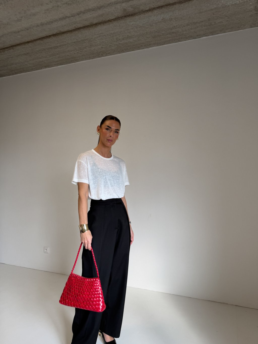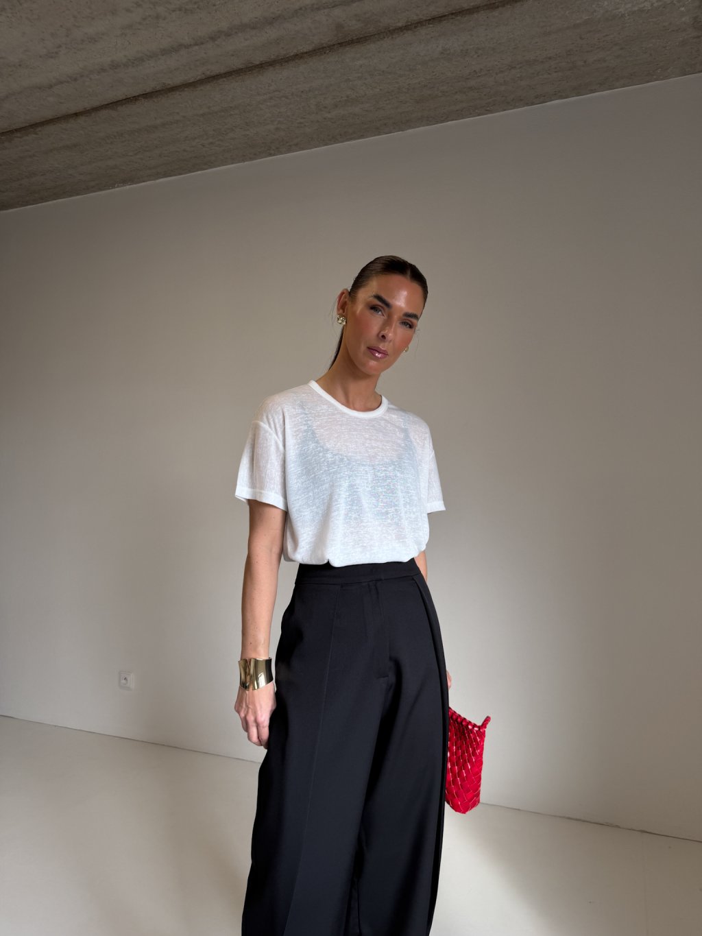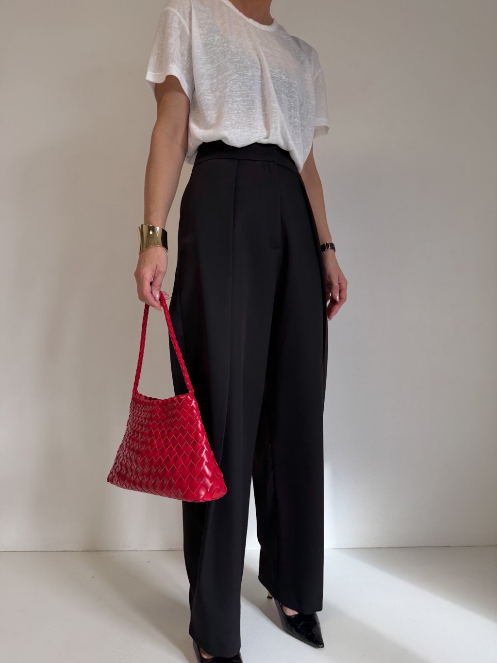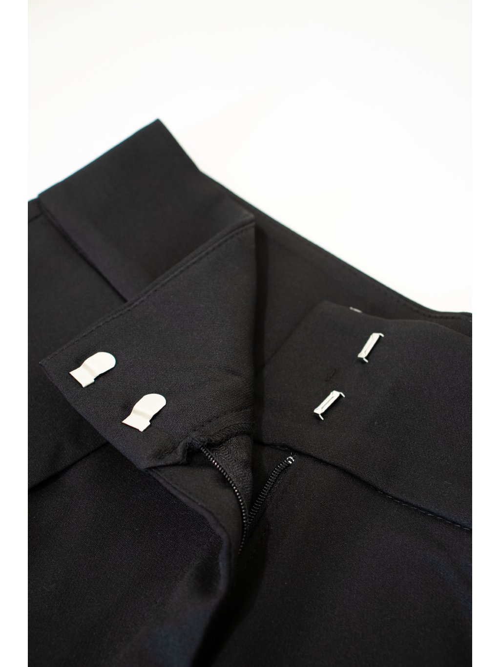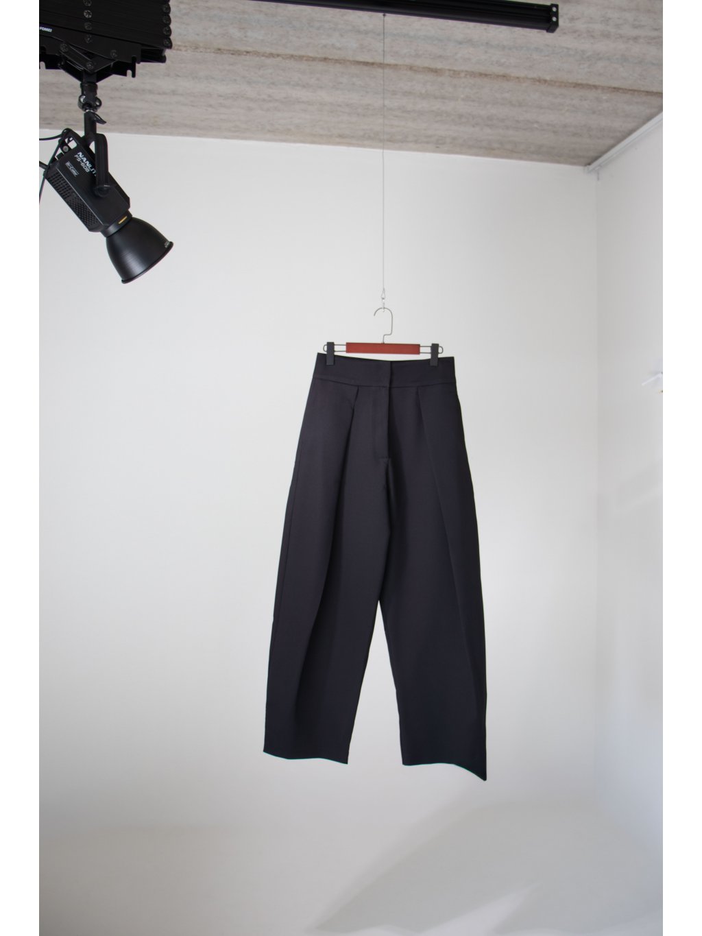 Kalhoty balonového střihu, vpředu výrazné sklady, boční kapsy, vysoký zúžený pas, zapínání na zip, knoflík a dva háčky. Materiál krásně drží tvar.