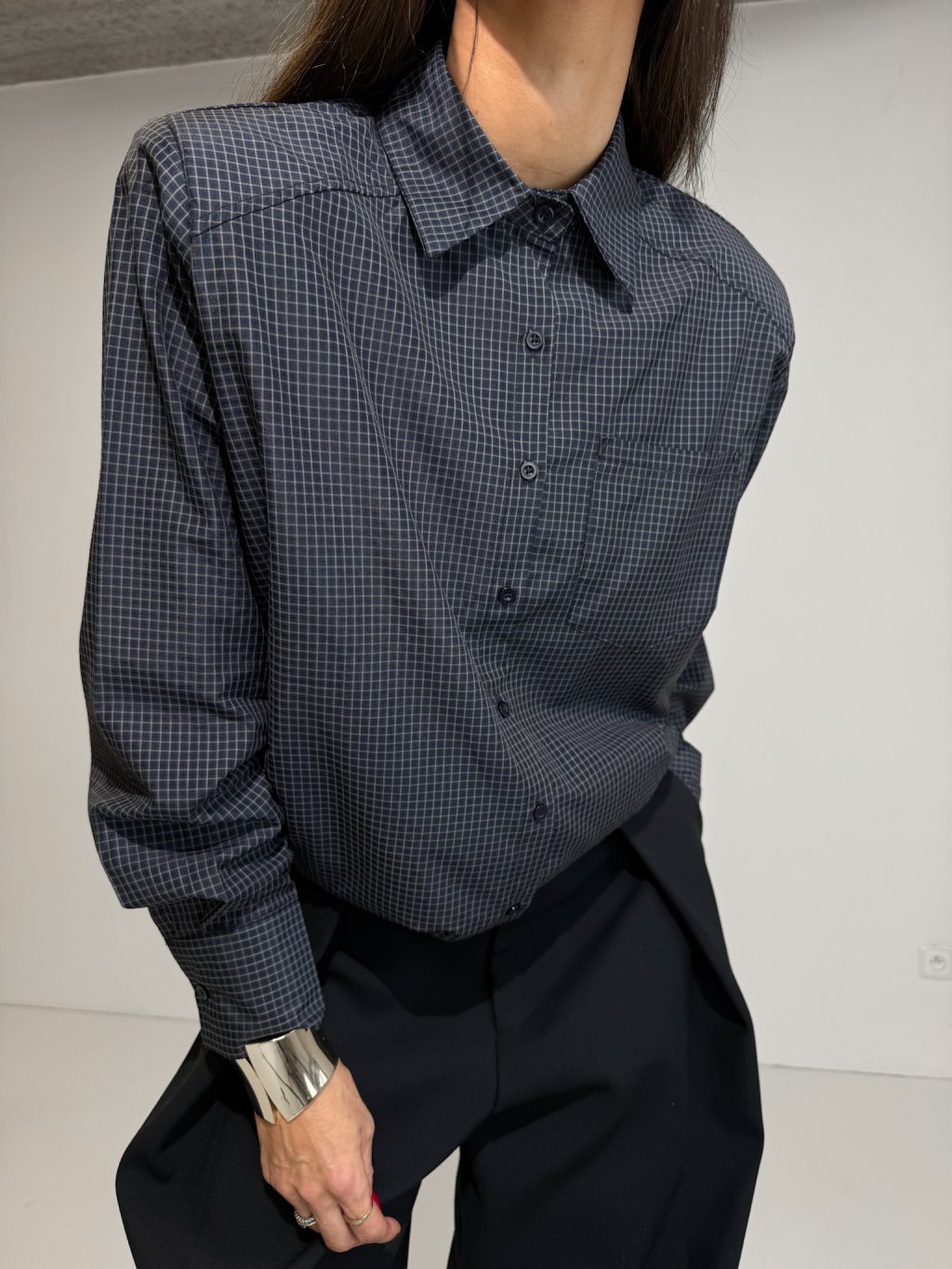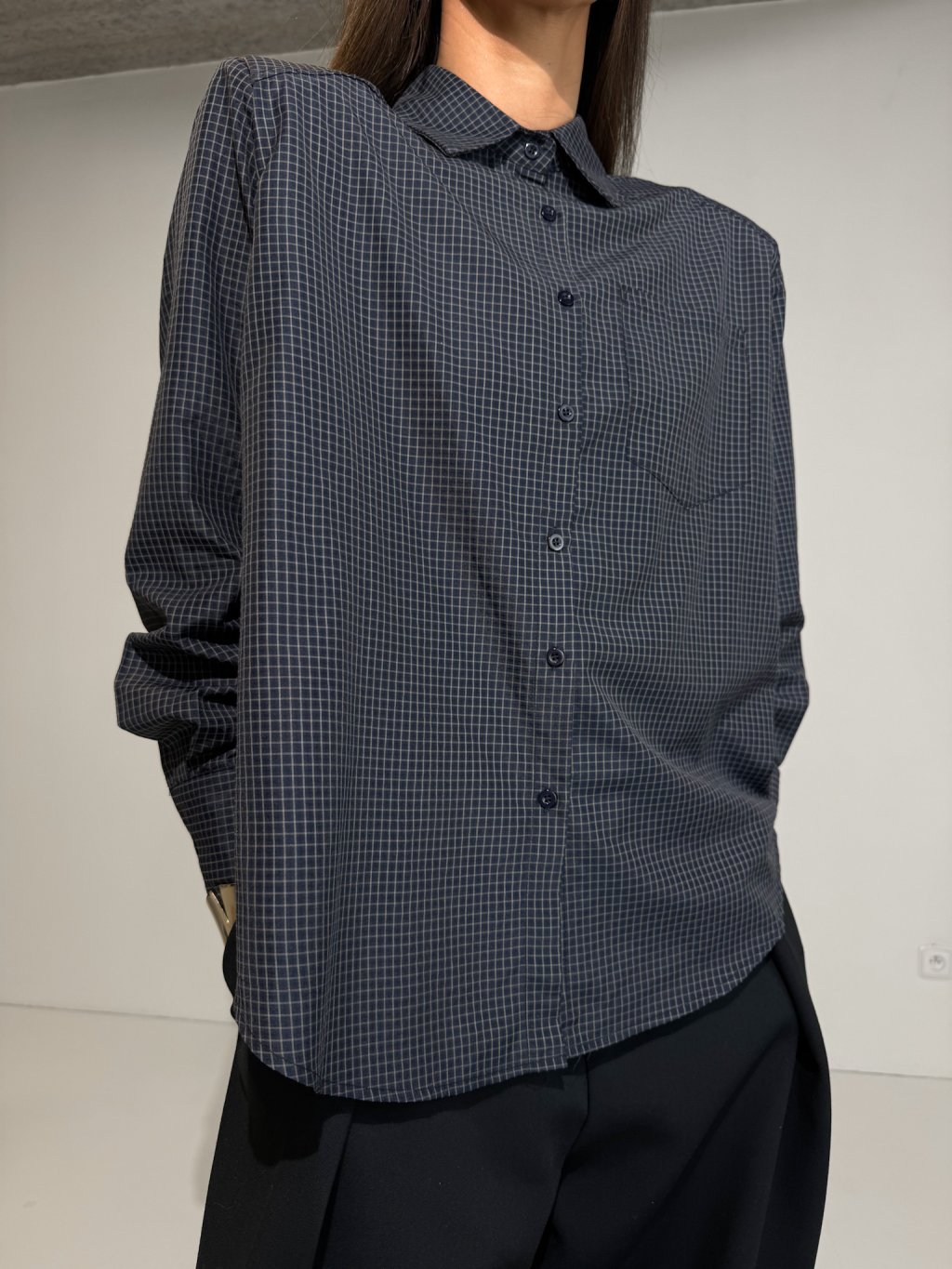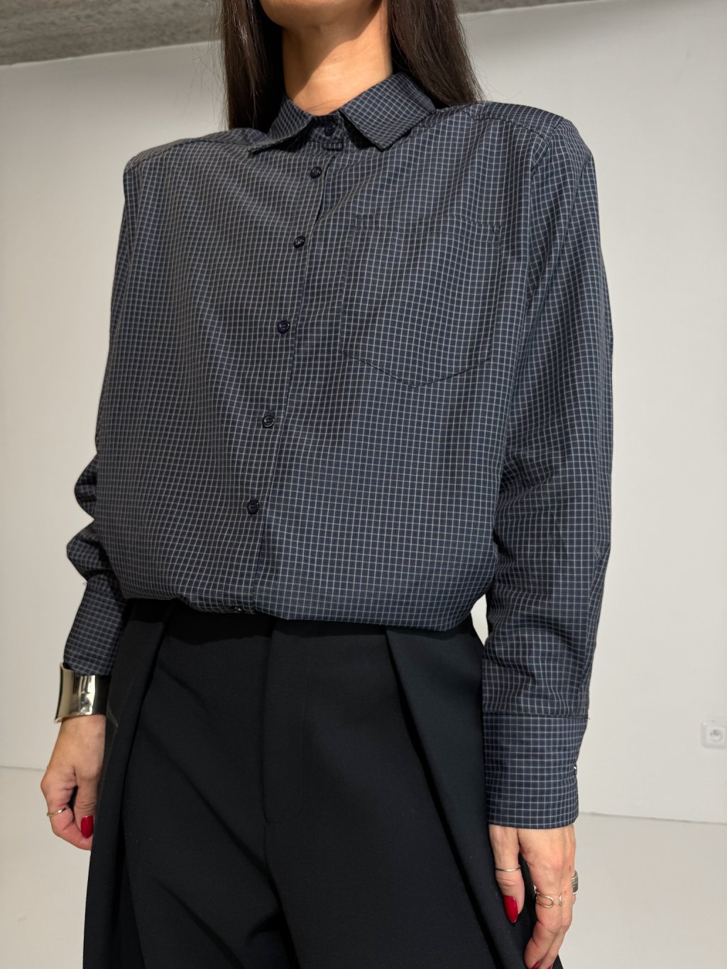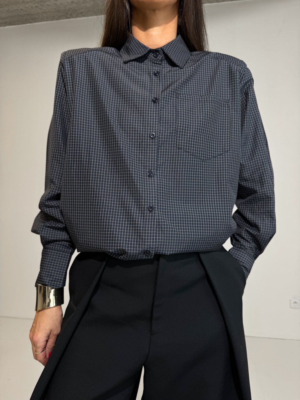 Košile s jemným károvaným vzorem, široký střih, ramenní vycpávky, dlouhý rukáv ukončený manžetou s knoflíkem, celopropínací na knoflíky v tmavě modré barvě, náprsní kapsa.