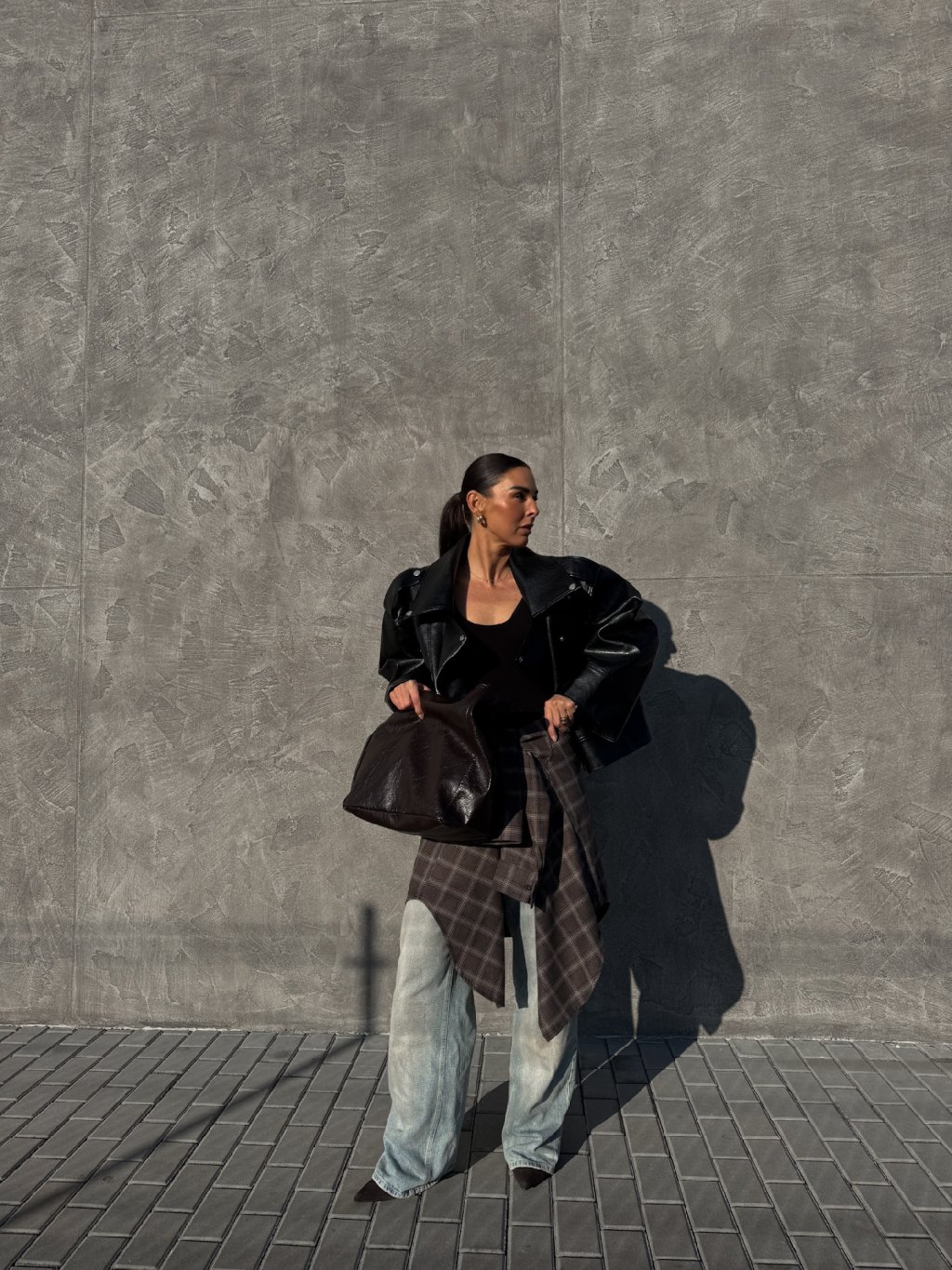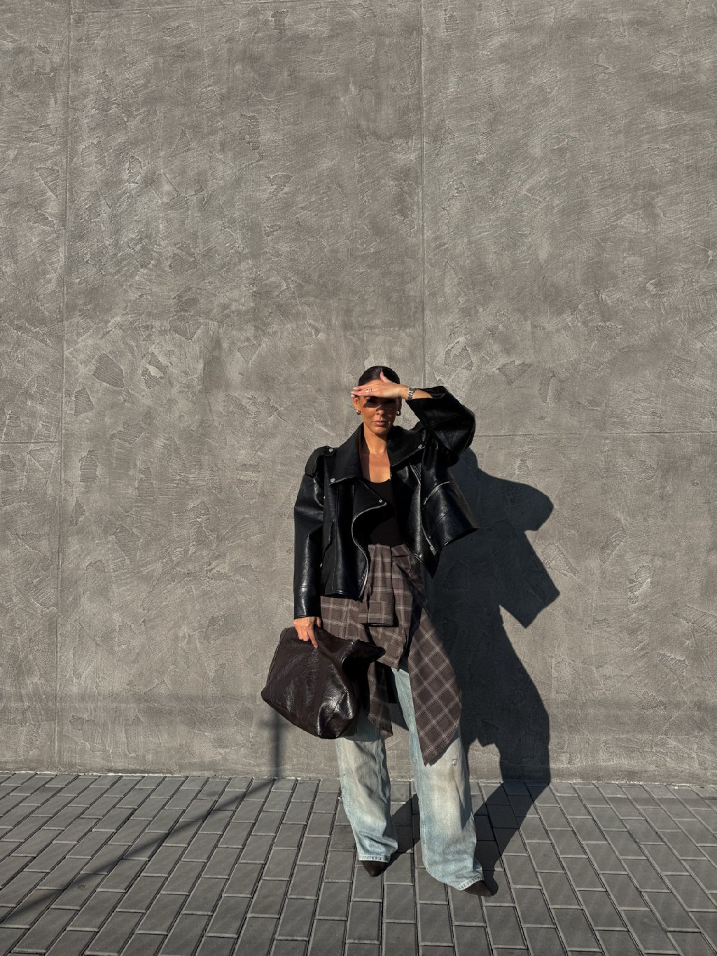 | Modelka měří 173 cm, váha 56 kg. Běžně nosí velikost S/M a oversized oblečení L. |