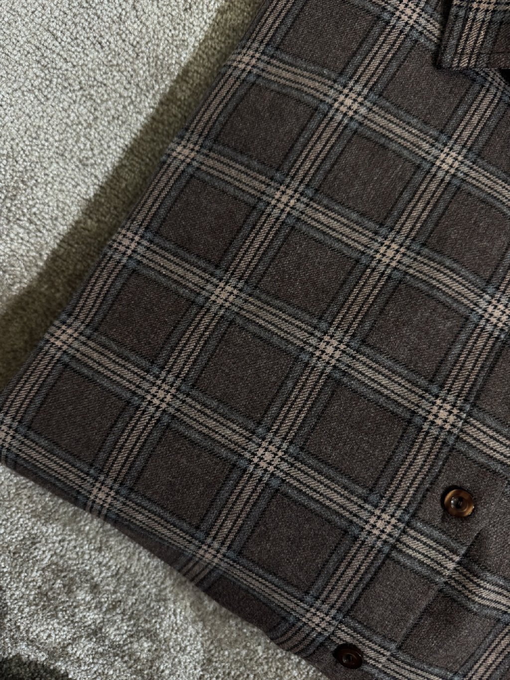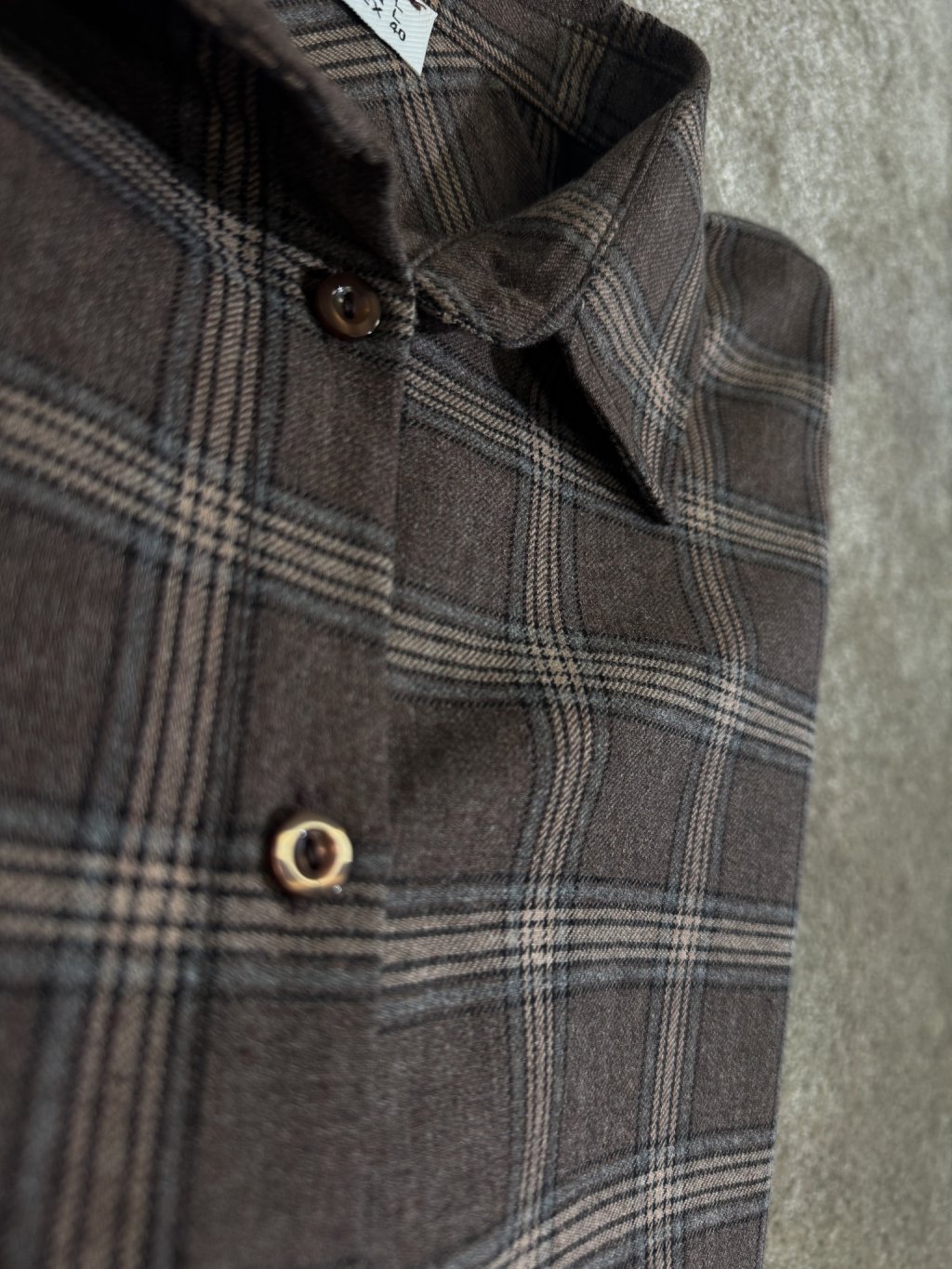 Bavlněná košile s károvaným vzorem, široký střih, dlouhý spadený rukáv ukončený manžetou s knoflíkem, celopropínací na knoflíky v hnědé barvě, zadní díl košile je delší.